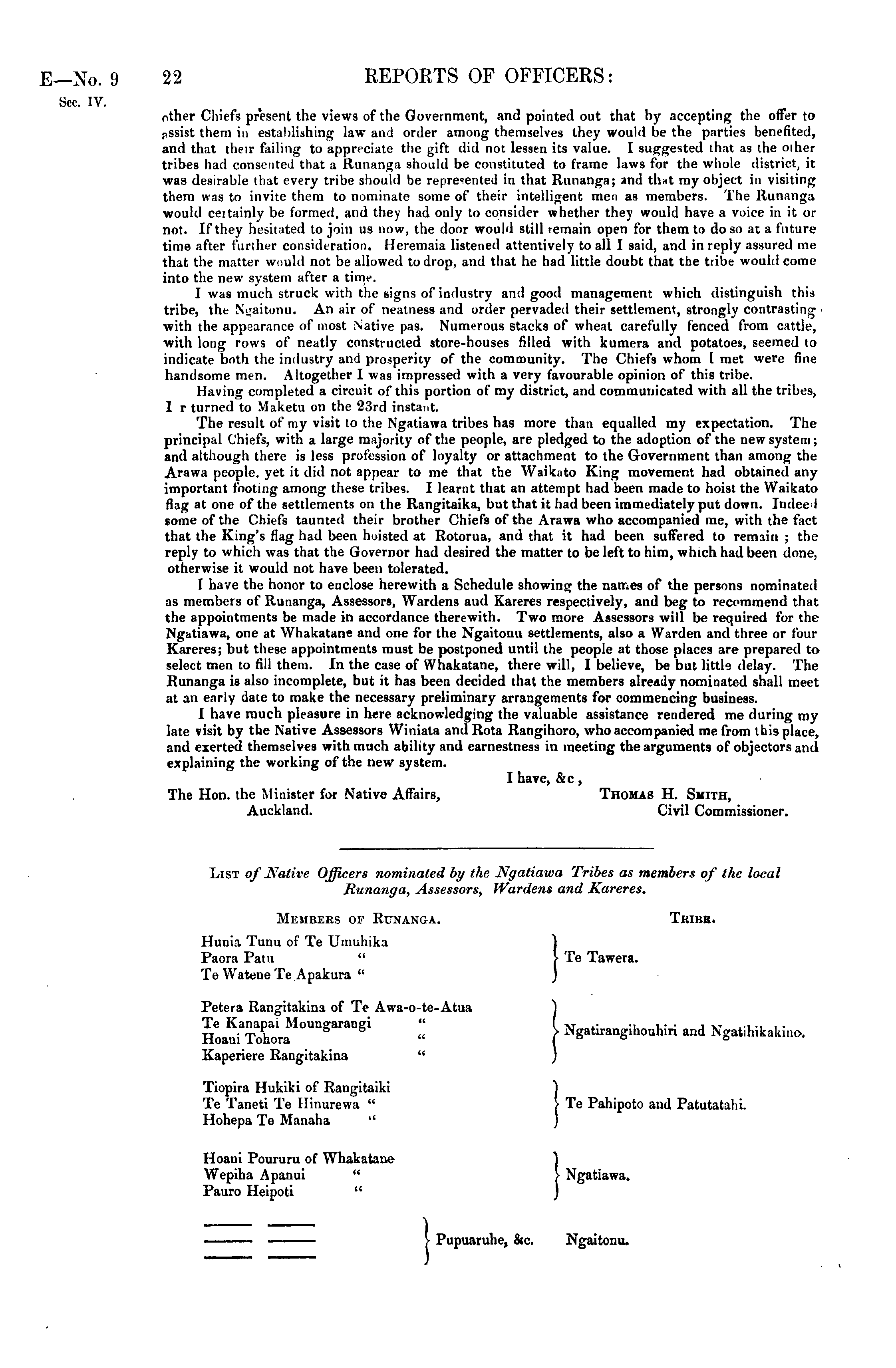 other Chiefs present the views of the Government, and pointed out that by accepting the offer to pssist them in establishing law and order among themselves they would be the parties benefited, and that their failing to appreciate the gift did not lessen its value. I suggested that as the oiher tribes had consented that a Runanga should be constituted to frame laws for the whole district, it was desirable that every tribe should be represented in that Runanga; and thnt my object in visiting them was to invite them to nominate some of their intelligent men as members. The Runanga would ceitainly be formed, and they had only to consider whether they would have a voice in it or not. If they hesitated to join us now, the door would still remain open for them to do so at a future time after further consideration. Heremaia listened attentively to all I said, and in reply assured me that the matter would not be allowed to drop, and that he had little doubt that the tribe would come into the new system after a time. I was much struck with the signs of industry and good management which distinguish this tribe, the Ngaitonu. An air of neatness and order pervaded their settlement, strongly contrasting i with the appearance of most Native pas. Numerous stacks of wheat carefully fenced from cattle, with long rows of neatly constructed store-houses filled with kumera and potatoes, seemed to indicate both the industry and prosperity of the community. The Chiefs whom I met were fine handsome men. Altogether I was impressed with a very favourable opinion of this tribe. Having completed a circuit of this portion of my district, and communicated with all the tribes, I r turned to Maketu on the 23rd instant. The result of my visit to the Ngatiawa tribes has more than equalled my expectation. The principal Chiefs, with a large majority of the people, are pledged to the adoption of the new system; and although there is less profession of loyalty or attachment to the Government than among the Arawa people, yet it did not appear to me that the Waikato King movement had obtained any important footing among these tribes. I learnt that an attempt had been made to hoist the Waikato flag at one of the settlements on the Rangitaika, but that it had been immediately put down. Indeed some of the Chiefs taunted their brother Chiefs of the Arawa who accompanied me, with the fact that the King's flag had been hoisted at Rotorua, and that it had been suffered to remain ; the reply to which was that the Governor had desired the matter to be left to him, which had been done, otherwise it would not have been tolerated. I have the honor to enclose herewith a Schedule showing the names of the persons nominated as members of Runanga, Assessors, Wardens aud Kareres respectively, and beg to recommend that the appointments be made in accordance therewith. Two more Assessors will be required for the Ngatiawa, one at Whakatane and one for the Ngaitonu settlements, also a Warden and three or four Kareres; but these appointments must be postponed until the people at those places are prepared to select men to fill them. In the case of Whakatane, there will, I believe, be but little delay. The Runanga is also incomplete, but it has been decided that the members already nominated shall meet at an early date to make the necessary preliminary arrangements for commencing business. I have much pleasure in here acknowledging the valuable assistance rendered me during my late visit by the Native Assessors Winiala and Rota Rangihoro, who accompanied me from this place, and exerted themselves with much ability and earnestness in meeting the arguments of objectors and explaining the working of the new system. I have, &c, The Hon. the Minister for Native Affairs, Thomas H. Smith, Auckland. Civil Commissioner.