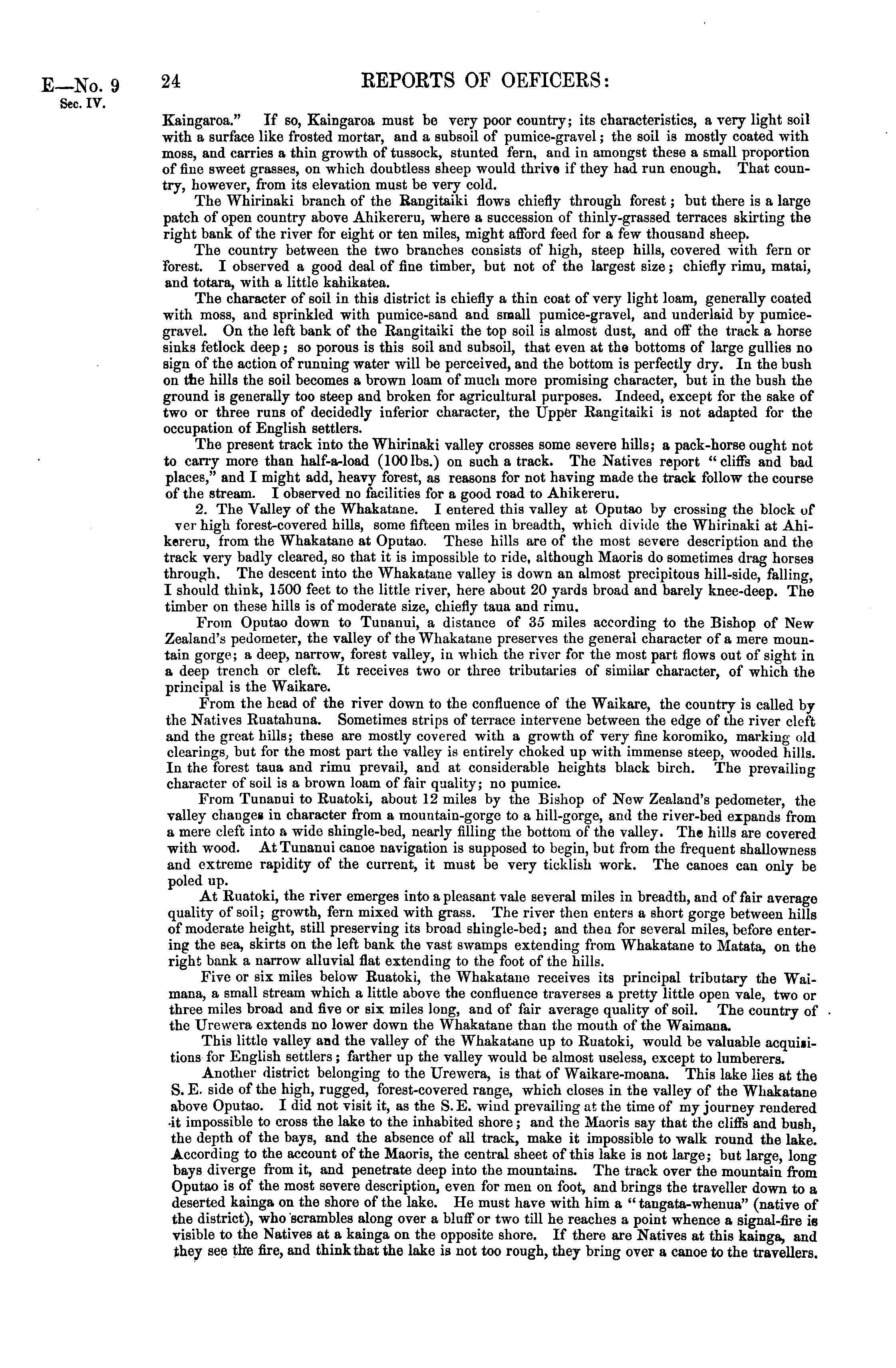 Kaingaroa." If so, Kaingaroa must be very poor country; its characteristics, a very light soil with a surface like frosted mortar, and a subsoil of pumice-gravel; the soil is mostly coated with moss, and carries a thin growth of tussock, stunted fern, and in amongst these a small proportion of fine sweet grasses, on which doubtless sheep would thrive if they had run enough. That country, however, from its elevation must be very cold. The Whirinaki branch of the Rangitaiki flows chiefly through forest; but there is a large patch of open country above Ahikereru, where a succession of thinly-grassed terraces skirting the right bank of the river for eight or ten miles, might afford feed for a few thousand sheep. The country between the two branches consists of high, steep hills, covered with fern or forest. I observed a good deal of fine timber, but not of the largest size; chiefly rimu, matai, and totara, with a little kahikatea. The character of soil in this district is chiefly a thin coat of very light loam, generally coated with moss, and sprinkled with pumice-sand and small pumice-gravel, and underlaid by pumicegravel. On the left bank of the Rangitaiki the top soil is almost dust, and off the track a horse sinks fetlock deep; so porous is this soil and subsoil, that even at the bottoms of large gullies no sign of the action of running water will be perceived, and the bottom is perfectly dry. In the bush on tbe hills the soil becomes a brown loam of much more promising character, but in the bush the ground is generally too steep and broken for agricultural purposes. Indeed, except for the sake of two or three runs of decidedly iuferior character, the Upper Rangitaiki is not adapted for the occupation of English settlers. The present track into the Whirinaki valley crosses some severe hills; a pack-horse ought not to carry more than half-a-load (100lbs.) on such a track. The Natives report "cliffs and bad places," and I might add, heavy forest, as reasons for not having made the track follow the course of the stream. I observed no facilities for a good road to Ahikereru. 2. The Valley of the Whakatane. I entered this valley at Oputao by crossing the block of ver high forest-covered hills, some fifteen miles in breadth, which divide the Whirinaki at Ahikereru, from the Whakatane at Oputao. These hills are of the most severe description and the track very badly cleared, so that it is impossible to ride, although Maoris do sometimes drag horses through. The descent into the Whakatane valley is down an almost precipitous hill-side, falling, I should think, 1500 feet to the little river, here about 20 yards broad and barely knee-deep. The timber on these hills is of moderate size, chiefly taua and rimu. From Oputao down to Tunanui, a distance of 35 miles according to the Bishop of New Zealand's pedometer, the valley of the Whakatane preserves the general character of a mere mountain gorge; a deep, narrow, forest valley, in which the river for the most part flows out of sight in a deep trench or cleft. It receives two or three tributaries of similar character, of which the principal is the Waikare. From the head of the river down to the confluence of the Waikare, the country is called by the Natives Euatahuna. Sometimes strips of terrace intervene between the edge of the river cleft and the great hills; these are mostly covered with a growth of very fine koromiko, marking did clearings, but for the most part the valley is entirely choked up with immense steep, wooded hills. In the forest taua and rimu prevail, and at considerable heights black birch. The prevailing character of soil is a brown loam of fair quality; no pumice. From Tuuanui to Ruatoki, about 12 miles by the Bishop of New Zealand's pedometer, the valley changes in character from a mountain-gorge to a hill-gorge, and the river-bed expands from a mere cleft into a wide shingle-bed, nearly filling the bottom of the valley. The hills are covered with wood. At Tunanui canoe navigation is supposed to begin, but from the frequent shallowness and extreme rapidity of the current, it must be very ticklish work. The canoes can only be poled up. At ltuatoki, the river emerges into a pleasant vale several miles in breadth, and of fair average quality of soil; growth, fern mixed with grass. The river then enters a short gorge between hills of moderate height, still preserving its broad shingle-bed; and thea for several miles, before entering the sea, skirts on the left bank the vast swamps extending from Whakatane to Matata, on the right bank a narrow alluvial flat extending to the foot of the hills. Five or six miles below Ruatoki, the Whakatane receives its principal tributary the Waimana, a small stream which a little above the confluence traverses a pretty little open vale, two or three miles broad and five or six miles long, and of fair average quality of soil. The country of the Urewera extends no lower down the Whakatane than the mouth of the Waimana. This little valley and the valley of the Whakatano up to Ruatoki, would be valuable acquisitions for English settlers; farther up the valley would be almost useless, except to lumberers. Another district belonging to the Urewera, is that of Waikare-moana. This lake lies at the S. E. side of the high, rugged, forest-covered range, which closes in the valley of the Whakatane above Oputao. I did not visit it, as the S. E. wind prevailing at the time of my journey rendered •it impossible to cross the lake to the inhabited shore; and the Maoris say that the cliffs and bush, the depth of the bays, and the absence of all track, make it impossible to walk round the lake. According to the account of the Maoris, the central sheet of this lake is not large; but large, long bays diverge from it, and penetrate deep into the mountains. The track over the mountain from Oputao is of the most severe description, even for men on foot, and brings the traveller down to a deserted kainga on the shore of the 