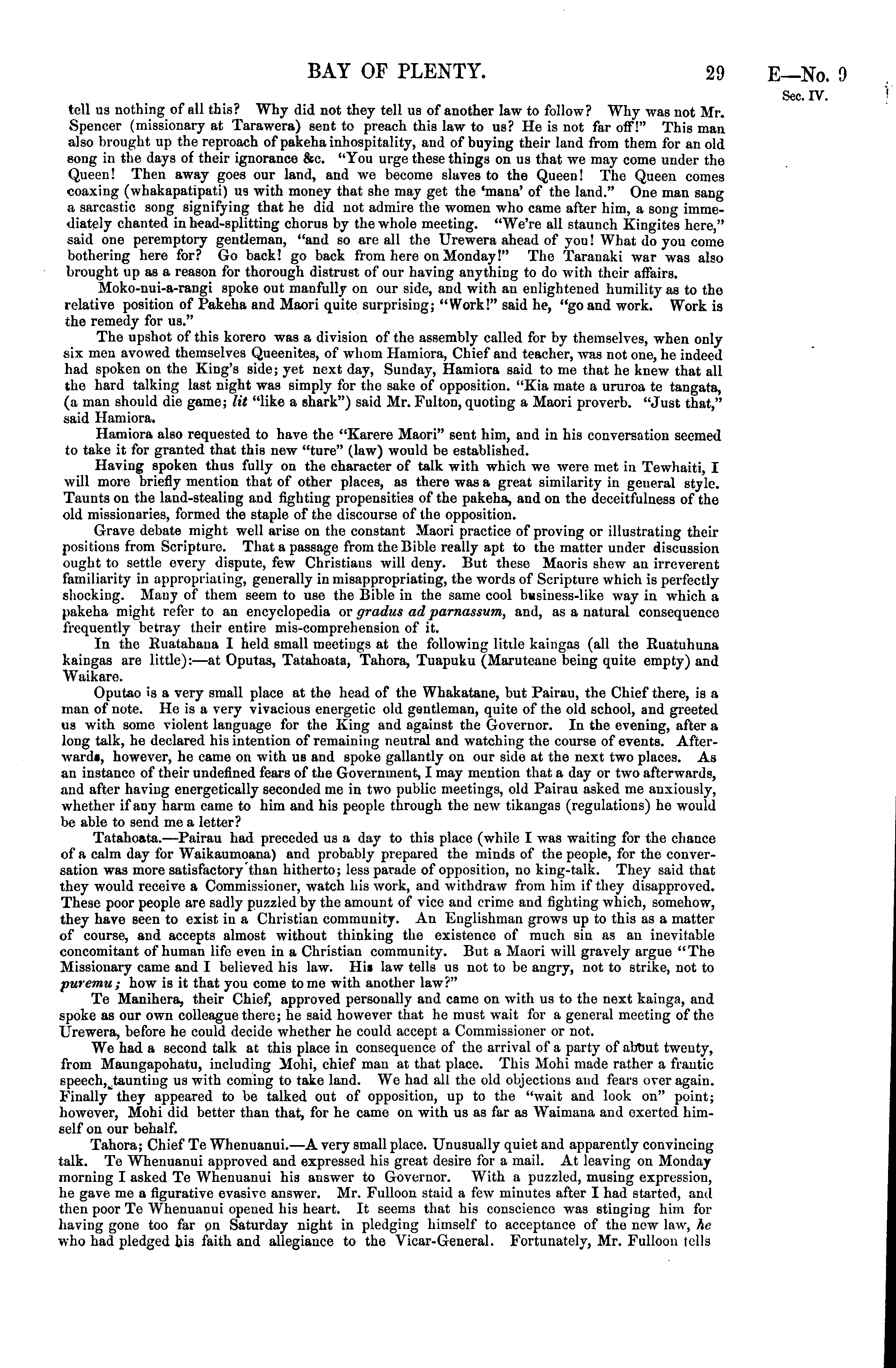 tell us nothing of all this? Why did not they tell us of another law to follow? Why was not Mr. Spencer (missionary at Tarawera) sent to preach this law to us? He is not far off!" This man also brought up the reproach of pakeha inhospitality, and of buying their land from them for an old song in the days of their ignorance &c. "You urge these things on us that we may come under the Queen! Then away goes our land, and we become slaves to the Queen! The Queen conies coaxing (whakapatipati) us with money that she may get the 'mana' of the land." One man sang a sarcastic song signifying that he did not admire the women who came after him, a song immediately chanted in head-splitting chorus by the whole meeting. "We're all staunch Kingites here," said ono peremptory gentleman, "and so are all the Urewera ahead of you! What do you come bothering here for? Go back! go back from here on Monday!" The Taranaki war was also brought up as a reason for thorough distrust of our having anything to do with their affairs. Moko-nui-a-rangi spoke out manfully on our side, and with an enlightened humility as to the relative position of Pakeha and Maori quite surprising; "Work!" said he, "go and work. Work is the remedy for us." The upshot of this korero was a division of the assembly called for by themselves, when only six men avowed themselves Queenites, of whom Hamiora, Chief and teacher, was not one, he indeed had spoken on the King's side; yet next day, Sunday, Hamiora said to me that he knew that all the hard talking last night was simply for the sake of opposition. "Kia mate a ururoa te tangata, (a man should die game; lit "like a shark") said Mr. Fulton, quoting a Maori proverb. "Just that," said Hamiora. Hamiora also requested to have the "Karere Maori" sent him, and in his conversation seemed to take it for granted that this new "ture" (law) would be established. Having spoken thus fully on the character of talk with which we were met in Tewhaiti, I will more briefly mention that of other places, as there was a great similarity in general style. Taunts on the land-stealing and fighting propensities of the pakeha, and on the deceitfulness of the old missionaries, formed the staple of the discourse of the opposition. Grave debate might well arise on the constant Maori practice of proving or illustrating their positions from Scripture. That a passage from the Bible really apt to the matter under discussion ought to settle every dispute, few Christians will deny. But these Maoris shew an irreverent familiarity in appropriating, generally in misappropriating, the words of Scripture which is perfectly shocking. Many of them seem to use the Bible in the same cool business-like way in which a pakeha might refer to an encyclopedia or gradus ad parnassum, and, as a natural consequence frequently betray their entire mis-comprehension of it. la the Ruatahana I held small meetings at the following little kaingas (all the Ruatuhuna kaingas are little): —at Oputas, Tatahoata, Tahora, Tuapuku (Maruteane being quite empty) and Waikare. Oputao is a very small place at the head of the Whakatane, but Pairau, the Chief there, is a man of note. He is a very vivacious energetic old gentleman, quite of the old school, and greeted us with some violent language for the King and against the Governor. In the evening, after a long talk, he declared his intention of remaining neutral and watching the course of events. Afterwardi, however, he came on with us and spoke gallantly on our side at the next two places. As an instance of their undefined fears of the Government, I may mention that a day or two afterwards, and after having energetically seconded me in two public meetings, old Pairau asked me anxiously, whether if any harm came to him and his people through the new tikangas (regulations) he would be able to send me a letter? Tatahoata. —Pairau had preceded us a day to this place (while I was waiting for the chance of a calm day for Waikaumoana) and probably prepared the minds of the people, for the conversation was more satisfactory than hitherto; less parade of opposition, no king-talk. They said that they would receive a Commissioner, watch his work, and withdraw from him if they disapproved. These poor people are sadly puzzled by the amount of vice and crime and fighting which, somehow, they have seen to exist in a Christian community. An Englishman grows up to this as a matter of course, and accepts almost without thinking the existence of much siu as an inevitable concomitant of human life even in a Christian community. But a Maori will gravely argue "The Missionary came and I believed his law. His law tells us not to be angry, not to strike, not to pur emu ; how is it that you come tome with another law?" Te Manihera, their Chief, approved personally and came on with us to the next kainga, and spoke as our own colleague there; he said however that he must wait for a general meeting of the Urewera, before he could decide whether he could accept a Commissioner or not. We had a second talk at this place in consequence of the arrival of a party of abtrat twenty, from Maungapohatu, including Mohi, chief man at that place. This Mohi made rather a frantic speech, taunting us with coming to take land. We had all the old objections and fears over again. Finally they appeared to be talked out of opposition, up to the "wait and look on" point; however, Mohi did better than that, for he came on with us as far as Waimana and exerted himself on our behalf. Tahora; Chief Te Whenuanui.—A very small place. Unusually quiet and apparently convincing talk. Te Whenuanui approved and expressed his great desire for a mail. At leaving on Monday morning I asked Te Whenuanui his answer to Governor. With a puzzled, musing expression, he gave me a figurative evasive answer. Mr. Fulloon staid a few minutes after I had started, and then poor Te Whenuanui opened his heart. It seems that his conscience was stinging him for having gone too fa