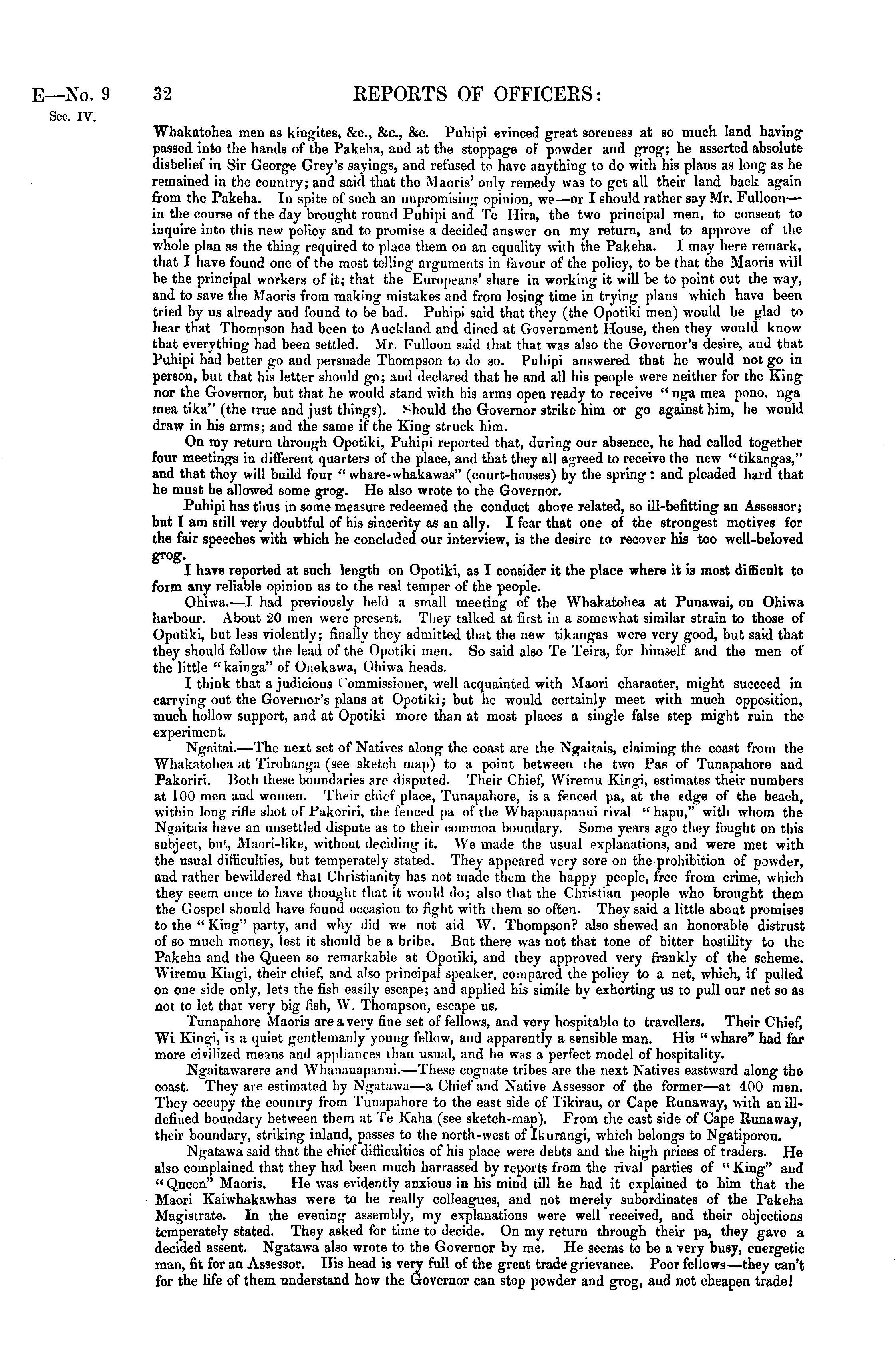 Whakatohea men as kingites, &c, &c, &c. Puhipi evinced great soreness at so much land having passed into the hands of the Pakeha, and at the stoppage of powder and grog; he asserted absolute disbelief in Sir George Grey's sayings, and refused to have anything to do with his plans as long as he remained in the country; and said that the Maoris' only remedy was to get all their land back again from the Pakeha. In spite of such an unpromising opinion, we —-or I should rather say Mr. Fulloon— in the course of the day brought round Puhipi and Te Hira, the two principal men, to consent to inquire into this new policy and to promise a decided answer on my return, and to approve of the whole plan as the thing required to place them on an equality with the Pakeha. I may here remark, that I have found one of the most telling arguments in favour of the policy, to be that the Maoris will he the principal workers of it; that the Europeans' share in working it will be to point out the way, and to save the Maoris from making mistakes and from losing time in trying plans which have been tried by us already and found to be bad. Puhipi said that they (the Opotiki men) would be glad to hear that Thompson had been to Auckland and dined at Government House, then they would know that everything had been settled. Mr. Fulloon said that that was also the Governor's desire, and that Puhipi had better go and persuade Thompson to do so. Puhipi answered that he would not go in person, but that his letter should go; and declared that he and all his people were neither for the King nor the Governor, but that he would stand with his arms open ready to receive " nga mea pono, nga mea tika" (the true and just things). Should the Governor strike him or go against him, he would draw in his arms; and the same if the King struck him. On my return through Opotiki, Puhipi reported that, during our absence, he had called together four meetings in different quarters of the place, and that they all agreed to receive the new "tikangas," and that they will build four " whare-whakawas" (court-houses) by the spring : and pleaded hard that he must be allowed some grog. He also wrote to the Governor. Puhipi has thus in some measure redeemed the couduct above related, so ill-befitting an Assessor; but I am still very doubtful of his sincerity as an ally. I fear that one of the strongest motives for the fair speeches with which he concluded our interview, is the desire to recover his too well-beloved grogI have reported at such length on Opotiki, as I consider it the place where it is most difficult to form any reliable opinion as to the real temper of the people. Ohiwa. —I had previously held a small meeting of the Whakatohea at Punawai, on Ohiwa harbour. About 20 men were present. They talked at first in a somewhat similar strain to those of Opotiki, but less violently; finally they admitted that the new tikangas were very good, but said that they should follow the lead of the Opotiki men. So said also Te Teira, for himself and the men of the little "kainga" of Onekawa, Ohiwa heads. I think that a judicious t'ommissioner, well acquainted with Maori character, might succeed in carrying out the Governor's plans at Opotiki; but he would certainly meet with much opposition, much hollow support, and at Opotiki more than at most places a single false step might ruin the experiment. Ngaitai.—The next set of Natives along the coast are the Ngaitais, claiming the coast from the Whakatohea at Tirohanga (see sketch map) to a point between the two Pas of Tunapahore and Pakoriri. Both these boundaries are disputed. Their Chief, Wiremu Kingi, estimates their numbers at 100 men and women. Their chief place, Tunapahore, is a fenced pa, at the edge of the beach, within long rifle shot of Pakoriri, the fenced pa of the Whapauapanui rival " hapu," with whom the Ngaitais have an unsettled dispute as to their common boundary. Some years ago they fought on this subject, bu', Maori-like, without deciding it. We made the usual explanations, and were met with the usual difficulties, but temperately stated. They appeared very sore on the prohibition of powder, and rather bewildered that Christianity has not made them the happy people, free from crime, which they seem once to have thought that it would do; also that the Christian people who brought them the Gospel should have found occasion to fight with them so often. They said a little about promises to the " King" party, and why did we not aid W. Thompson? also shewed an honorable distrust of so much money, lest it should be a bribe. But there was not that tone of bitter hostility to the Pakeha and the Queen so remarkable at Opotiki, and they approved very frankly of the scheme. Wiremu Kingi, their chief, and also principal speaker, compared the policy to a net, which, if pulled on one side only, lets the fish easily escape; and applied his simile by exhorting us to pull our net so as not to let that very big (ish, W. Thompson, escape us. Tunapahore Maoris are a very fine set of fellows, and very hospitable to travellers. Their Chief, Wi Kingi, is a quiet gentlemanly young fellow, and apparently a sensible man. His " whare" had far more civilized means and appliances thau usual, and he was a perfect model of hospitality. Ngaitawarere and Whanauapanui.—These cognate tribes are the next Natives eastward along the coast. They are estimated by Ngatawa—a Chief and Native Assessor of the former—at 400 men. They occupy the country from Tunapahore to the east side of Tikirau, or Cape Runaway, with an illdefined boundary between them at Te Kaha (see sketch-map). From the east side of Cape Runaway, their boundary, striking inland, passes to the north-west of Ikurangi, which belongs to Ngatiporou. Ngatawa said that the chief difficulties of his place were debts and the high prices of traders. He also complained that they had been much harrassed by reports from the rival parties of " King" and " Queen" Maor