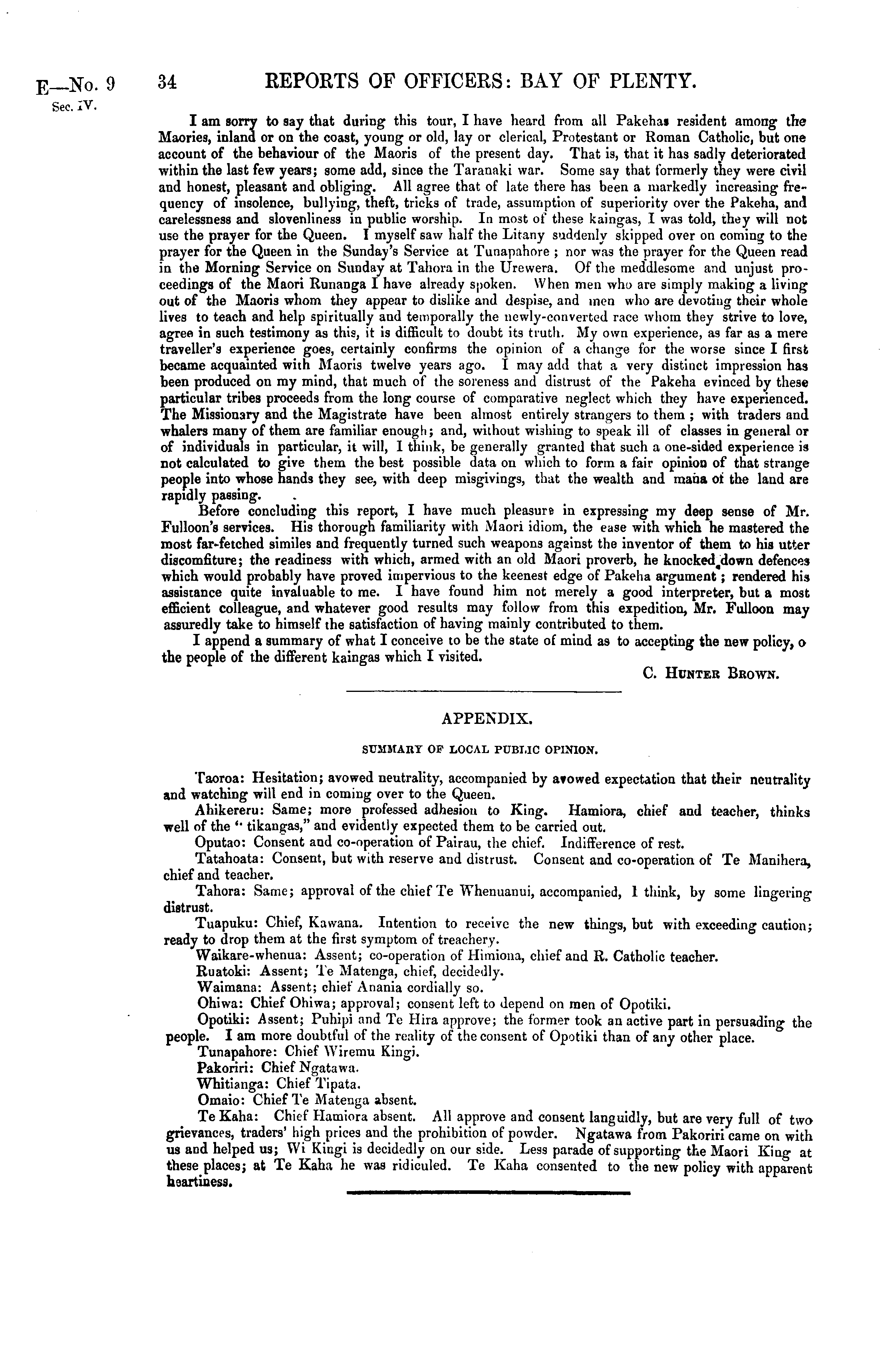 APPENDIX. SUMMARY OP LOCAL PUBLIC OPINION. Taoroa: Hesitation; avowed neutrality, accompanied by avowed expectation that their neutrality and watching will end in coming over to the Queen. Ahikereru: Same; more professed adhesion to King. Hamiora, chief and teacher, thinks well of the " tikangas," and evidently expected them to be carried out. Oputao: Consent and co-operation of Pairau, the chief. Indifference of rest. Tatahoata: Consent, but with reserve and distrust. Consent and co-operation of Te Manihera, chief and teacher. Tahora: Same; approval of the chief Te Whenuanui, accompanied, 1 think, by some lingering distrust. Tuapuku: Chief, Kawana. Intention to receive the new things, but with exceeding caution; ready to drop them at the first symptom of treachery. Waikare-whenua: Assent; co-operation of Himiona, chief and R. Catholic teacher. Ruatoki: Assent; Te Matenga, chief, decidedly. Waimana: Assent; chief Anania cordially so. Ohiwa: Chief Ohiwa; approval; consent left to depend on men of Opotiki. Opotiki: Assent; Puhipi and Te Hira approve; the former took an active part in persuading the people. I am more doubtful of the reality of the consent of Opotiki than of any other place. Tunapahore: Chief Wiremu Kingi. Pakoriri: Chief Ngatawa. WTiitianga: Chief Tipata. Omaio: Chief Te Matenga absent. TeKaha: Chief Hamiora absent. All approve and consent languidly, but are very full of two grievances, traders' high prices and the prohibition of powder. Ngatawa from Pakoriri came on with us and helped us; Wi Kingi is decidedly on our side. Less parade of supporting the Maori King at these places; at Te Kaha he was ridiculed. Te Kaha consented to the new policy with apparent heartiness.