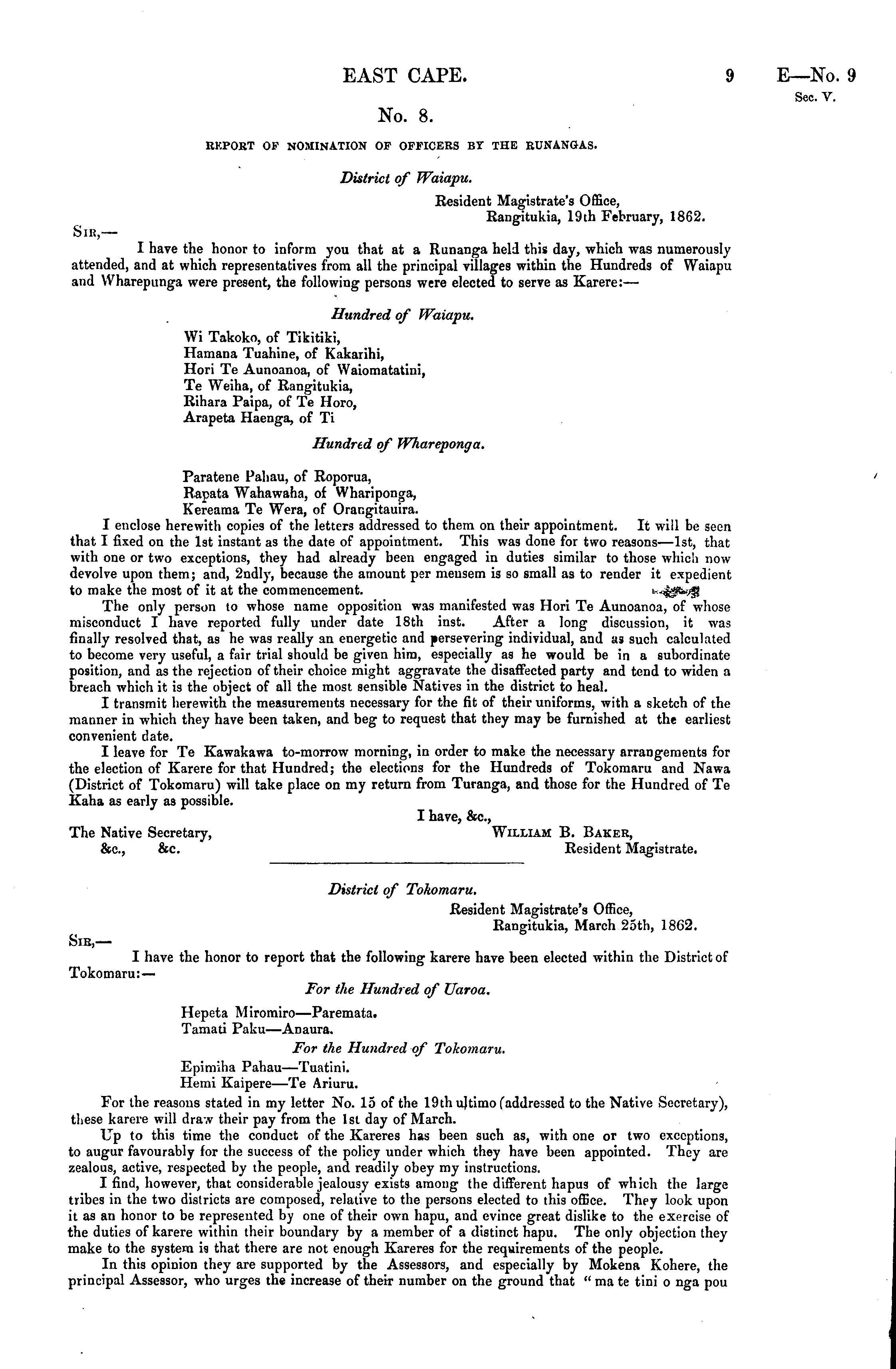 District of Tokomaru. Resident Magistrate's Office, Rangitukia, March 25th, 1862. Sir, — I have the honor to report that the following karere have been elected within the District of Tokomaru:— For the Hundred of Uaroa. Hepeta Miromiro—Paremata. Tamati Paku—Anaura. For the Hundred of Toltomaru. Epimiha Pahau—Tuatini. Henri Kaipere—Te Ariuru. For the reasons stated in my letter No. 15 of the 19th ultimo (addressed to the Native Secretary), these karere will draw their pay from the 1st day of March. Up to this time the conduct of the Kareres has been such as, with one or two exceptions, to augur favourably for the success of the policy under which they have been appointed. They are zealous, active, respected by the people, and readily obey my instructions. I find, however, that considerable jealousy exists among the different hapus of which the large tribes in the two districts are composed, relative to the persons elected to this office. They look upon it as an honor to be represented by one of their own hapu, and evince great dislike to the exercise of the duties of karere within their boundary by a member of a distinct hapu. The only objection they make to the system is that there are not enough Kareres for the requirements of the people. In this opinion they are supported by the Assessors, and especially by Mokena Kohere, the principal Assessor, who urges the increase of their number on the ground that " ma te tini o nga pou