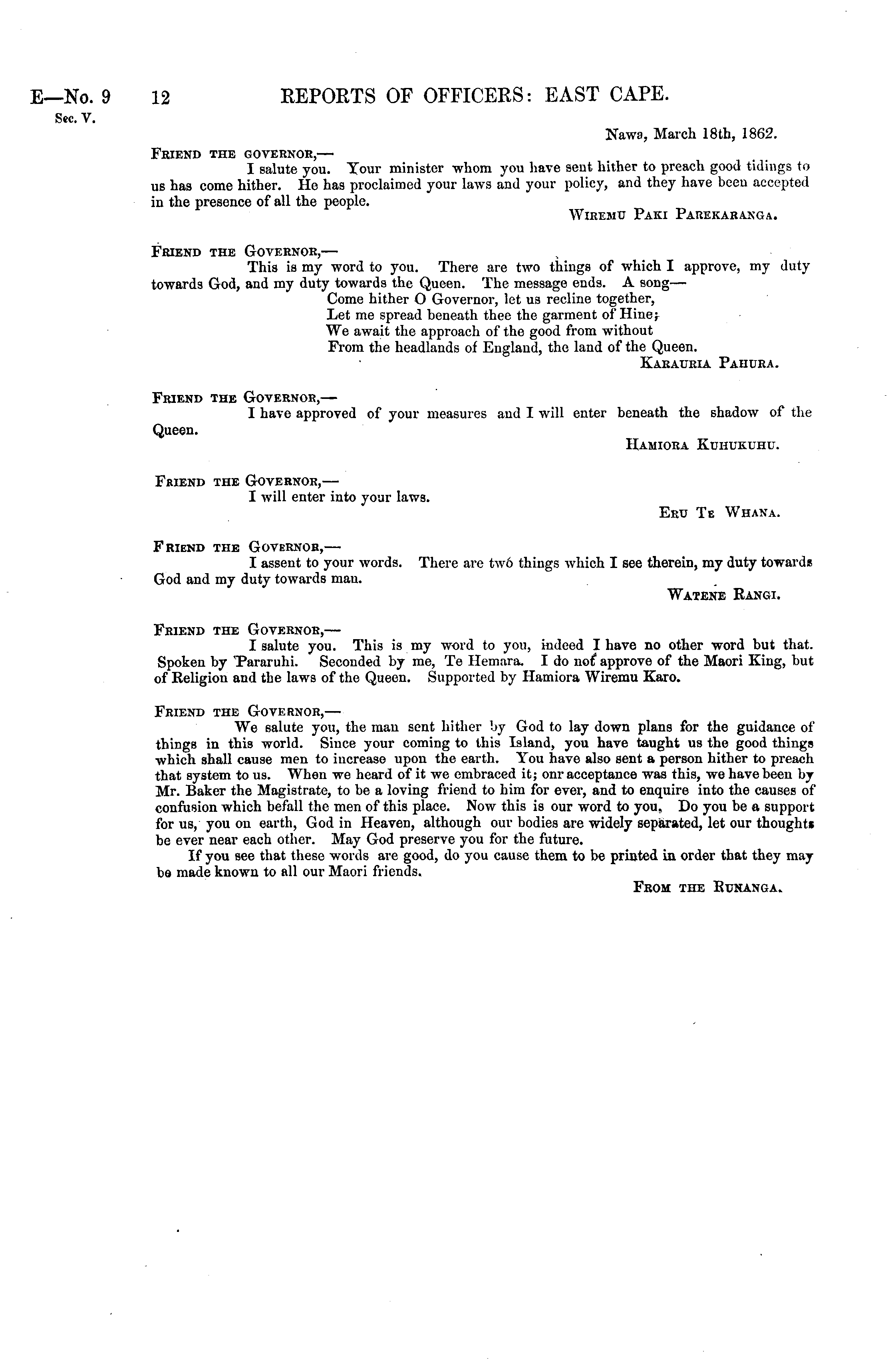 Nawa, March 18th, 1862. Friend the governor,— I salute you. Your minister whom you have seut hither to preach good tidings to us has come hither. He has proclaimed your laws and your policy, and they have been accepted in the presence of all the people. Wiremu Paki Pauekaranga. Friend the Governor, — This is my word to you. There are two things of which I approve, my duty towards God, and my duty towards the Queen. The message ends. A song— Come hither O Governor, let us recline together, Let me spread beneath thee the garment of Hine; We await the approach of the good from without From the headlands of England, the land of the Queen. Karauria Pahura. Friend the Governor, — I have approved of your measures aud I will enter beneath the shadow of the Queen. Hamiora Kuhukuhu. Friend the Governor, — I will enter into your laws. Eru Te Whana. Friend the Governor, — I assent to your words. There are tw6 things which I see therein, my duty towards God and my duty towards man. Watene Rangi. Friend the Governor, — I salute you. This is my word to you, indeed I have no other word but that. Spoken by Pararuhi. Seconded by me, Te Honiara. I do not approve of the Maori King, but of Religion and the laws of the Queen. Supported by Hamiora Wiremu Karo. Friend the Governor, — We salute you, the man sent hither by God to lay down plans for the guidance of things in this world. Since your coming to this Island, you have taught us the good things which shall cause men to increase upon the earth. You have also sent a person hither to preach that system to us. When we heard of it we embraced it; onr acceptance was this, we have been by Mr. Baker the Magistrate, to be a loving friend to him for ever, and to enquire into the causes of confusion which befall the men of this place. Now this is our word to you. Do you be a support for us, you on earth, God in Heaven, although our bodies are widely separated, let our thought* be ever near each other. May God preserve you for the future. If you see that these words are good, do you cause them to be printed in order that they may be made known to all our Maori friends. From the Runanga.