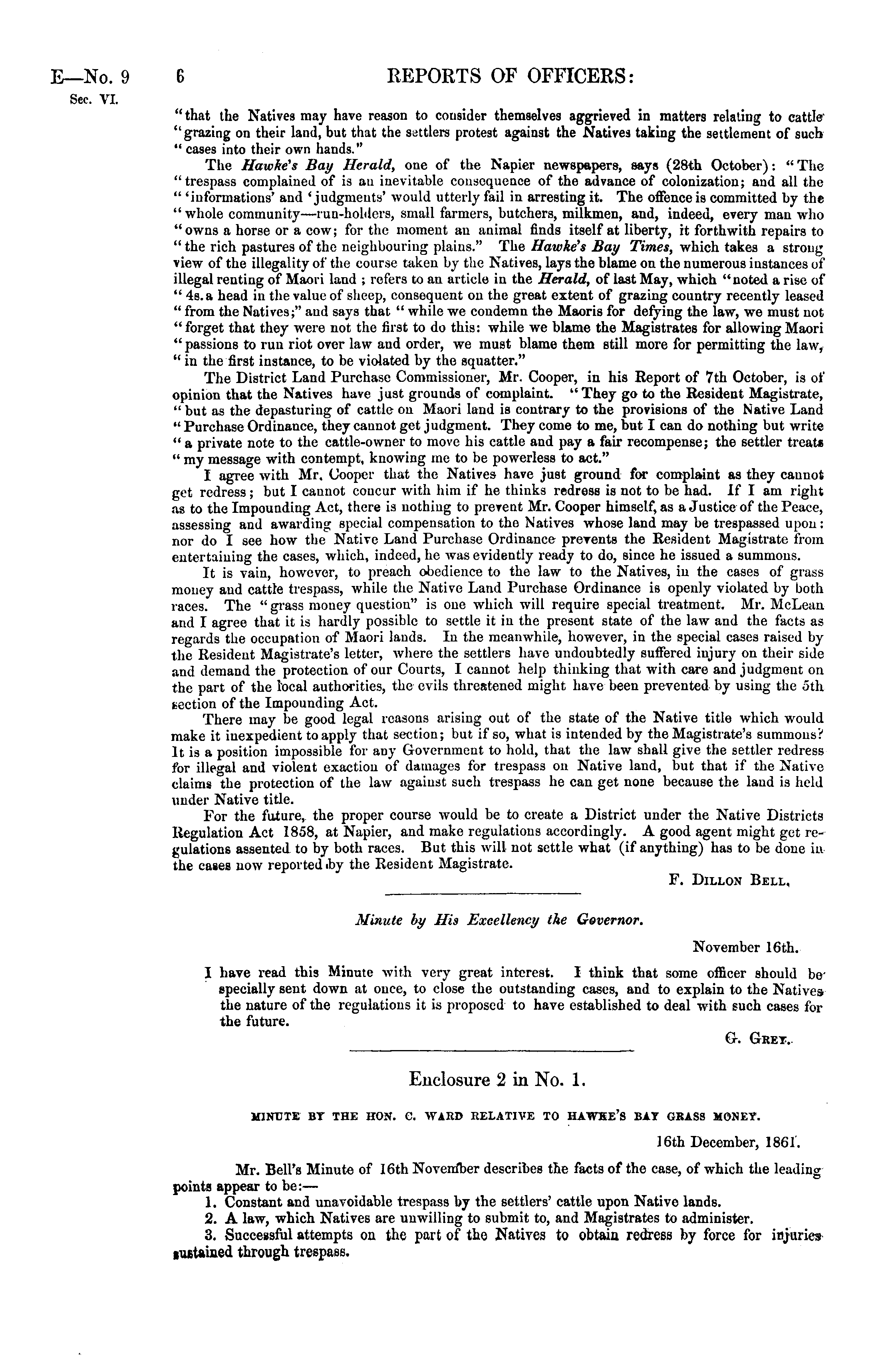 Enclosure 2 in No. 1. MINUTE BY THE HON. C. WARD RELATIVE TO HAWKE'S BAY GRASS MONEY. ] 6th December, 1861. Mr. Bell's Minute of 16th November describes the facts of the case, of which the leading points appear to be: — 1. Constant and unavoidable trespass by the settlers' cattle upon Native lands. 2. A law, which Natives are unwilling to submit to, and Magistrates to administer. 3. Successful attempts on the part of the Natives to obtain redress by force for injuries lUBtained through trespass.