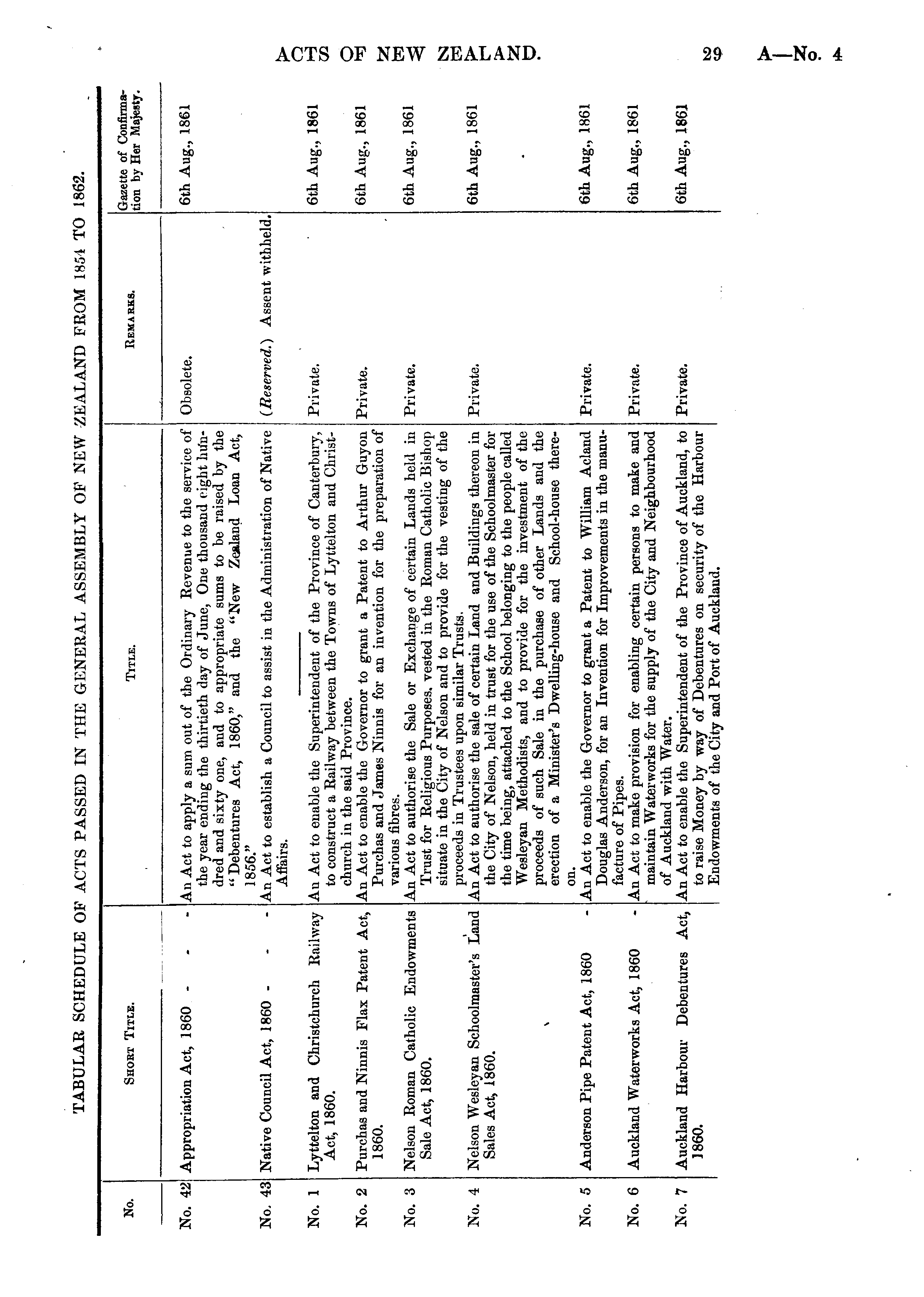 TABULAR SCHEDULE OF ACTS PASSED IN THE GENERAL ASSEMBLY OF NEW ZEALAND FROM 1851 TO 1862. No. Short Title. Title. K EM ARKS. Gazette of Confirmation by Her Majesty. No. 42 Appropriation Act, 1860 - An Act to apply a sum out of the Ordinary Revenue to the service of the year ending the thirtieth day of June, One thousand right hundred and sixty one, and to appropriate sums to be raised by the " Debentures Act, 1860," and the "New Zealand Loan Act, 1856." An Act to establish a Council to assist in the Administration of Native Affairs. Obsolete. 6th Aug., 1861 Native Council Act, 1860 - (.Reserved.) Assent withheld. 6th Aug., 1861 No. 43 No. 1 Lyttelton and Christchurch Railway Act, 1860. An Act to enable the Superintendent of the Province of Canterbury, to construct a Railway between the Towns of Lyttelton and Christchurch iu the said Province. An Act to enable the Governor to grant a Patent to Arthur Guyon Purchas and James Ninnis for an invention for the preparation of various fibres. An Act to authorise the Sale or Exchange of certain Lands held in Trust for Religious Purposes, vested in the Roman Catholic Bishop situate in the City of Nelson and to provide for the vesting of the proceeds in Trustees upon similar Trusts. An Act to authorise the sale of certain Land and Buildings thereon in the City of Nelson, held in trust for the use of the Schoolmaster for the time being, attached to the School belonging to the people called Wesleyan Methodists, and to provide for the investment of the proceeds of such Sale in the purchase of other Lands and the erection of a Minister's Dwelling-house and School-house therePrivate. No. 2 Purchas and Ninnis Flax Patent Act, 1860. Private. 6th Aug., 1861 No. 3 Nelson Roman Catholic Endowments Sale Act, 1860. Private. 6th Aug., 1861 No. 4 Nelson Wesleyan Schoolmaster's Land Sales Act, 1860. Private. 6th Aug., 1861 s Private. No. 5 Anderson Pipe Patent Act, 1860 on. An Act to enable the Governor to grant a Patent to William Acland Douglas Anderson, for an Invention for Improvements in the manufacture of Pipes. An Act to make provision for enabling certain persons to make and maintain Waterworks for the supply of the City and Neighbourhood of Auckland with Water. An Act to enable the Superintendent of the Province of Auckland, to to raise Money by way of Debentures on security of the Harbour Endowments of the City and Port of Auckland. 6th Aug., 1861 No. 6 Auckland Waterworks Act, 1860 Private. 6th Aug., 1861 No. 7 Auckland Harbour Debentures Act, I860. Private. 6th Aug., 1861