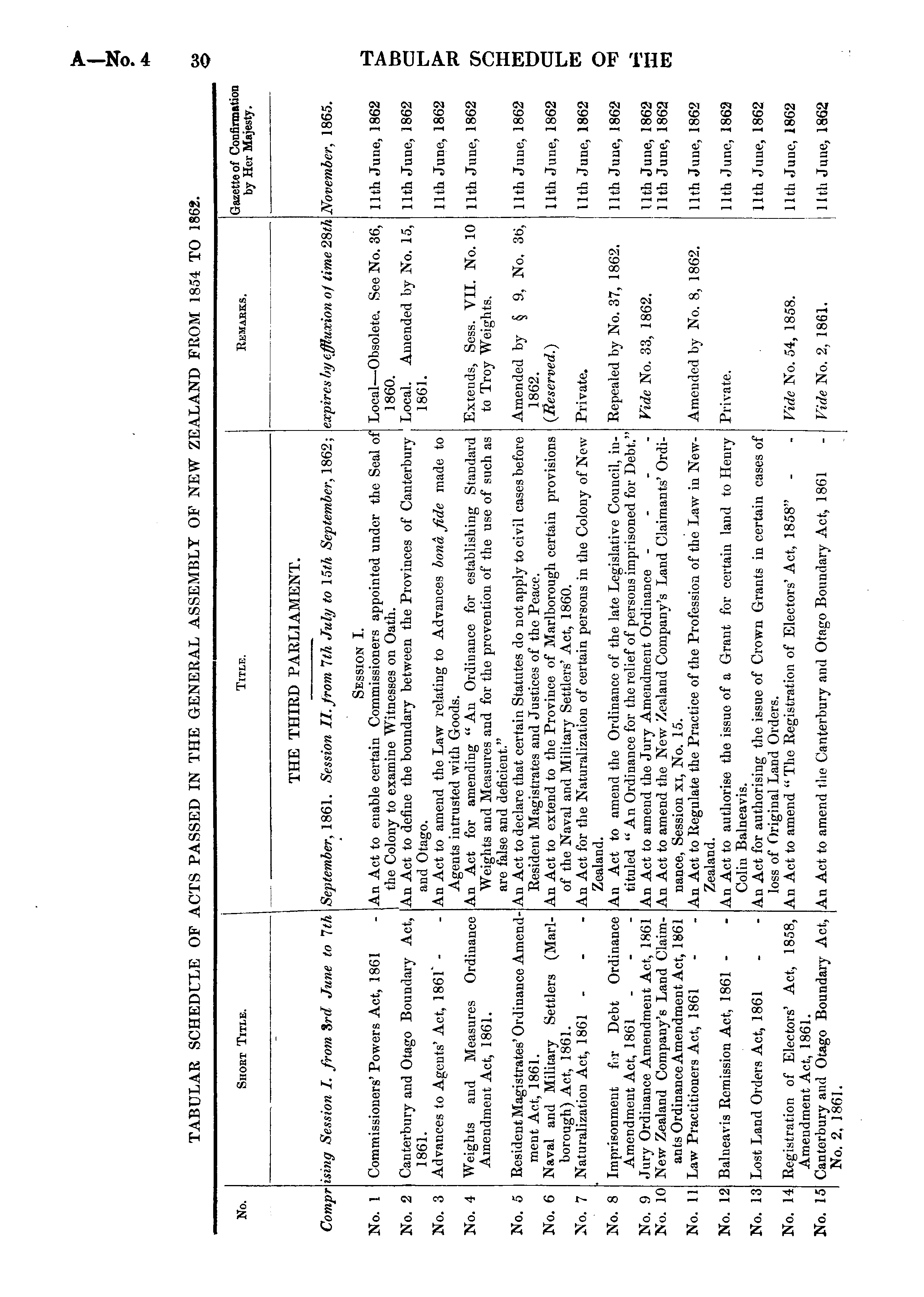 TABULAR SCHEDULE OF ACTS PASSED IN THE GENERAL ASSEMBLY OF NEW ZEALAND FROM 1854 TO 1862. No. Shout Title. Title. Remarks. Gazette of Confirmation by Her Majesty. Compr ising Sessiori I. from 3rd June to 1th THE THIRD PARLIAMENT. • September, 1861. Session II. from 1th July to 15th September, 1862; expires hi/ effluxion o/ lime 28th November, 1865. No. 1 Commissioners' Powers Act, 1861 Session I. An Act to enable certain Commissioners appointed under the Seal of the Colony to examine Witnesses on Oath. An Act to define the boundary between the Provinces of Canterbury and Otago. An Act to amend the Law relating to Advances bond fide made to Agents intrusted with Goods. An Act for amending " An Ordinance for establishing Standard Weights and Measures and for the prevention of the use of such as are false and deficient." An Act to declare that certain Statutes do not apply to civil cases before Resident Magistrates and Justices of the Peace. An Act to extend to the Province of Marlborough certain provisions of the Naval and Military Settlers' Act, 1860. An Act for the Naturalization of certain persons in the Colony of New Zealand. An Act to amend the Ordinance of the late Legislative Council, intituled " An Ordinance for the relief of persons imprisoned for Debt." An Act to amend the Jury Amendment Ordinance - An Act to amend the New Zealand Company's Land Claimants' Ordinance, Session xi, No. 15. An Act to Regulate the Practice of the Profession of the Law in NewZealand. An Act to authorise the issue of a Grant for certain laud to Henry Colin Balneavis. An Act for authorising the issue of Crown Grants in certain cases of loss of Original Land Orders. An Act to amend "The Registration of Electors' Act, 1858" Local —Obsolete. See No. 36, 1860. Local. Amended by No. 15, 1861. 11th June, 1862 No. 2 No. 3 Canterbury and Otago Boundary Act, 1861. Advances to Agents' Act, 1861 - 11th June, 1862 11th June, 1862 No. 4 Weights and Measures Ordinance Amendment Act, 1861. Extends, Sess. VII. No. 10 to Troy Weights. 11th June, 1862 No. 5 Eesident Magistrates' Ordinance Amendment Act, 1861. Naval and Military Settlers (Marlborough) Act, 1861. Naturalization Act, 1861 ... Amended by § 9, No, 36, 1862. (Reserved.) 11th June, 1862 No. 6 11th June, 1862 No. 7 Private. llth June, 1862 No. 8 No. 9 No. 10 Imprisonment for Debt Ordinance Amendment Act, 1861 • Jury Ordinance Amendment Act, 1861 New Zealand Company's Land Claimants Ordinance Amendment Act, 1861 Law Practitioners Act, 1861 Repealed by No. 37, 1862. Vide No. 33, 1862. 11th June, 1862 Uth June, 1862 llth June, 1862 No. 11 Amended by No. 8, 1862. llth June, 1862 No. 12 Balneavis Remission Act, 1861 - Private. llth June, 1862 No. 13 Lost Land Orders Act, 1861 llth June, 1862 No. 14 No. 15 Registration of Electors' Act, 1858, Amendment Act, 1861. Canterbury and Otago Boundary Act, No. 2. 1861. An Act to amend the Canterbury and Otago Boundary Act, 1861 Vide No. 54, 1858. Vide No. 2, 1861. llth June, 1862 llth June, 1862 '