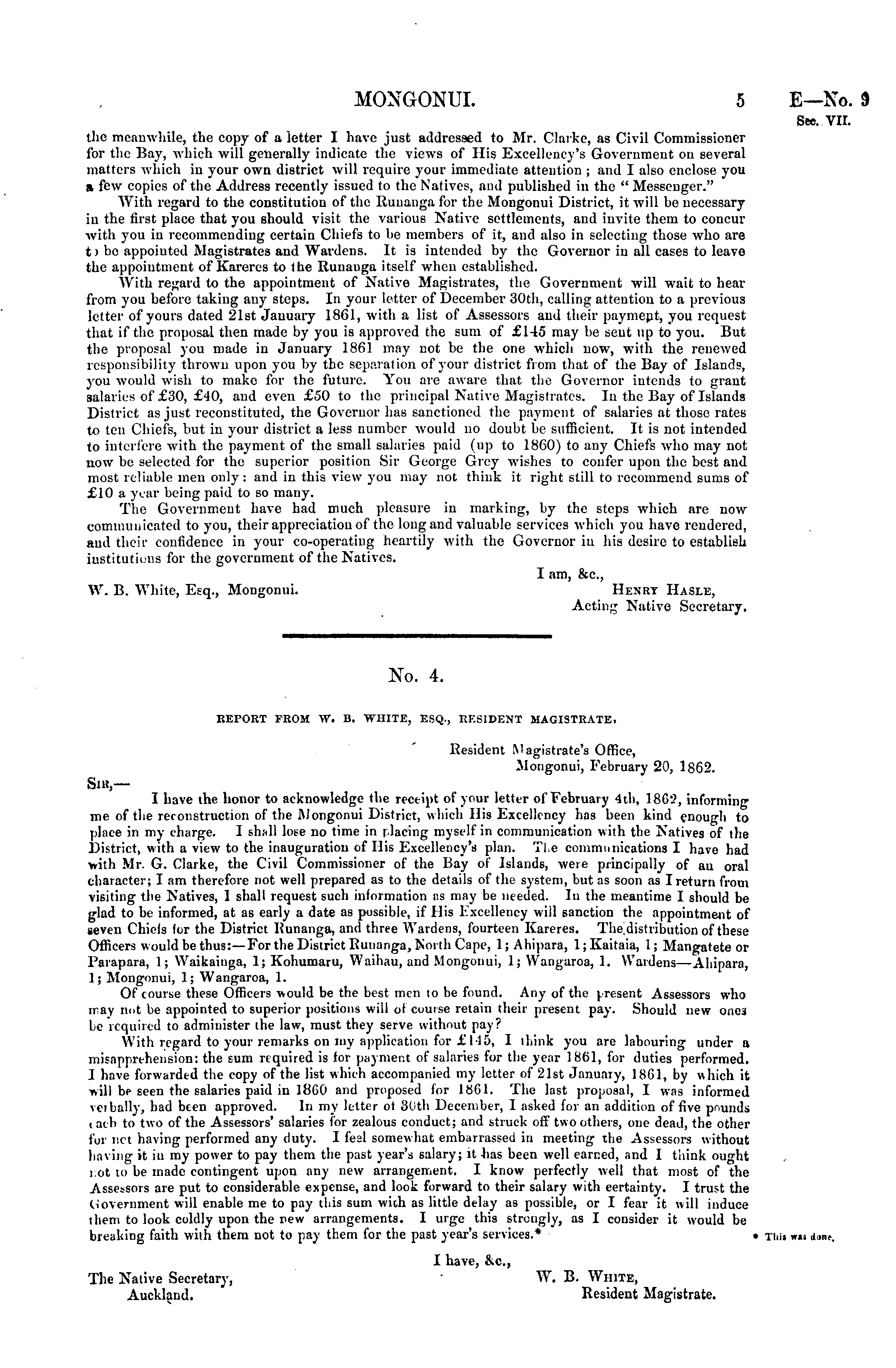 the meanwhile, the copy of a letter I have just addressed to Mr. Clarke, as Civil Commissioner for the Bay, which will generally indicate the views of His Excellency's Government on several matters which in your own district will require your immediate attention ; and I also enclose you a few copies of the Address recently issued to the Natives, and published in the " Messenger." With regard to the constitution of the Runanga for the Mongonui District, it will be necessary in the first place that you should visit the various Native settlements, and invite them to concur with you in recommending certain Chiefs to be members of it, and also in selecting those who are t) bo appointed Magistrates and Wardens. It is intended by the Governor in all cases to leave the appointment of Kareres to the Ruuanga itself when established. With regard to the appointment of Native Magistrates, the Government will wait to hear from you before taking any steps. In your letter of December 30th, calling attention to a previous letter of yours dated 21st January 1861, with a list of Assessors and their payment, you request that if the proposal then made by you is approved the sum of £145 may be sent up to you. But the proposal you made in January 1861 may not be the one which now, with the renewed responsibility thrown upon you by the separation of your district from that of the Bay of Islands, you would wish to make for the future. You are aware that the Governor intends to grant salaries of £30, £40, and even £50 to the principal Native Magistrates. In the Bay of Islands District as just reconstituted, the Governor has sanctioned the payment of salaries at those rates to ten Chiefs, but in your district a less number would no doubt be sufficient. It is not intended to interfere with the payment of the small salaries paid (up to 1860) to any Chiefs who may not now be selected for the superior position Sir George Grey wishes to confer upon the best and most reliable men only: and in this view you may not think it right still to recommend sums of £10 a year being paid to so many. The Government have had much pleasure in marking, by the steps which are now communicated to you, their appreciation of the long and valuable services which you have rendered, and their confidence in your co-operating heartily with the Governor in his desire to establish institutions for the government of the Natives. I am, &c, W. B. White, Esq., Mougonui. Henry Hasle, Acting Native Secretary.
