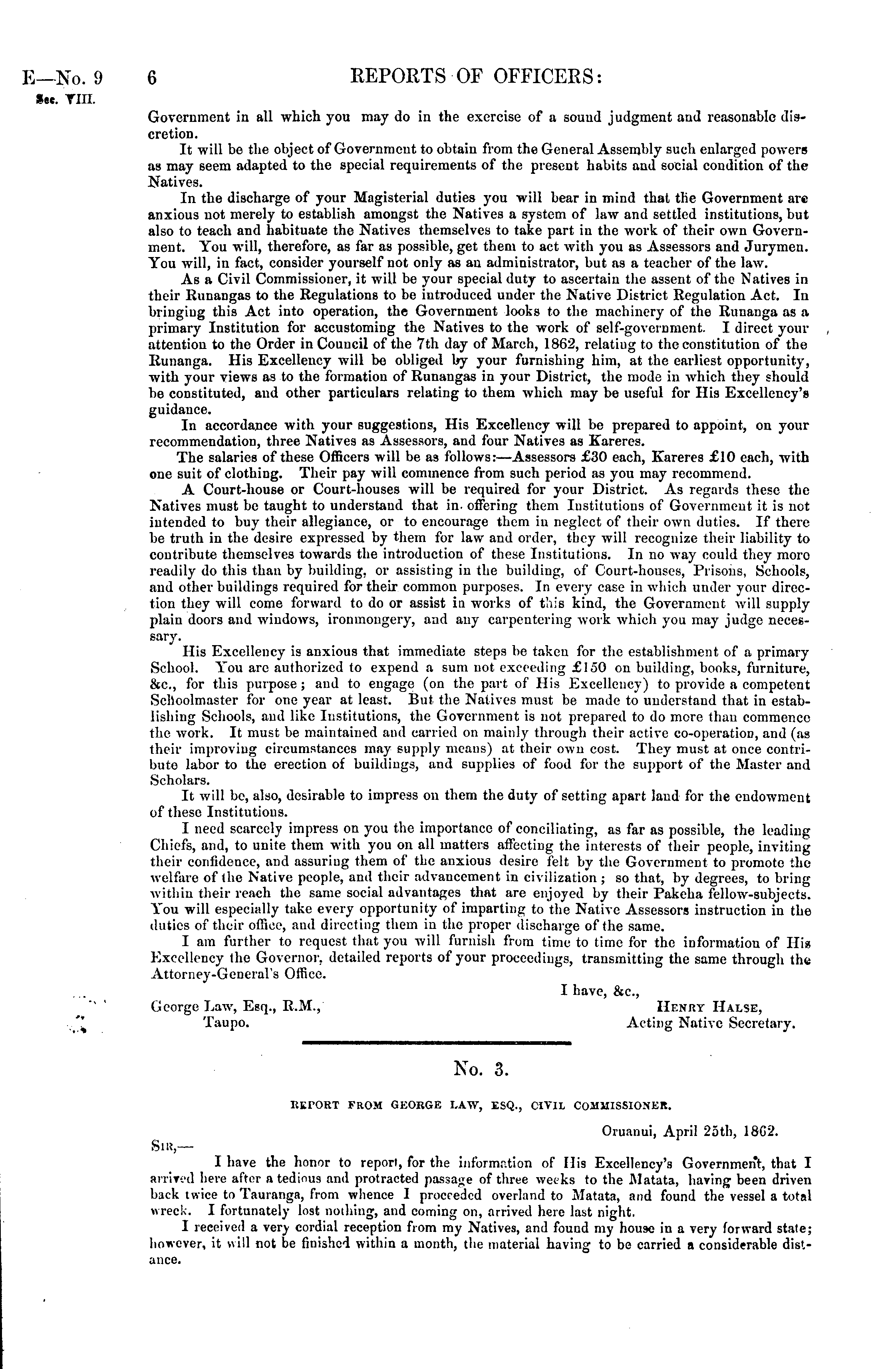 No. 3. RETORT FROM GEOBGE LAW, ESQ., CIVIL COMMISSIONER. Oruanui, April 25th, 18G2. Sik, — I have the honor to report, for the information of Mis Excellency's Government, that I arrived here after a tedinug and protracted passage of three weeks to the lUatuta, haying been driven back twice to Tauianga, from whence I proceeded overland to Matata, and found the vessel a total wreck. I fortunately lost nothing, and coming on, arrived here last night. I received a very cordial reception from my Natives, and found my house iu a very forward state; however, it will not be finished within a month, the material having to be carried a considerable distance.