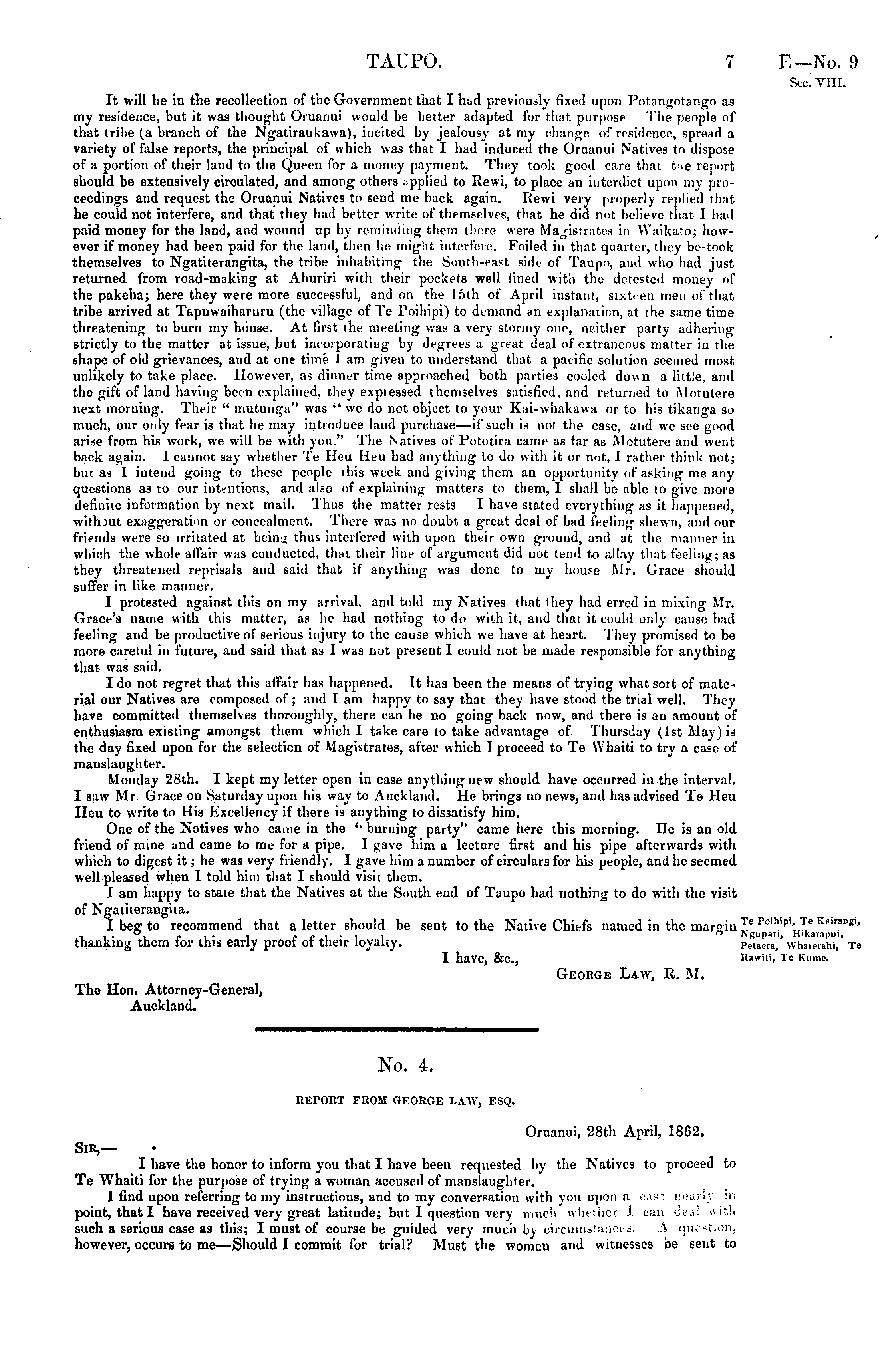 No. 4. REPORT FROM GEORGE LAAV, ESQ. Oruanui, 28th April, 1862. Sir, — I have the honor to inform you that I have been requested by the Natives to proceed to Te Whaiti for the purpose of trying a woman accused of manslaughter. I find upon referring to my instructions, and to my conversation with you upon a case nearly in point, that I have received very great latitude; but I question very much whether I can deal with such a serious case as this; I must of course be guided very much by circumstances. A question, however, occurs to me—Should I commit for trial? Must the women and witnesses be sent to
