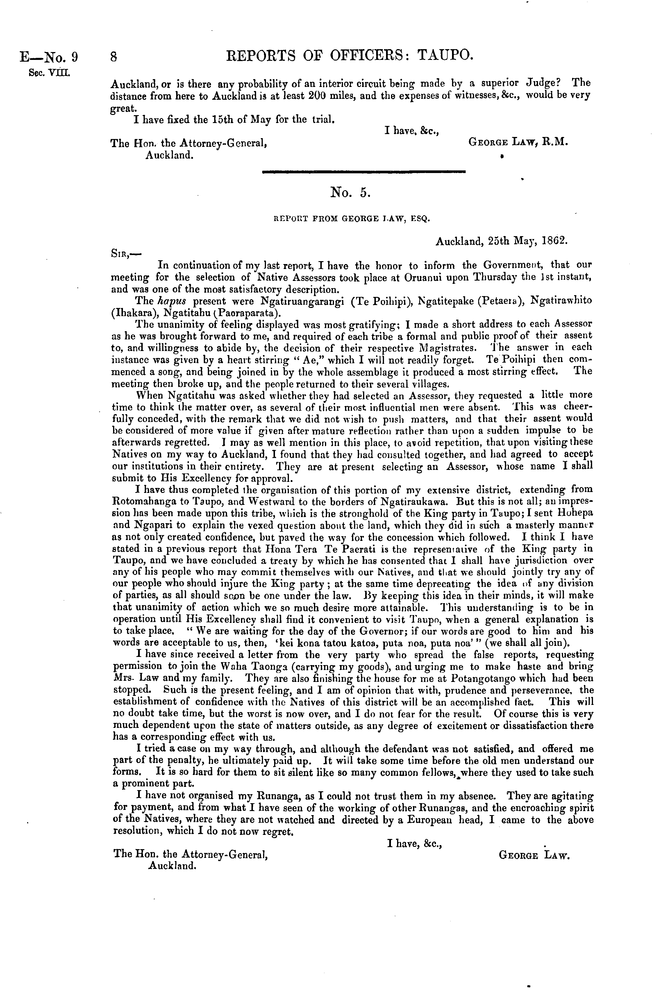 No. 5. REPORT FROM GEORGE LAW, ESQ. Auckland, 25th May, 1862. Sir,— In continuation of my last report, I have the honor to inform the Government, that our meeting for the selection of Native Assessors took place at Oruanui upon Thursday the 1st instant, and was one of the most satisfactory description. The hapus present were Ngatiruangarangi (Te Poihipi), Ngatitepake (Petaera), Ngatirawhito (Ihakara), Ngatitahu The unanimity of feeling displayed was most gratifying; I made a short address to each Assessor as he was brought forward to me, and required of each tribe a formal and public proof of their assent to, and willingness to abide by, the decision of their respective Magistrates. The answer in each instance was given by a heart stirring " Ae," which I will not readily forget. Te Poihipi then commenced a song, and being joined in by the whole assemblage it produced a most stirring effect. The meeting then broke up, and the people returned to their several villages. When Ngatitahu was asked whether they had selected an Assessor, they requested a little more time to think the matter over, as several of tlieir most influential men were absent. This was cheerfully conceded, with the remark that we did not wish to push matters, and that their assent would be considered of more value if given after mature reflection rather than upon a sudden impulse to be afterwards regretted. I may as well mention in this place, to avoid repetition, that upon visiting these Natives on my way to Auckland, I found that they had consulted together, and had agreed to accept our institutions in their entirety. They are at present selecting an Assessor, whose name I shall submit to His Excellency for approval. I have thus completed the organisation of this portion of my extensive district, extending from Rotomabanga to Taupo, and Westward to the borders of Ngatiraukawa. But this is not all; an impression has been made upon tiiis tribe, which is the stronghold of the King party in Taupo; I sent Hohepa and Ngapari to explain the vexed question about the land, which they did in such a masterly manmr as not only created confidence, but paved the way for the concession which followed. I think I have stated in a previous report that Hona Tera Te Paerati is the represeniaiive of the King party in Taupo, and we have concluded a treaty by which lie has consented that I shall have jurisdiction over any of his people who may commit themselves with our Natives, and that we should jointly try any of our people who should injure the King party ; at the same time deprecating the idea of any division of parties, as all should soon be one under the law. By keeping this idea in their minds, it will make that unanimity of action which we so much desire more attainable. This understanding is to be in operation until His Excellency shall find it convenient to visit Taupo, when a general explanation is to take place. " We are waiting for the day of the Governor; if our words are good to him and his words are acceptable to us, then, 'kei kona tatou katoa, puta noa, puta noa' " (we shall all join). I have since received a letter from the very party who spread the false reports, requesting permission to join the Waha Taonga (carrying my goods), and urging me to make haste and bring Mrs Law and my family. They are also finishing the house for me at Potangotango which had been stopped. Such is the present feeling, and I am of opinion that with, prudence and perseverance, the establishment of confidence with the Natives of this district will be an accomplished tact. This will no doubt take time, but the worst is now over, and I do not fear for the result. Of course this is very much dependent upon the state of matters outside, as any degree of excitement or dissatisfaction there has a corresponding effect with us. I tried a case on my w ay through, and although the defendant was not satisfied, and offered me part of the penalty, he ultimately paid up. It will take some time before the old men understand our forms. It is so hard for them to sit silent like so many common fellows, they used to take such a prominent part. I have not organised my Runanga, as I could not trust them in my absence. They are agitating for payment, and from what I have seen of the working of other Runangas, and the encroaching spirit of the Natives, where they are not watched and directed by a European head, I Game to the above resolution, which I do not now regret. I have, &c, The Hon. the Attorney-General, George Law. Auckland.