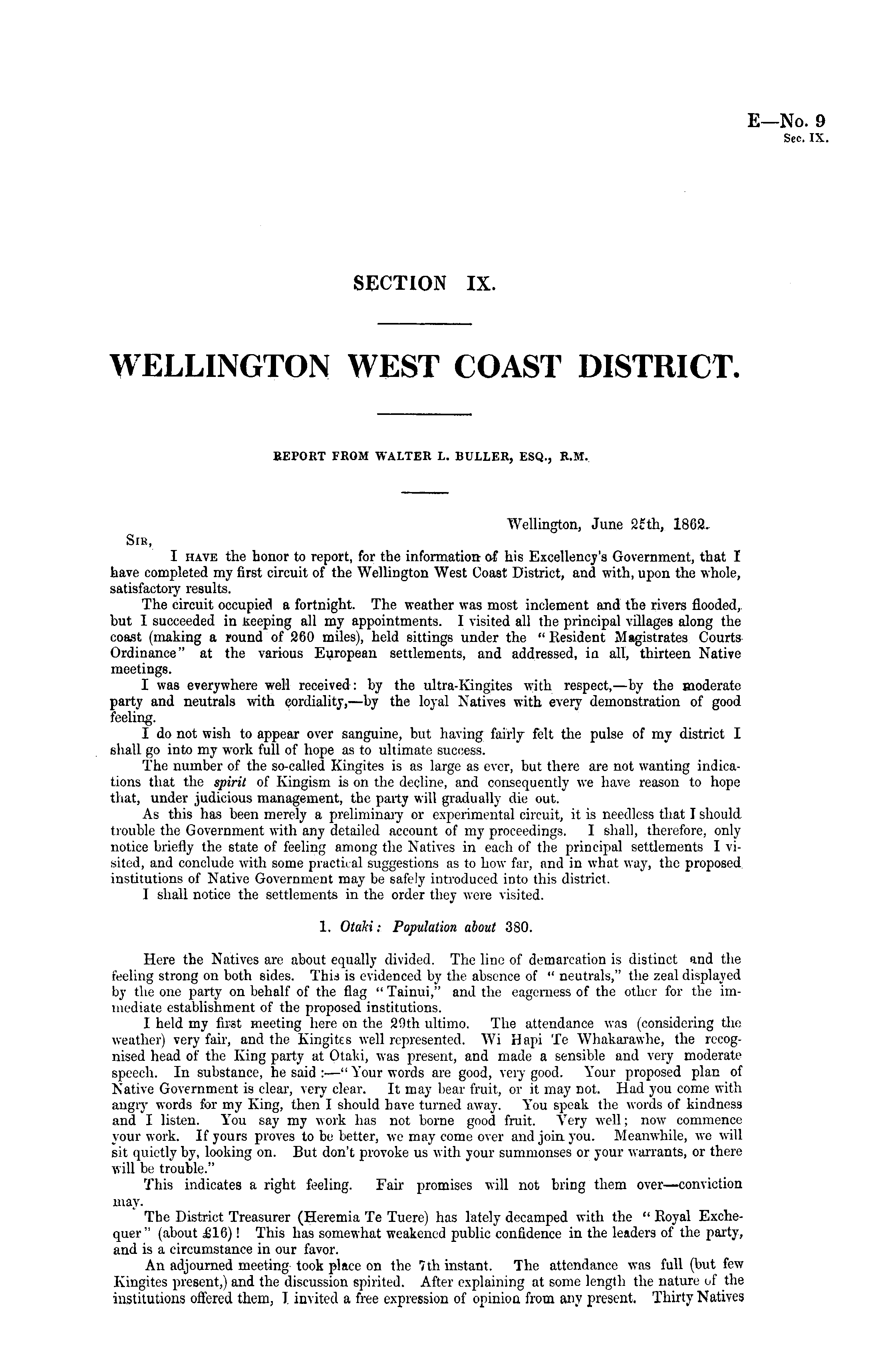 REPORT FROM WALTER L. BULLER, ESQ., R.Sf. Wellington, June 25th, 1862. Sir, I have the honor to report, for the information of his Excellency's Government, that I have completed my first circuit of the Wellington West Coast District, and with, upon the whole, satisfactory results. The circuit occupied a fortnight. The weather was most inclement and the rivers flooded, but I succeeded in Keeping all my appointments. I visited all the principal villages along the coast (making a round of 260 miles), held sittings under the " Resident Magistrates Courts Ordinance" at the various European settlements, and addressed, ia all, thirteen Native meetings. I was everywhere well received: by the ultra-Kingites with respect, —by the moderate party and neutrals with cordiality,—by the loyal Natives with every demonstration of good feeling. I do not wish to appear over sanguine, but having fairly felt the pulse of my district I shall go into my work full of hope as to ultimate success. The number of the so-called Kingites is as large as ever, but there are not wanting indications that the spirit of Kingism is on the decline, and consequently we have reason to hope that, under judicious management, the party will gradually die out. As this has been merely a preliminary or experimental circuit, it is needless that I should trouble the Government with any detailed account of my proceedings. I shall, therefore, only notice briefly the state of feeling among the Natives in each of the principal settlements I visited, and conclude with some practical suggestions as to how far, and in what way, the proposed institutions of Native Government may be safely introduced into this district. I shall notice the settlements in the order they were visited. 1. Otaki: Population about 380. Here the Natives are about equally divided. The line of demarcation is distinct and the feeling strong on both sides. This is evidenced by the absence of " neutrals," the zeal displayed by the one party on behalf of the flag " Tainui," and the eagerness of the other for the immediate establishment of the proposed institutions. I held my first meeting here on the 20th ultimo. The attendance was (considering the weather) very fair, and the Kingites well represented. Wi Hapi Te Whakarawhe, the recognised head of the King party at Otaki, was present, and made a sensible and very moderate speech. In substance, he said : —" Your words are good, very good. Your proposed plan of Native Government is clear, very clear. It may bear fruit, or it may not. Had you come with angry words for my King, then I should have turned away. You speak the words of kindness and I listen. You say my work has not borne good fruit. Very well; now commence your work. If yours proves to be better, we may come over and join you. Meanwhile, we will sit quietly by, looking on. But don't provoke us with your summonses or your warrants, or there will be trouble." This indicates a right feeling. Fair promises will not bring them over—conviction may. The District Treasurer (Heremia Te Tuere) has lately decamped with the " Royal Exchequer" (about £16)! This has somewhat weakened public confidence in the leaders of the party, and is a circumstance in our favor. An adjourned meeting took place on the 7th instant. The attendance was full (but few Kingites present,) and the discussion spirited. After explaining at some length the nature of the institutions offered them, T. invited a free expression of oninioa from any present. Thirty Natives