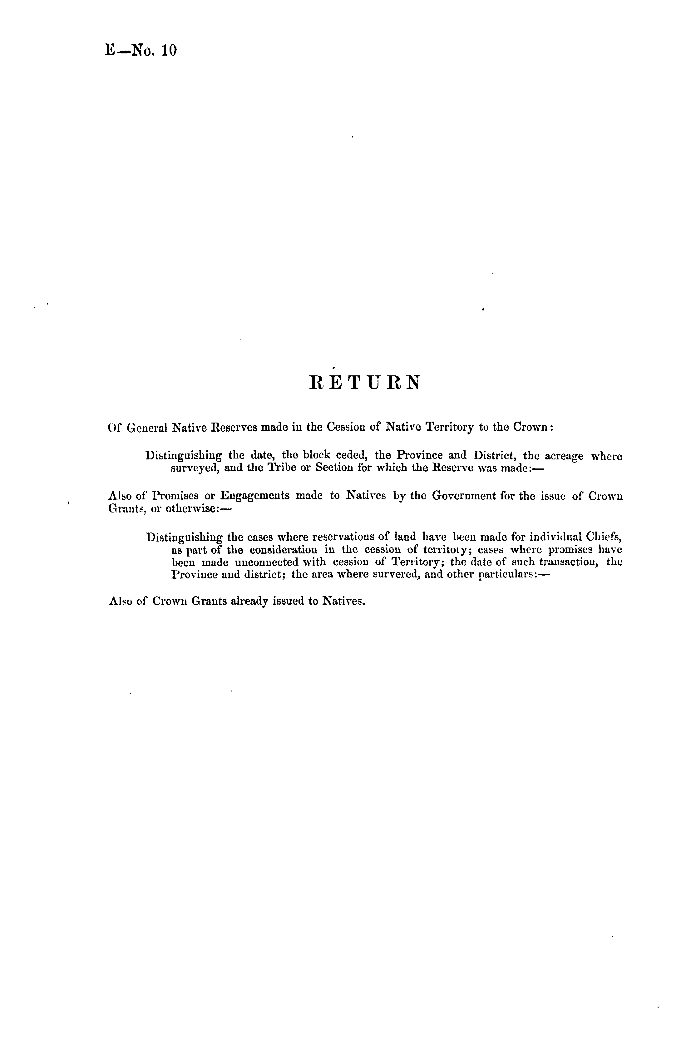 RETURN Of General Native Reserves made in the Cession of Native Territory to the Crown: Distinguishing the date, the block ceded, the Province and District, the acreage where surveyed, and the Tribe or Section for which the Reserve was made:— Also of Promises or Engagements made to Natives by the Government for the issue of Crown Grants, or otherwise: — Distinguishing the cases where reservations of land have been made for individual Chiefs, as part of the consideration in the cession of territoiy; cases where promises have been made unconnected with cession of Territory; the date of such transaction, the Province and district; the area where survered, and other particulars:— Also of Crown Grants already issued to Natives.