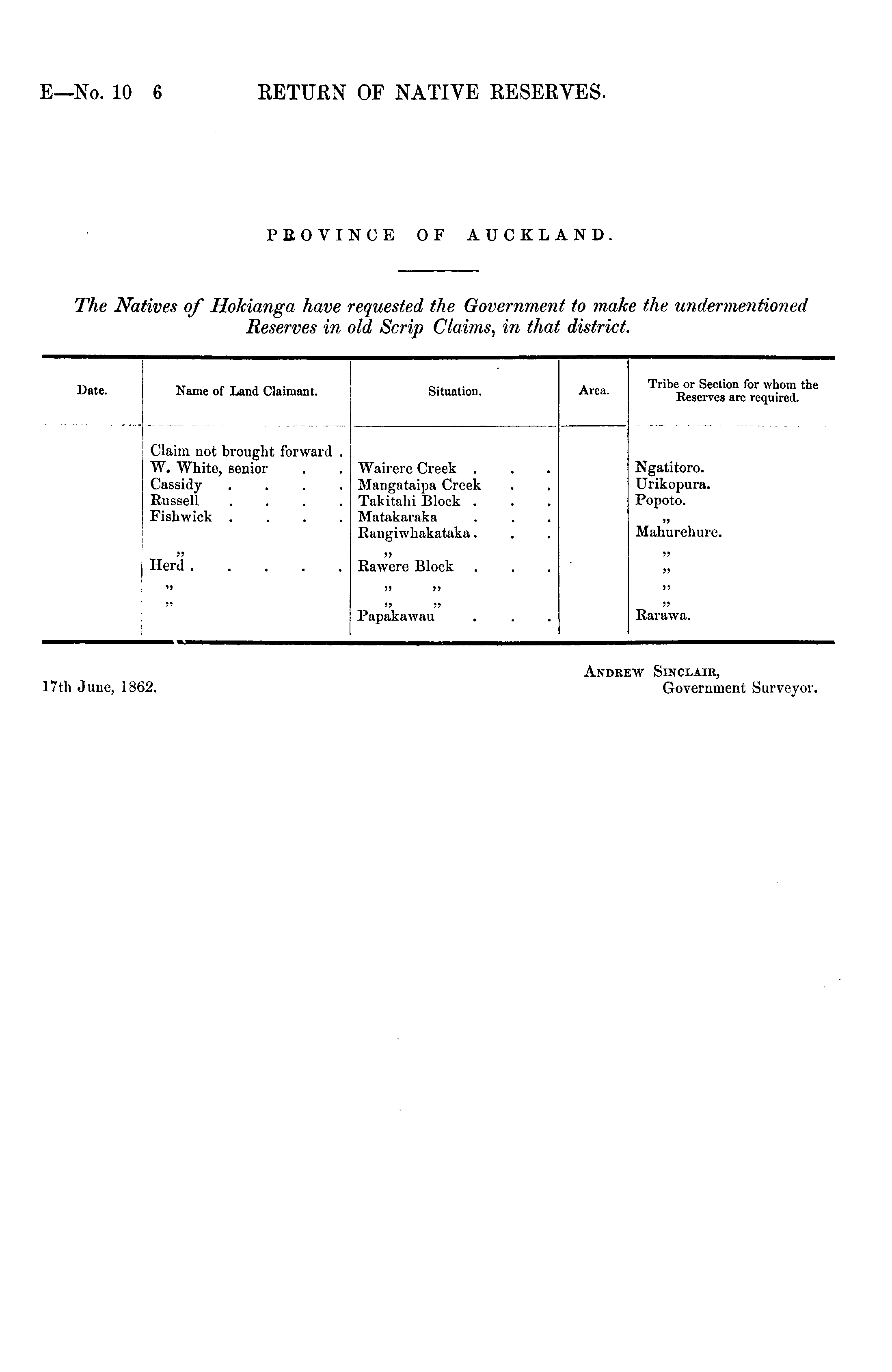 Date. Name of Land Claimant. Situation. Area. Tribe or Section for whom the Reserves are required. Claim not brought forward . W. White, senior Cassidy . Russell . Fishwick . Wairere Creek . Mangataipa Creek Takitahi Block . Matakaraka Raugiwhakataka. Ngatitoro. Urikopura. Popoto. Mahurehure. Herd Rawere Block )) jj !> )j >> JJ )) Papakawau Rarawa. Andk: :w Sinclair, Government Surveyor. 7th June, 1862.