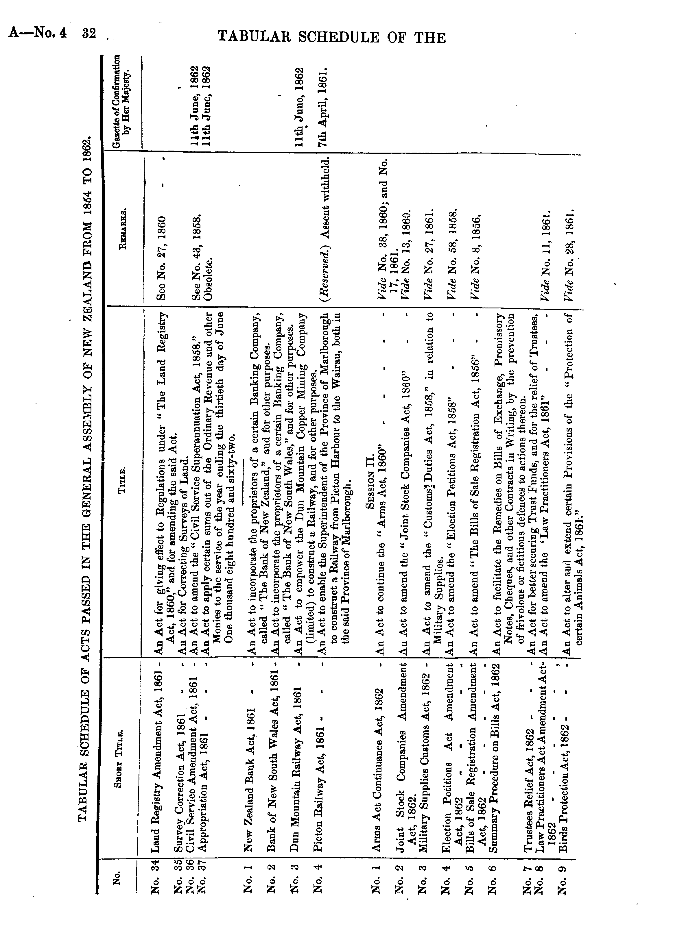TABULAR SCHEDULE OF ACTS PASSED IN THE GENERAL ASSEItfBLY OF NEW ZEALAND. FROM 1854 TO 1862. No. Short Tjtib. Title. Remarks. Gazette of Confirmation by Her Majesty. No. 34 Land Registry Amendment Act, 1861 - An Act for giving effect to Regulations under " The Land Registry Act, 1860," and for amending the said Act. An Act for Correcting Surveys of Land. An Act to amend the "Civil Service Superannuation Act, 1858." An Act to apply certain sums out of the Ordinary Revenue and other Monies to the service of the year ending the thirtieth day of June One thousand eight hundred and sixty- two. See No. 27, 1860 No. 35 No. 36 No. 37 Survey Correction Act, 1861 Civil Service Amendment Act, 1861 - Appropriation Act, 1861 . See No. 43, 1858. Obsolete. ■ 11th June, 1862 11th June, 1862 No. 1 New Zealand Bank Act. 1861 - No. 2 No. 3 Bank of New South Wales Act, 1861 - Dun Mountain Railway Act, 18&1 An Act to incorporate the proprietors of a certain Banking Company, called " The Bank of New Zealand," and for other purposes. An Act to incorporate the proprietors of a certain Banking Company, called " The Bank of New South Wales," and for other purposes. An Act to empower the Dun Mountain Copper Mining Company (limited) to construct a Railway, and for other purposes. An Act to enable the Superintendent of the Province of Marlborough to construct a Railway from Picton Harbour to the Wairau, both in the said Province of Marlborough. (Reserved.) Assent withheld. I 11th June, 1862 No. 4 Picton Railway Act, 1861 - 7th April, 1861. Arms Act Continuance Act, 1862 Session II. An Act to continue the "Arms Act, 1860" Vide No. 38, 1860; and No. 17, 1861. Vide No. 13, 1860. No. 1 No. 2 Joint Stock Companies Amendment Act, 1862. Military Supplies Customs Act, 1862 - An Act to amend the "Joint Stock Companies Act, 1860" No. 3 An Act to amend the " Customs] Duties Act, 1858," in relation to Military Supplies. An Act to amend the " Election Petitions Act, 1858" Vide No. 27, 1861. No. 4 No. 5 Election Petitions Act Amendment Act, 1862 - . Bills of Sale Registration Amendment Act, 1862 Summary Procedure on Bills Act, 1862 An Act to amend "The Bills of Sale Registration Act, 1856" - Vide No. 58, 1858. Vide No. 8, 1856. No. 6 An Act to facilitate the Remedies on Bills of Exchange, Promissory Notes, Cheques, and other Contracts in Writing, by the prevention of frivolous or fictitious defences to actions thereon. An Act for better securing Trust Funds, and for the relief of Trustees. An Act to amend the 'Law Practitioners Act, 1861" - No. 7 No. 8 Trustees Relief Act, 1862 - Law Practitioners Act Amendment Act1862 Birds Protection Act, 1862 - - - Vide No. 11, 1861. No. 9 An Act to alter and extend certain Provisions of the " Protection of certain Animals Act, 1861." Vide Wo. 28, 1861.