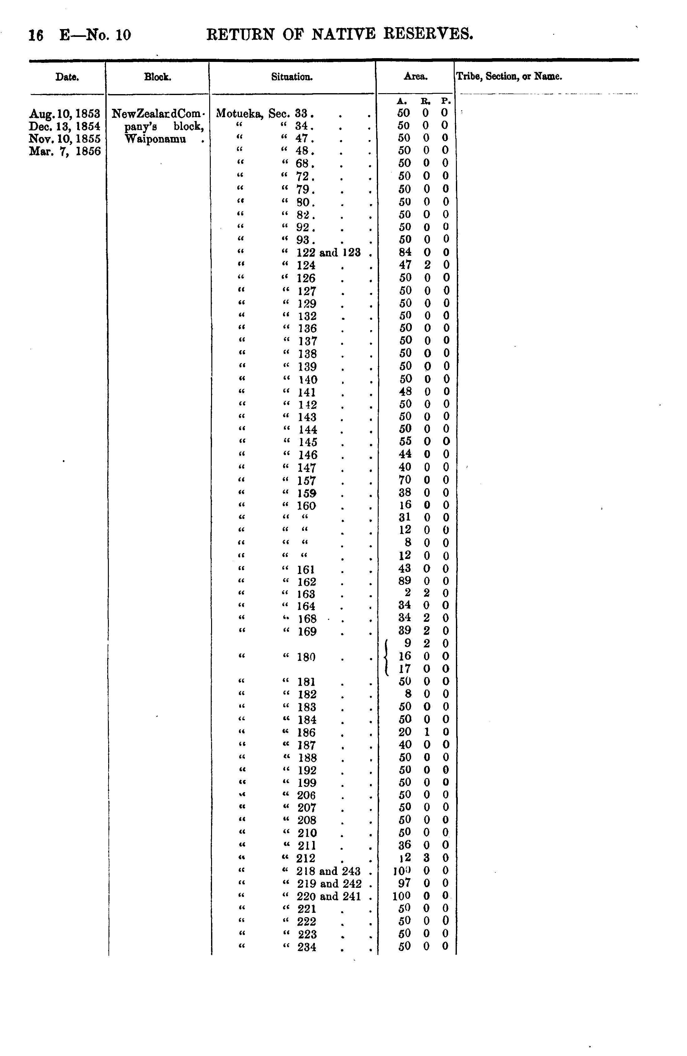 Date. Block. Sitnation. Area. Tribe, Section, or Name. .ug. 10,1853 tec. 13, 1854 \ov. 10, 1855 [ar. 7, 1856 NewZealatdCompany's block, Waiponamu Motueka, Sec. 33. " "34. " "47. " "48. " "68. " " 72. " "79. " "80. " 82. " "92. " '-93. " 122 and 123 . ii ff 124 " 126 " 127 " 129 " " 132 " " 136 " 137 " 138 " " 139 " " 140 " 141 " "142 " 143 " " 144 " 145 " 146 " " 147 " 157 " " 159 " " 160 tt tt tt A. 50 50 50 50 50 50 50 50 50 50 50 84 47 50 50 50 50 50 50 50 50 50 48 50 50 50 55 44 40 70 38 16 31 12 8 12 43 89 2 34 34 39 hi 50 8 50 50 20 40 50 50 50 50 50 50 50 36 12 io;> 97 ioo 50 50 50 50 R. P. 0 0 0 0 0 0 0 0 0 0 0 0 0 0 0 0 0 0 0 0 0 0 0 0 2 0 0 0 0 0 0 0 0 0 0 0 0 0 0 0 0 0 0 0 0 0 0 0 0 0 0 0 0 0 0 0 0 0 0 0 0 0 0 0 0 0 0 0 0 0 0 0 0 0 0 0 2 0 0 0 2 0 2 0 2 0 0 0 0 0 0 0 0 0 0 0 0 0 1 0 0 0 0 0 0 0 0 0 0 0 0 0 0 0 0 0 0 0 3 0 0 0 0 0 0 0 0 0 0 0 0 0 0 0 tt it tt tt tt tt tt tt tt " " 161 " " 162 " 163 " 164 '* 168 • . " " 169 " " 180 " " 181 " 182 " " 183 " " 184 " " 186 " « 187 " " 188 " " 192 « " 199 •« " 206 ■ " 207 " " 208 " " 210 « « 211 " " 212 " « 218 and 243 . " " 219 and 242 . " " 220 and 241 . " •' 221 " " 222 " " 223 " " 234