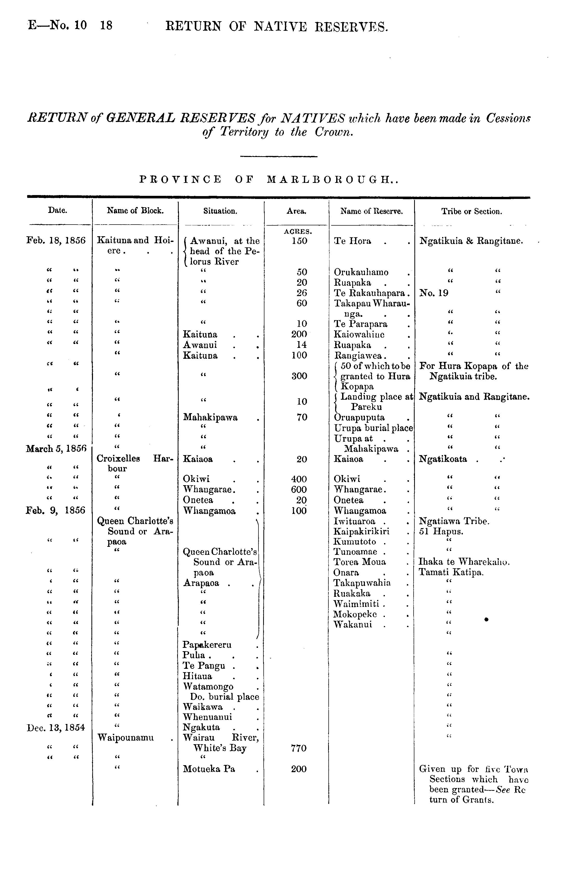 PROVINCE OF M ARLB ROUGH.. Dale. Name of Block. Situation. Area. Name of Reserve. Tribe or Section. \sb. 18, 1856 Kaituna and Hoi- ( Awanui, at the I head of the Pe(lorus River u ACRES. 150 Te Hora . Ngatikuia & Rangitane. ere . if U it tt <( ti it it It a ti ti tt tt tt a it it a tt a fa tt a tt a tt u Kaituna Awanui Kaituna 50 20 26 60 10 200 14 100 Orukauliamo Ruapaka Te Rakauhapara. Takapau Wharaunga. Te Parapara Kaiowahiue Ruapaka Rangiawea. f 50 of which to be < granted to Hura (Kopapa I Landing place at ( Paveku Oruapuputa Urupa burial place Urupa at . Mahakipawa . Kaiaoa tt ti tt it No. 19 " (f tt ti it t. tt tt it ti tt For Hura Kopapa of the Ngatikuia tribe. it ii 300 t< < a tt a ii 10 Ngatikuia and Rangitane. U tt t Mahakipawa 70 tt n te a tt « a M m a <t tc a larch 5, 1856 a Croixelles Harbour tt tt Kaiaoa 20 tt a Ngatikoata . tt tt C« it IV U tt ti tt tt Okiwi Whaugarae. Onetea Whangamoa 400 600 20 100 Okiwi Whangarae. Onetea Whangamoa Iwituaroa . Kaipakirikiri Kumutoto . Tunoamae . Torea Moua Onara Takapuwahia Ruakaka Waimimiti . Mokopeke . Wakanui . tt n it tt a tt 'eb. 9, 1856 a n tt tt it Queen Charlotte's Sound or AraNgatiawa Tribe. 51 Hapus. paoa Queen Charlotte's Sound or Aratt it a a paoa Arapaoa . . / Ihaka te Wharekaho. Tamati Katipa. c« ti tt a a a tt tt tt a tt ti tt a • tt a a / a tt tt a Papftkereru Puha . TePangu . Hitaua Watamongo Do. burial place Waikawa . Whenuanui Ngakuta Wairau River, White's Bay ti tt a a a tt tt tt a tt a ti tt it a ti tt it tt a tt ti it )ec. 13,1854 a it a a Waipounamu it a 770 Given up for fire Town Sections which have been granted— See Re turn of Grants. n n tt Motueka Pa 200