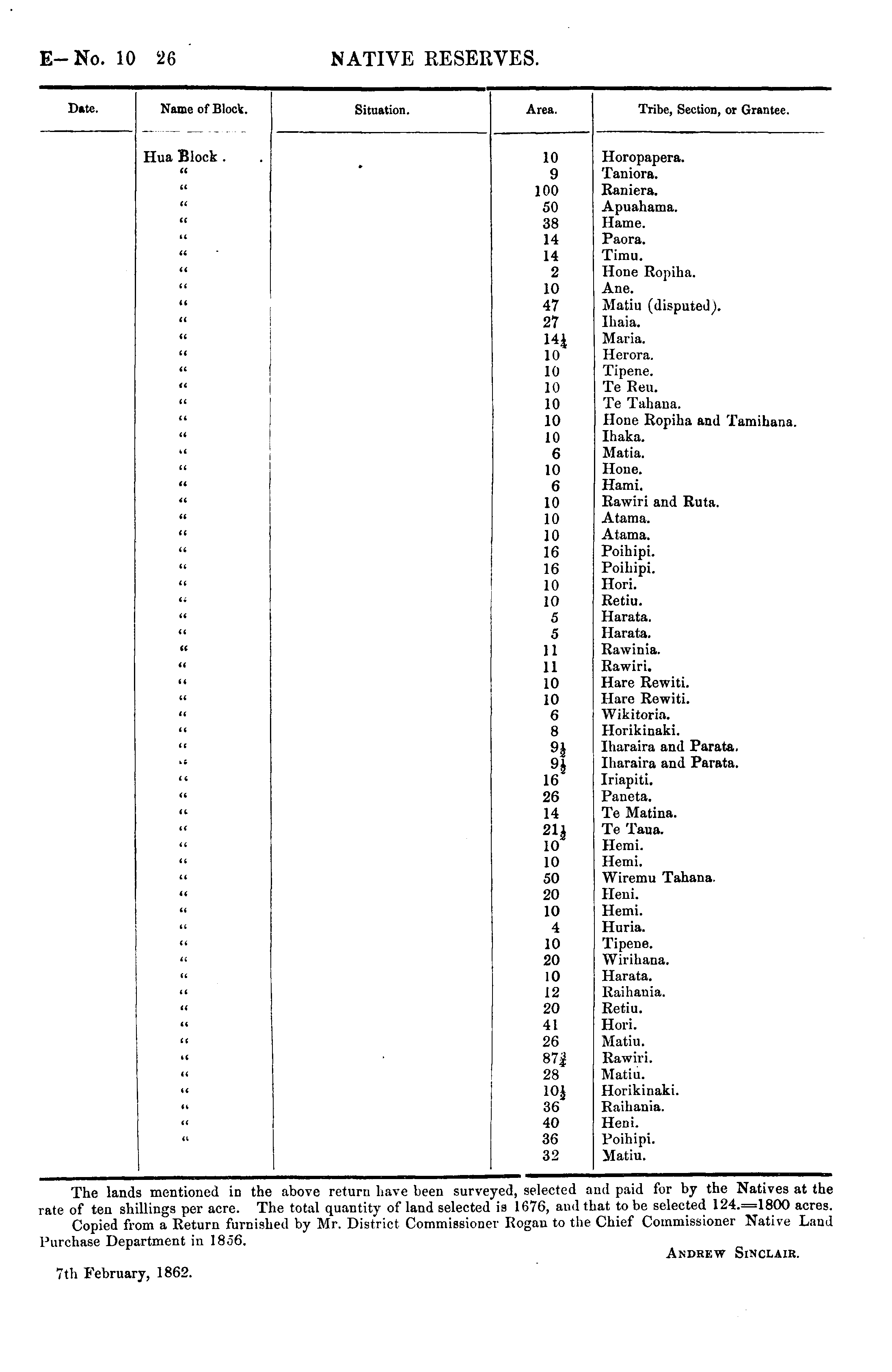 Date. Name of Block. Situation. Area. Tribe, Section, or Grantee. Hua Block . <i 10 9 100 50 38 14 14 2 10 47 27 144 10 10 10 10 10 10 6 10 6 10 10 10 16 16 10 10 5 5 11 11 10 10 6 8 9J 16 26 14 21J 10 10 50 20 10 4 10 20 10 12 20 41 26 87| 28 10J 36 40 36 32 Horopapera. Taniora. Raniera. Apuahama. Hame. Paora. Timu. Hone Ropiha. Ane. Matiu (disputed). Ihaia. Maria. Herora. Tipene. Te Rett. Te Tahaua. Houe Ropiha and Tamihana. Ihaka. Matia. Hone. Hami. Rawiri and Ruta. Atama. Atama. Poihipi. Poihipi. Hori. Retiu. Harata. Harata. Rawinia. Rawiri. Hare Rewiti. Hare Rewiti. Wikitoria. Horikinaki. Iharaira and Parata, Iharaira and Parata. Iriapiti. Paneta. Te Matina. Te Taua. Hemi. Hemi. Wiremu Tahana. Heni. Hemi. Huria. Tipene. Wirihana. Harata. Raihania. Retiu. Hori. Matiu. Rawiri. Matiu. Horikinaki. Raihania. Heni. Poihipi. Matiu. tt tt tt tt tt tt tt tt tt tt tt tt ft tt tt tt tt tt ft ft tt tt tt tt tt ft tt tt ii tt tt tt tt tt tt tt 11 tt ft tt tt tt tt tt tt tt tt ft tt tt tt tt tt tt tt tt tt tt tt The land: rate of ten shi Copied fr< Purchase Dep: s mentioned in the Mings per acre. Th om a Return furnish* artment in 1856. above return have been surveyed, selected and paid for by the Natives at the ie total quantity of land selected is 1676, and that to be selected 124.=1800 acres, ed by Mr. District Commissioner Rogan to the Chief Commissioner Native Land Andrew Sinclair. 7th Februar •7, 1862.