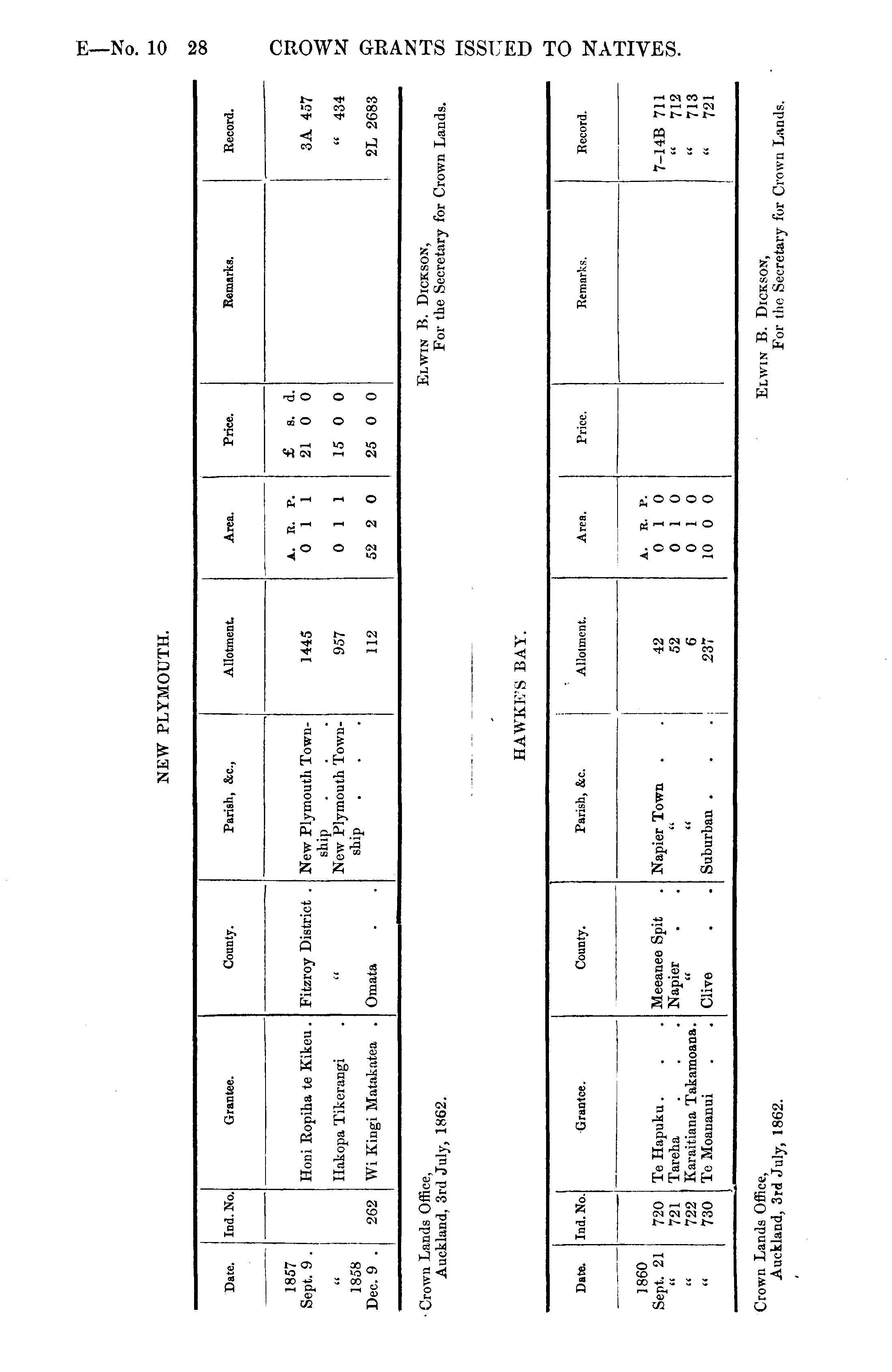 Date. Ind. No. Grantee. County. Parish, &c, Allotment. Area. Price. Remarks. Record. 1857 Sept. 9 . Honi Ropiha te Kikeu . Fitzroy District . New Plymouth Township New Plymouth Township 1445 A. R. P. 0 1 1 £ 21 s. d. 0 0 3A 457 ii Ilakopa Tikerangi a 957 0 1 1 15 0 0 " 434 1858 Dec. 9 . Wi Kingi Matakatea . Omata 112 52 2 0 25 0 0 2L 2683 262 Crown Lands Office, Auckland, 3rd July, 1862. Elwin B. Dickson, For the Secretary for Crown Lands. * HAWKE'S BAY. % Date. Ind. No. I , Grantee. County. Parish, &c. Allotment. Area. Price. Remarks. Becord. 1860 Sept. 21 720 721 722 730 Te Hapuku. Tareha Karaitiana Takamoana. Te Moananui Meeanee Spit Napier Napier Town 42 52 6 537 A. 0 0 0 10 R. P. 1 0 1 0 1 0 0 0 7-14B 711 712 " 713 721 ii ii i( Clive Suburban . Crown Lands Office, Auckland, 3rd July, 1862. Elwin B. Dickson, For the Secretary for Crown Lands. /