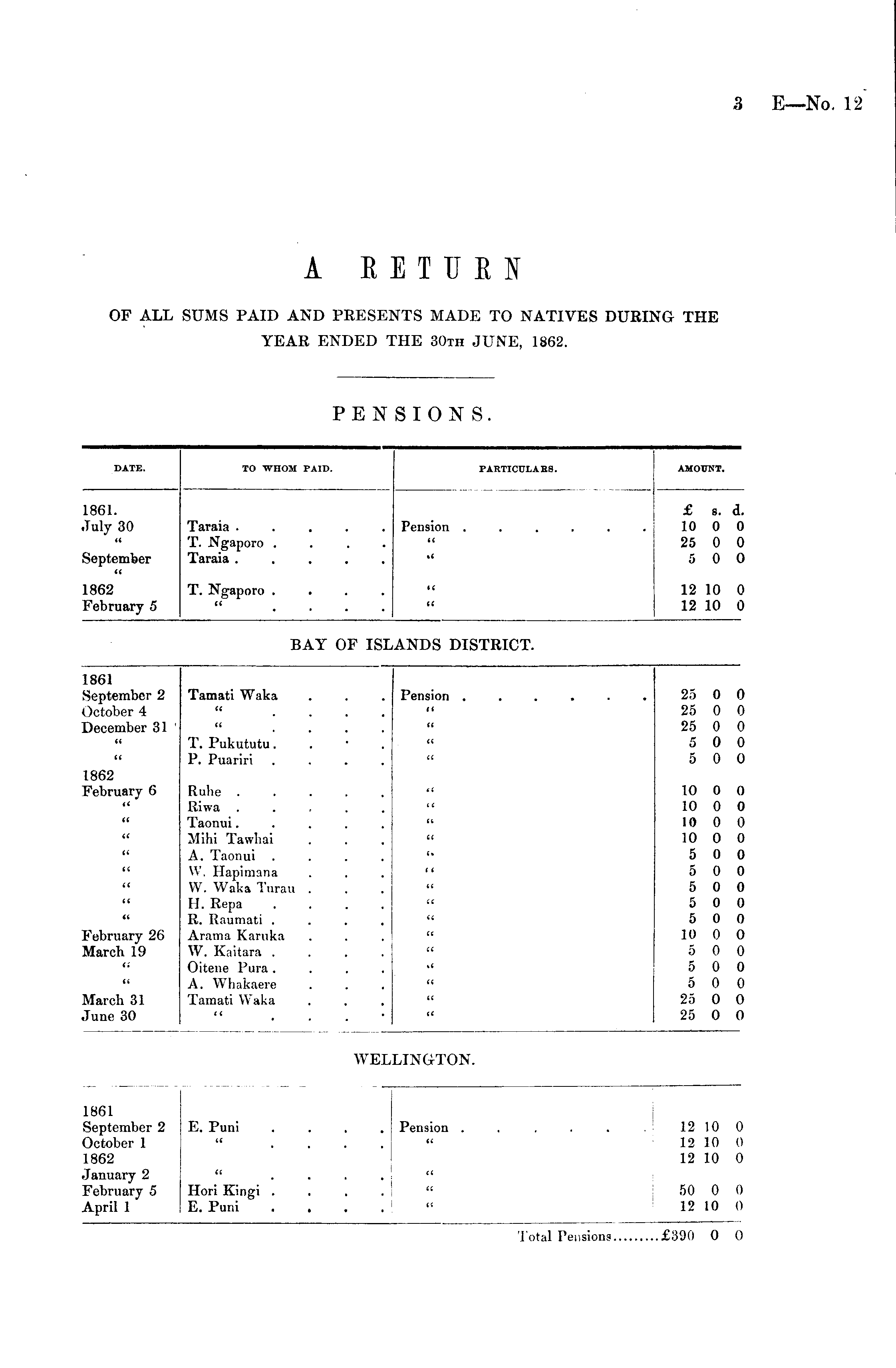 861 September 2 )ctober 1 862 E. Puni Pension . u 12 10 12 10 12 10 C c c anuary 2 February 5 Lpril 1 Hori Kingi . E. Puni H It 50 0 12 10 c (] Total Tensions £390 0