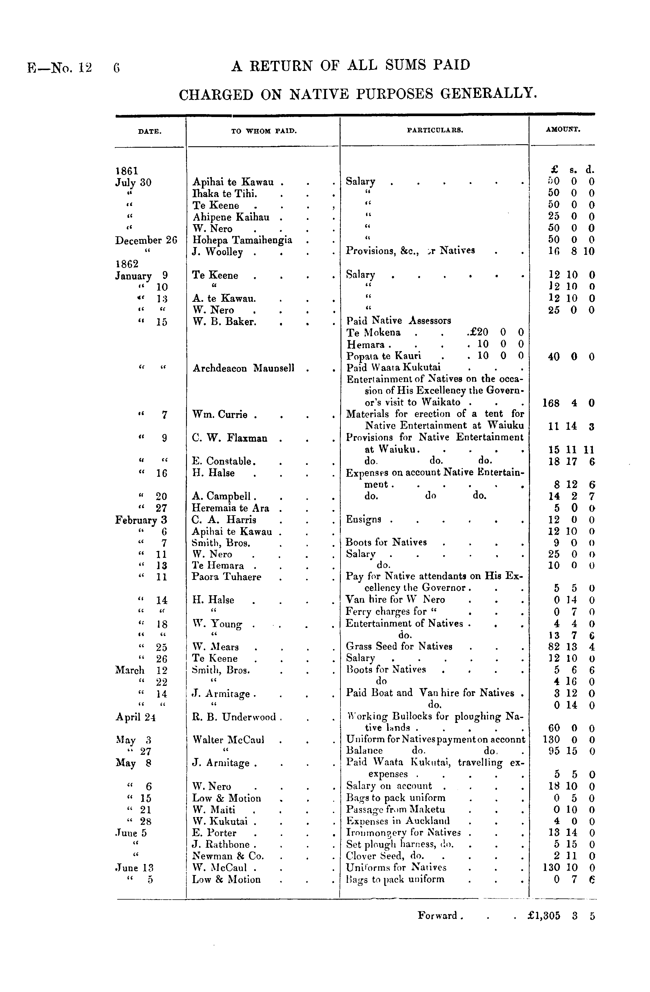 DATE. TO WHOM PAID. PARTICULARS. AMOUNT. 1861 July 30 It M Apihai te Kawau . Ihaka te Tihi. Te Keene . Ahipene Kaihau . W. Nero llohepa Tamaihengia J. Woolley . i Salary ...... ii ii £ s. d. &0 0 0 50 0 0 50 0 0 25 0 0 50 0 0 50 0 0 lfi 8 10 (C H December 26 <( Provisions, &c, :,r Natives 1862 January 9 " 10 *' 13 |l ii Te Keene . a Salary ...... ii 12 10 0 J2 10 0 12 10 0 25 0 0 A. te Kawau. VV. Nero . W. B. Baker. ii M " 15 a u " 7 Archdeacon Maunsell Wm. Currie . . Paid Native Assessors Te Mokena . . .£20 0 0 Hemara . . . . 10 0 0 Popaia te Kauri . . 10 0 0 Paid WaataKukutai Entertainment of Natives on the occasion of His Excellency the Governor's visit to Waikato . Materials for erection of a tent for Native Entertainment at Waiuku Provisions for Native Entertainment at Waiuku do. do. do. Expenses on account Native Entertainment ...... do. do do. 40 0 0 168 4 0 C. W. Flaxman . 11 14 3 " 9 15 11 11 18 17 6 « M E. Constable. H. Halse . " 16 8 12 6 14 2 7 5 0 (> 12 0 0 12 10 0 9 0 0 25 0 (> 10 0 0 " 20 " 27 February 3 " 6 7 " 11 " 13 " 11 A. Campbell . Heremaia te Ara . C. A. Harris Apihai te Kawau . Smith, Bros. \V. Nero Te Hemara . Paora Tuhaere Ensigns Boots for Natives .... Salary ...... " 14 it $t '■' 18 << it " 25 " 26 March 12 " 22 a 14 ■< ii H. Halse . (I W. Young . • . W. Mears . Te Keene Smith, Bros. ii 'do. Pay for Native attendants on His Excellency the Governor . Van hire for W Nero Ferry charges for " ... Entertainment of Natives . . do. Grass Seed for Natives Salary ...... Boots for Natives .... do Paid Boat and Van hire for Natives . do. Working Bullocks for ploughing Native lands ..... Uniform for Natives payment on acconnt Balance do. do. Paid Waata Kukutai, travelling ex5 5 0 0 14 0 0 7 0 4 4 0 13 7 C 82 13 4 12 10 0 5 6 6 4 16 0 3 12 0 0 14 0 J. Armitage . (t April 24 R. B. Underwood . 60 0 0 130 0 0 95 15 0 May 3 " 27 May 8 Walter McCaul . (C J. Armitage . 5 5 0 18 10 0 0 5 0 0 10 0 4 0 0 13 14 0 5 15 0 2 11 0 130 10 0 0 7 6 " 6 " 15 " 21 " 28 .Tune 5 |4 W. Nero Low & Motion W. Maiti W. Kukutai . E. Porter J. Rathbone . Newman & Co. W. McCaul . Low & Motion expenses ..... Salary on account .... Bags to pack uniform Passage from Maketu Expenses in Auckland Ironmongery for Natives . Set plough harness, do. Clover Seed, do. .... Uniforms for Natives Hags to pack uniform II June 13 " 5 Forward . 1,305 3 5