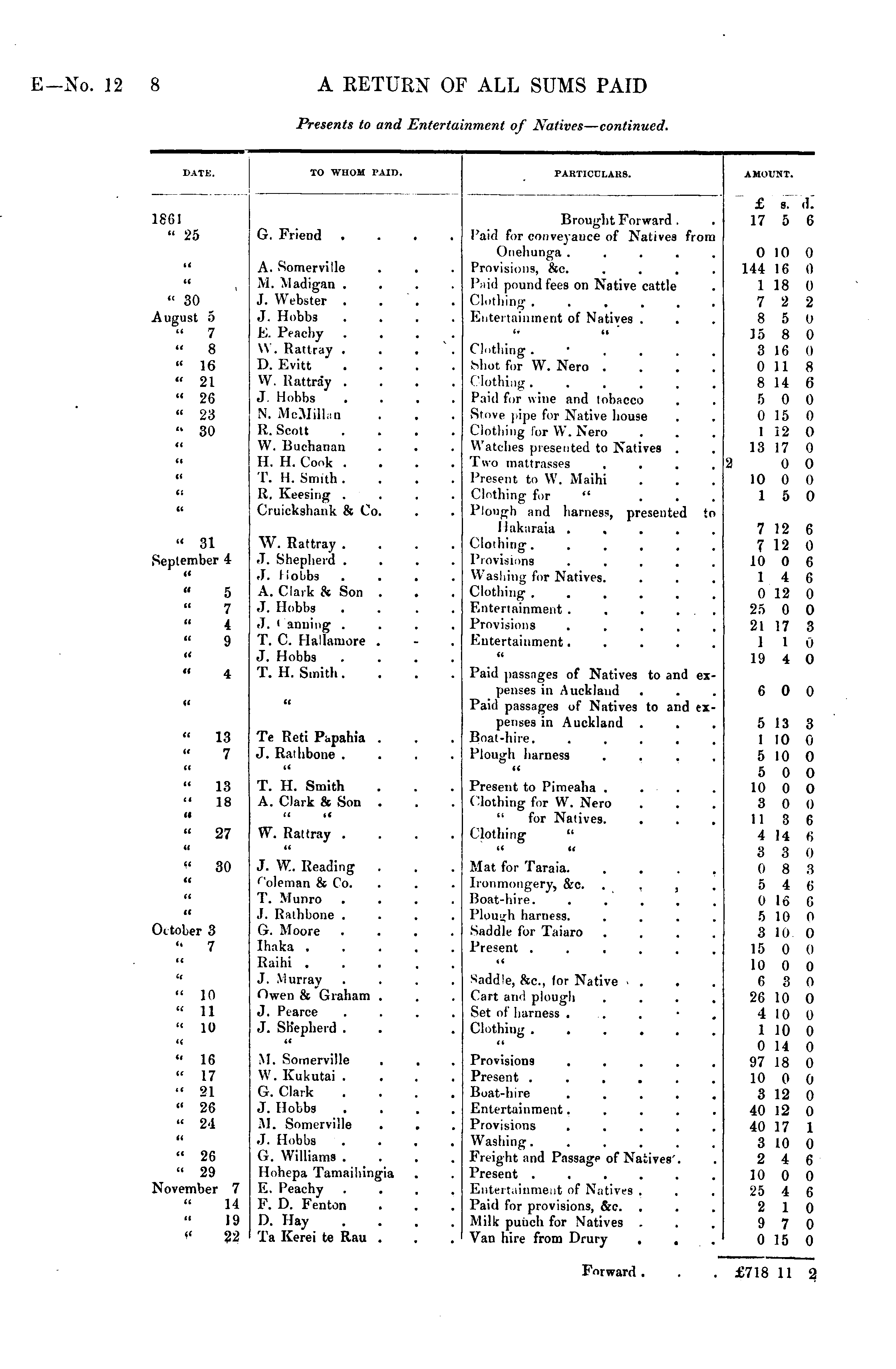''resents to and Entertainment of Natives — continued. DATK. TO WHOM PAID. TAKTICCLAKS. AMOUNT. 18G1 " 25 £ S. (1. 17 5 G 11 (c G. Friend A. Somerville M. Madigan . J. Webster . J. Hobbs . K. Peachy VV. Rattray . D. Evitt VV. Rattray . J. Hobbs N. McMillan R.Scott VV. Buchanan H. H. Cook . T. H. Smith . Iv. Keesing . Cruickshank & Co. Brought Forward . Paid for conveyance of Natives from Onehunga .... Provisions, &c. . . . . Paid pound fees on Native cattle Clothing ...... Entertainment of Natives . H (I 2 0 10 0 144 16 0 1 18 0 7 2 2 8 5 0 15 8 0 3 16 0 0 11 8 8 14 « 5 0 0 0 15 0 1 12 0 13 17 0 0 0 10 0 0 1 5 0 " 30 August 5 " 7 8 " 16 " 21 " 26 " 23 " 30 Clothing .".... bbot for W. Nero . Clothing Paid for wine and tobacco Stove pipe for Native house Clothing for VV. Nero Watches presented to Natives . '1 wo inattrasses .... Present to W. Maihi Clothing for " . . . Plough and harness, presented to Hakaraia . Clothing. . Provisions . Washing for Natives. Clothing ...... Entertainment . . . . . . Provisions . . . . . Entertainment. u (( ({ II ri u 7 12 6 7 12 0 10 0 6 1 4 6 0 12 0 25 0 0 21 17 3 1 1 0 19 4 0 " 31 September 4 W. Rattray . J. Shepherd . J. Mobbs . A. Clark & Son . J. Hobbs J. < aiming . T. C. Flallamore . J. Hobbs . T. H. Smith. " 5 7 " 4 9 M " 4 ii H Paid passages of Natives to and expenses in Auckland Paid passages of Natives to and expenses in Auckland Boat-hire. . Plough harness . 6 0 0 5 13 3 1 10 0 5 10 0 5 0 0 10 0 0 3 0 0 113 6 4 14 6 3 3 0 0 8 3 5 4 6 0 16 6 5 10 0 3 10. 0 15 0 0 10 0 0 6 3 0 26 10 0 4 10 0 1 10 0 0 14 0 97 18 0 10 0 0 3 12 0 40 12 0 40 17 1 3 10 0 2 4 6 10 0 0 25 4 G 2 10 9 7 0 0 15 0 " 13 7 Te Reti Papahia . J. Rathbone . ii (( it 13 18 T. H. Smith A. Clark & Son . tt M Present to Pimeaha . . . Clothing for W. Nero " for Natives. Clothing " •i u (i " 27 W. Rattray . if " 30 u (I II October 3 " 7 J. W. Reading . Coleman & Co. T. Munro . J. Rathbone . G-. Moore Ihaka . Raihi . J. Murray Owen & Graham . J. Pearce J. Sh'epherd . ii Mat for Taraia. . Ironmongery, &c. . . , . Boat-hire. . Plough harness. . Saddle for Taiaro . Present ...... ■i << H " 10 " 11 " 10 Saddle, &c, (or Native . . Cart and plough . Set of harness ... . • , Clothing ...... it >( " 16 " 17 " 21 " 26 " 24 u " 26 " 29 November 7 " 14 19 « 22 M. Somerville W. Kukutai . G. Clark J. Ilobbs M. Somerville J. Hobbs . G. Williams . Hohepa Tamaihingia E. Peachy F. D. Fenton D. Hay Ta Kerei te Rau . • • Provisions . Present ...... Boat-hire , Entertainment. . . . • Provisions . Washing...... Freight and Passage of Natives'. Present ...... Entertainment of Natives . Paid for provisions, &c. Milk puiich for Natives Van hire from Drury . . Forward . . . £718 11 i
