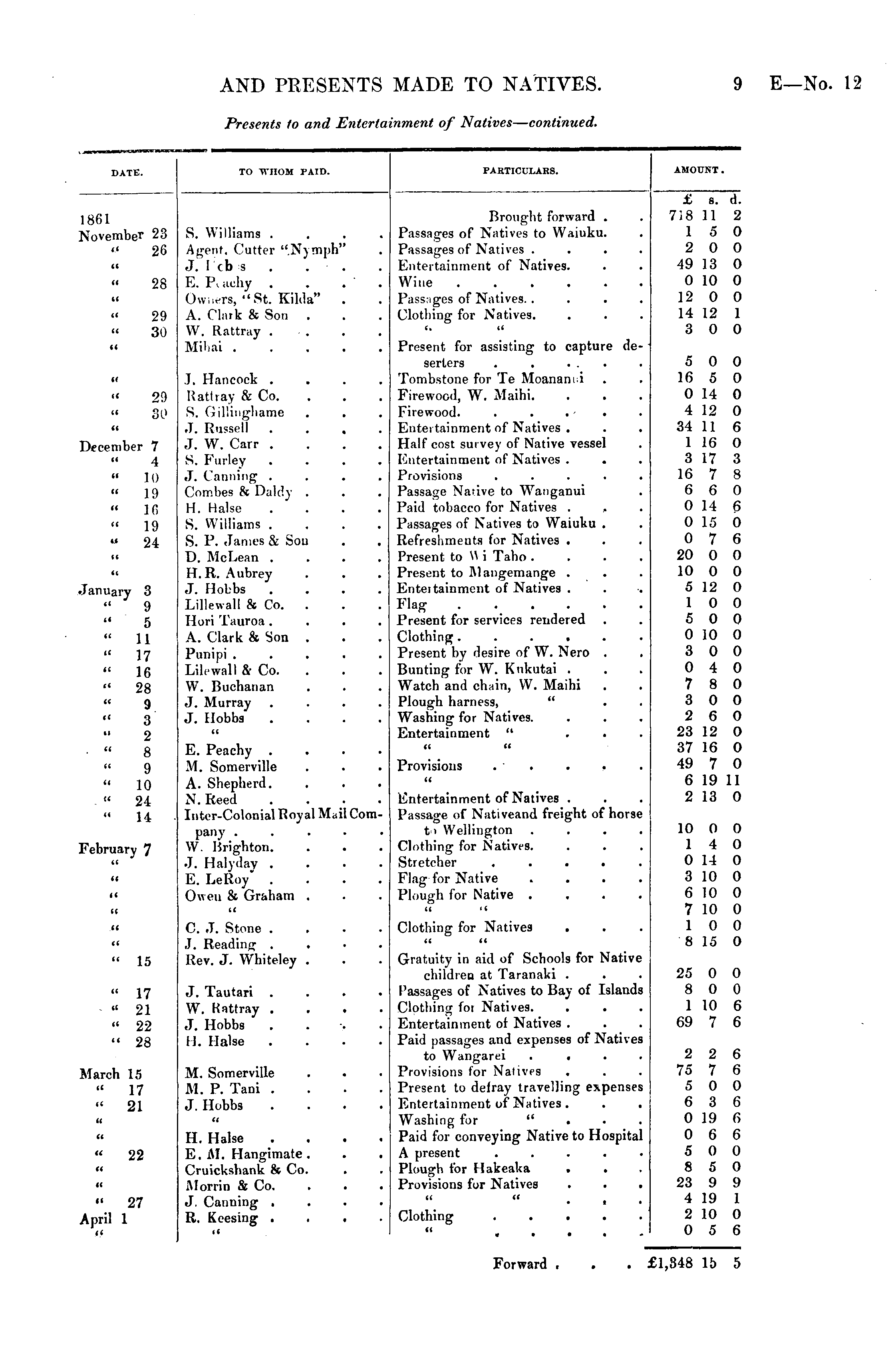 Presents to and Enterta, 'nment of 'atives — continue* DATE. TO WHOM PAID. PARTICULARS. AMOUNT. 1861 November 23 " 26 it S. Williams . . . . Agent, Cutter ".Nymph" J. i cb s . . . E. P< achy . . . ■ . Owners, "St. Kilda" . A. Clark & Sou . W. Rattray Mibai . Brought forward . Passages of Natives to Waiuku. Passages of Natives .... Entertainment of Natives. Wine Passages of Natives..... Clothing for Natives. c. ii 718 11 1 5 2 0 49 13 0 10 12 0 14 12 3 0 £ 8. d. 718 11 2 1 5 0 2 0 0 49 13 0 0 10 0 12 0 0 14 12 1 3 0 0 2 0 0 0 0 0 1 0 28 U " 29 " 30 <t Present for assisting to capture de5 0 0 16 5 0 0 14 0 4 12 0 34 11 6 1 16 0 3 17 3 16 7 8 6 6 0 0 14 6 0 15 0 0 7 6 20 0 0 10 0 0 5 12 0 1 0 0 5 0 0 0 10 0 3 0 0 0 4 0 7 8 0 3 0 0 2 6 0 23 12 0 37 16 0 49 7 0 6 19 11 2 13 0 u " 29 30 ii December 7 4 " 10 " 19 " lfi " 19 " 24 i < J. Hancock . Ratlray & Co. S. Gillinghame . . J. Russell . J. W. Carr . S. Furley .... J. Canning . Combes & Dald)' . H. Halse . ' . S. Williams .... S. P. James & Sou D. McLean .... H.R.Aubrey J. Hobbs . Lillewall & Co. Hori Tauroa .... A. Clark & Son . Pumpi . Lilewall & Co. . W. Buchanan J. Murray . . . . J. Ilobbs . serters . . ... Tombstone for Te Moanami Firewood, W. Maihi. Firewood. . . •' . Entertainment of Natives . Half cost survey of Native vessel Entertainment of Natives . Provisions ..... Passage Native to Wanganui Paid tobacco for Natives . > Passages of Natives to Waiuku . Refreshments for Natives . Present to \\ i Taho .... Present to IMangemange . Enteitainment of Natives . Flag ...... Present for services rendered Clothing ...... Present by desire of W. Nero . Bunting for W. Knkutai . Watch and chain, W. Maihi Plough harness, " Washing for Natives. Entertainment " ... « « 5 0 16 5 0 14 4 12 34 11 1 16 3 17 16 7 6 6 0 14 0 15 0 7 20 0 10 0 5 12 1 0 5 0 0 10 3 0 0 4 7 8 3 0 2 6 23 12 37 16 0 0 0 0 6 0 3 8 0 6 o 6 0 0 0 0 o 0 0 0 0 0 0 o 0 H January 3 9 5 " 11 " 17 " 16 28 9 3 2 • " 8 9 " 10 . " 24 14 E. Peachy .... M. Somerville A. Shepherd. N.Reed . Inter-Colonial Royal Mail ComProvisions . • . . r 49 7 6 19 0 11 February 7 pany . VV. Brighton. J. Halyday . E. LeRoy" . . Owen & Graham . Entertainment of Natives . Passage of Nntiveand freight of horse t) Wellington .... Clothing for Natives. Stretcher ..... Flag for Native .... Plough for Native .... ii << 2 13 10 0 1 4 0 14 3 10 6 10 7 10 10 0 0 1 4 0 0 14 0 3 10 0 6 10 0 7 10 0 1 0 0 8 15 0 0 0 0 0 0 0 0 tt << <( ii a C. J. Stone .... J. Reading . Rev. J. Whiteley . Clothing for Natives ii ii 1 0 8 15 0 0 " 15 " 17 " 21 " 22 " 28 March 15 " 17 " 21 J. Tautari . W. Kattray . J. Hobbs . H. Halse . M. Somerville . • • M. P. Tani . . . . J. Hobbs . Gratuity in aid of Schools for Native childrea at Taranaki . Passages of Natives to Bay of Islands Clothing foi Natives. . . Entertainment of Natives . Paid passages and expenses of Natives to Wangarei .... Provisions for Natives Present to defray travelling expenses Entertainment of Natives . Washing for "... Paid for conveying Native to Hospital A present ..... Plough for Hakeaka > Provisions for Natives . . . " "... 25 0 8 0 1 10 69 7 2 2 75 7 5 0 6 3 0 19 0 6 5 0 8 5 23 9 4 19 25 0 0 8 0 0 1 10 6 69 7 6 2 2 6 75 7 6 5 0 0 6 3 6 0 19 6 0 6 6 5 0 0 8 5 0 23 9 9 4 19 1 2 10 0 0 5 6 0 0 6 6 6 6 0 6 <> 6 6 o B 1 (t " 22 H. Halse . E. AI. Hangimate . Cruickshank & Co. Alorrin & Co. J. Canning ■ . . . R. Keesing . . . • " 27 April 1 ii Clothing ..... 2 10 0 " Forward . . . £1,348 15 r>