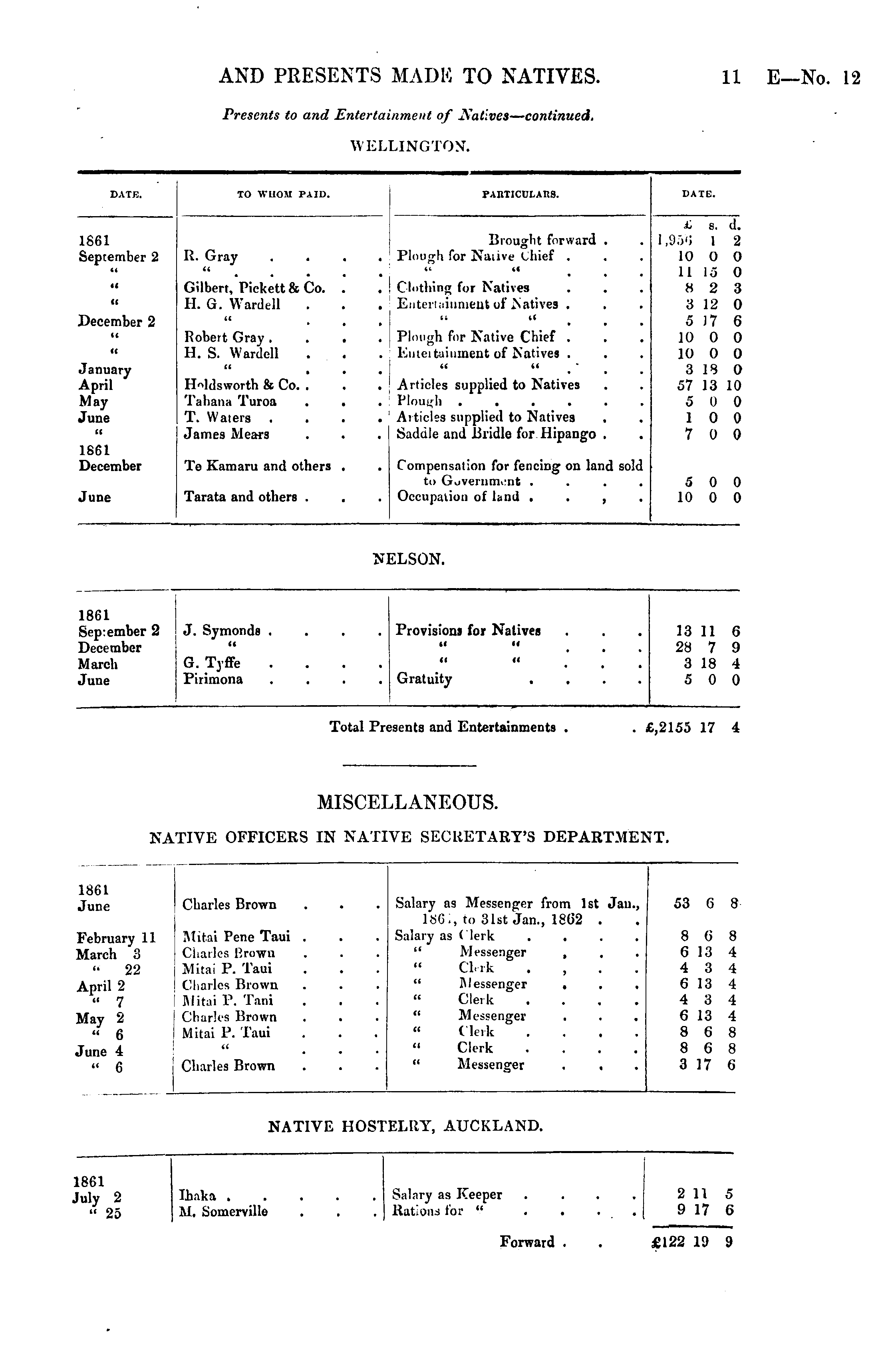 'resents to am Entertai Inment of Natives — continue* WEL LINGTOX. DATE. TO WHOM PAID. PARTICULARS. DATE. 1861 September 2 u II It December 2 ii R. Gray u Gilbert, Pickett& Co. . H. G. VVardell . ii Robert Gray . H. S. Wardell ■ • Brought forward . Plough for Naiive Chief . U If Clothing for Natives EnterUiiiimeut of Natives . II X Plough for Native Chief . . . Euteituiiiinent of Natives . £ e. d. I ,95<i 1 1 10 0 0 11 15 0 8 2 3 3 12 0 5 17 6 10 0 0 10 0 0 3 IS 0 57 13 10 5 0 0 1 0 0 7 0 0 tc January April May June M It • • H^ldsworth & Co. . Taliana Turoa . . T. Waters . James Mea*s * Articles supplied to Natives Plough Articles supplied to Natives . Saddle and Bridle for Hipango . 1861 December Te Kamaru and others . Compensation for fencing on land sold to Government . Occupation of land , . , 5 0 0 10 0 0 June Tarata and others .