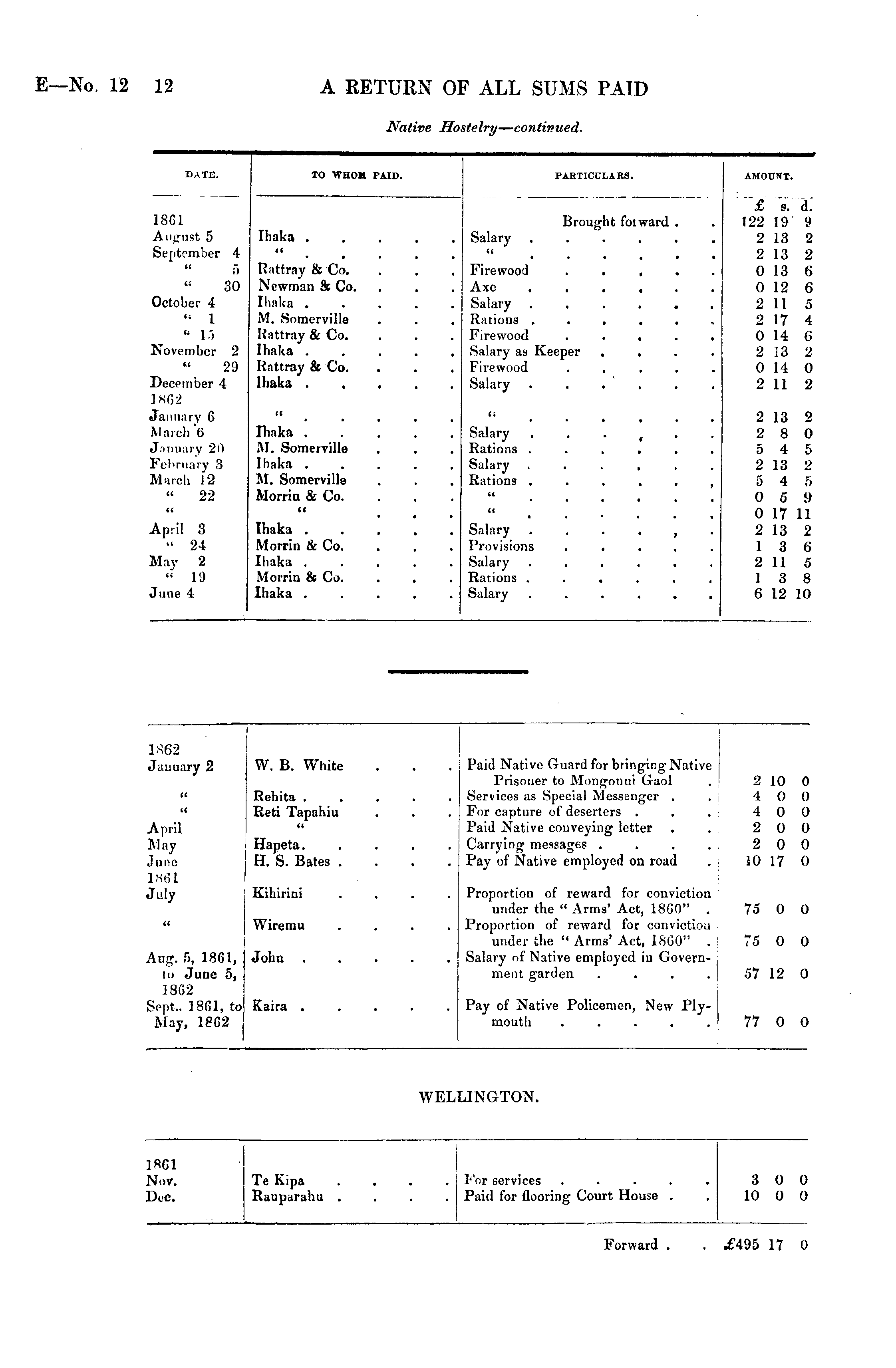 Va '.ive \ry — con Hnuei DATE. TO WHOM PAID. PARTICULARS. AMOUNT. 18G1 August 5 September 4 " ;") " 30 October 4 " I " i:> November 2 29 December 4 1862 Jamiiirv 6 March 6 January 20 February 3 March 12 " 22 Thaka . ii Rattray & Co. Newman & Co. Ihska . M. Snmerville Rattray & Co. Ihaka . Rattray & Co. Ihaka . Brought forward . Salary u Firewood .... Axo ..... Salary ..... Rations ..... Firewood .... .Salary as Keeper . Firewood .... Salary . . . a £ s. d. 122 19 9 2 13 2 2 13 2 0 13 6 0 12 6 2 11 5 2 17 4 0 14 6 2 13 2 0 14 0 2 11 2 M ii 2 13 2 2 8 0 5 4 5 2 13 2 5 4 5 0 5 9 0 17 11 2 13 2 1 3 6 2 11 5 1 3 8 6 12 10 Ihaka . M. Somerville Ihaka . M. Somerville Morrin & Co. IC Salary . . . , . Rations ..... Salary ..... Rations (C t ii II April 3 « 24 May 2 " 19 June 4 Ihaka . Morrin & Co. Ihaka . Morrin & Co. Ihaka . Salary , Provisions .... Salary ..... Rations ..... Salary ..... 1862 January 2 ii u W. B. White Rehita . Reti Tapahiu ii Paid Native Guard for bringing Native Prisoner to Mongonui Gaol Services as Special Messenger . For capture of deserters . Paid Native couveying letter Carrying messages . Pay of Native employed on road 2 10 4 0 4 0 2 0 2 0 10 17 0 O 0 O 0 0 April May June 1861 July Hapeta. H. S. Bates . • Kiliirini Proportion of reward for conviction ; under the " Arms' Act, 1860" . Proportion of reward for conviction under the " Arms' Act, 1800" . | Salary of Native employed in Govern- j merit garden . . . .1 Pay of Native Policemen, New Plymouth ..... 75 0 75 0 57 12 77 0 O 0 0 0 ii Wiremu Aug. 5, 1861, in June 5, 18G2 Sept.. 18fil, to May, 18G2 John Kaira .