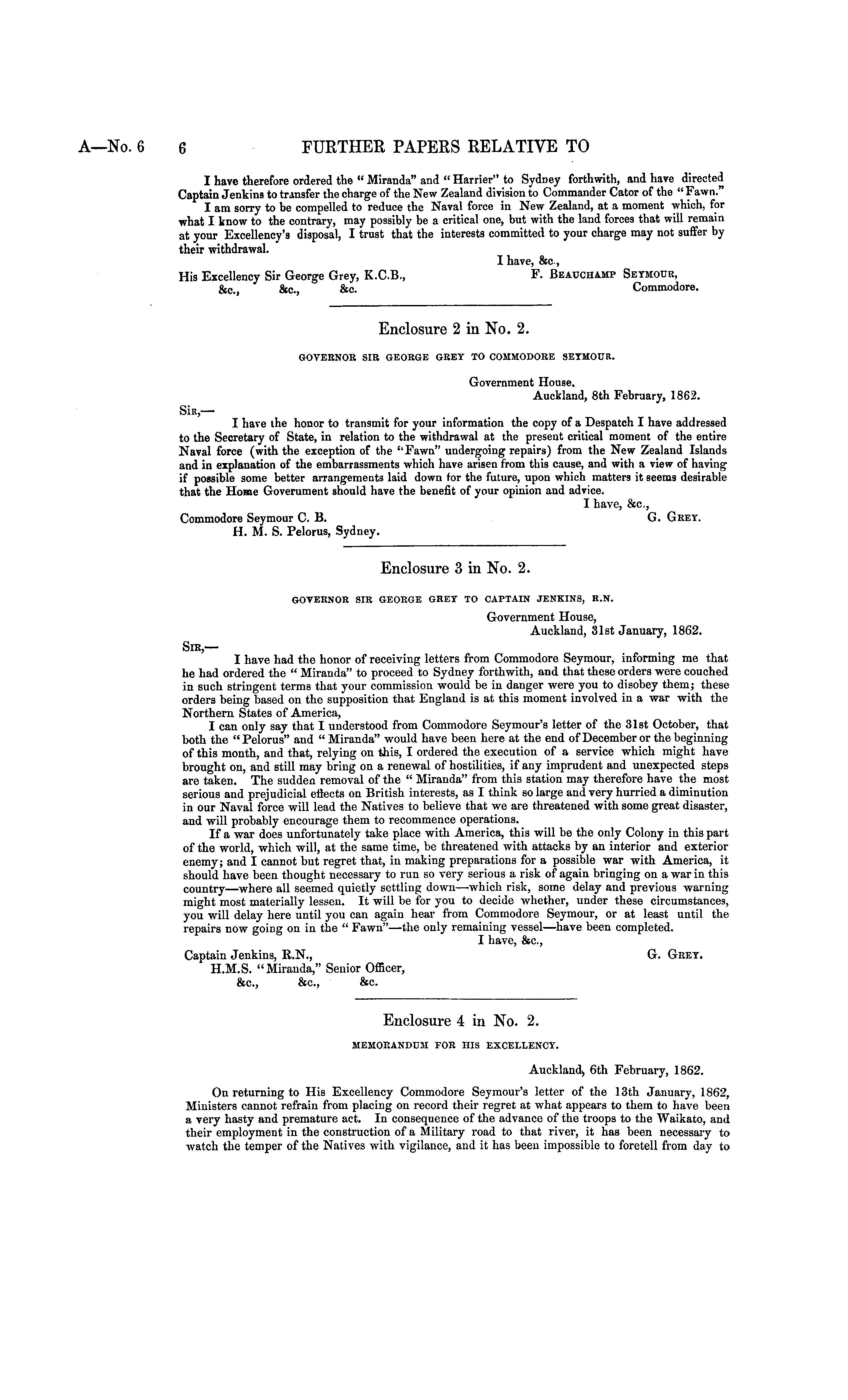 Enclosure 2 in No. 2. GOVERNOR SIR GEORGE GREY TO COMMODORE SEYMOUR. Government House. Auckland, 8th February, 1862. Sir, — I have ihe honor to transmit for your information the copy of a Despatch I have addressed to the Secretary of State, in relation to the withdrawal at the present critical moment of the entire Naval force (with the exception of the ''Fawn" undergoing repairs) from the New Zealand Islands and in explanation of the embarrassments which have arisen from this cause, and with a view of having if possible some better arrangements laid down tor the future, upon which matters it seems desirable that the Home Government should have the benefit of your opinion and advice. I have, &c, Commodore Seymour C. B. G. Grey. H. M. S. Pelorus, Sydney.