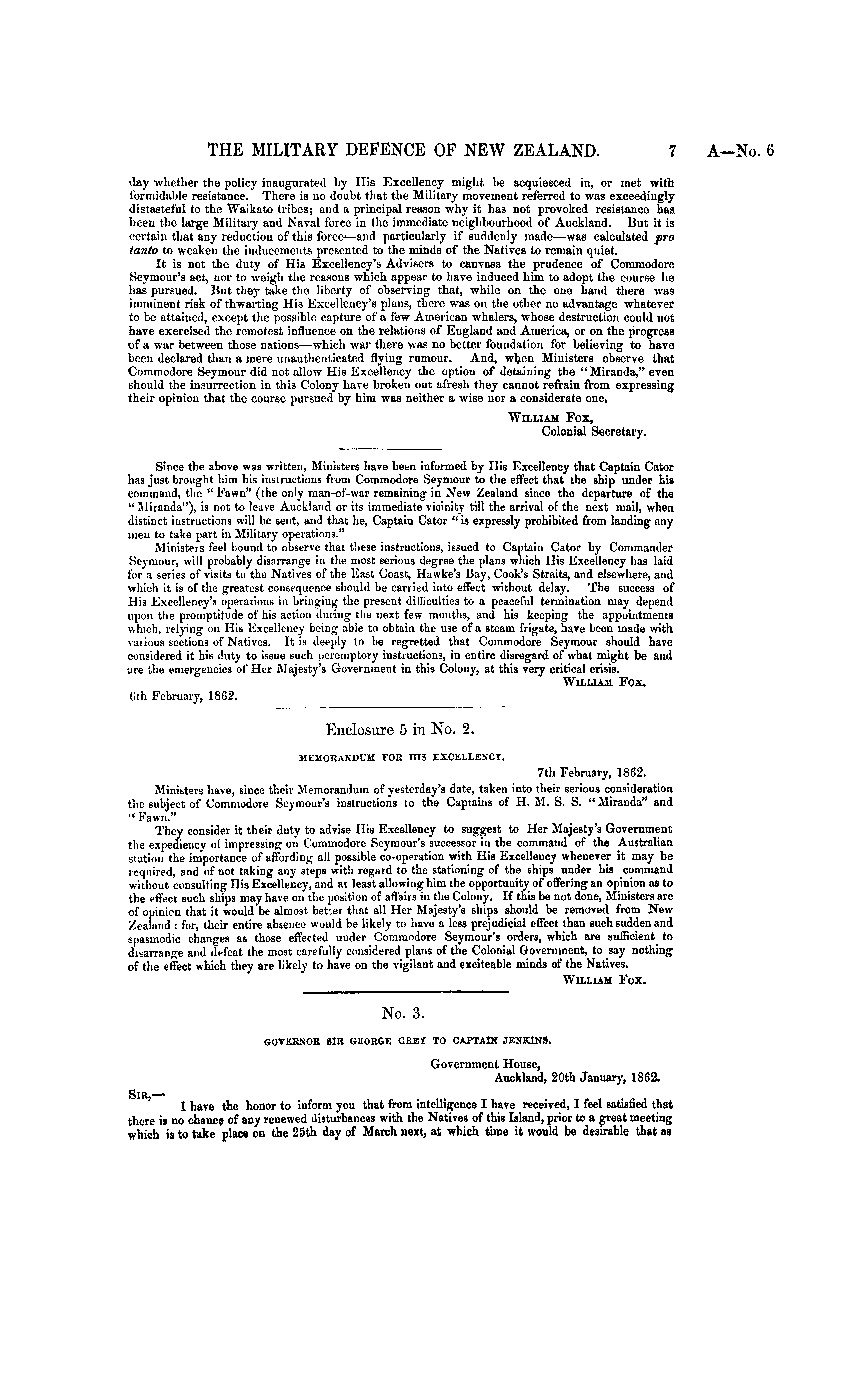 No. 3. GOVERNOR 8IR GEORGE GEET. TO CAPTAIN JENKINS. Government House, Auckland, 20th January, 1862. Sir —— I have the honor to inform you that from intelligence I have received, I feel satisfied that there is no chance of any renewed disturbances with the Natives of this Island, prior to a great meeting •which is to take place on the 25th day of March nest, at which time it would be desirable that as