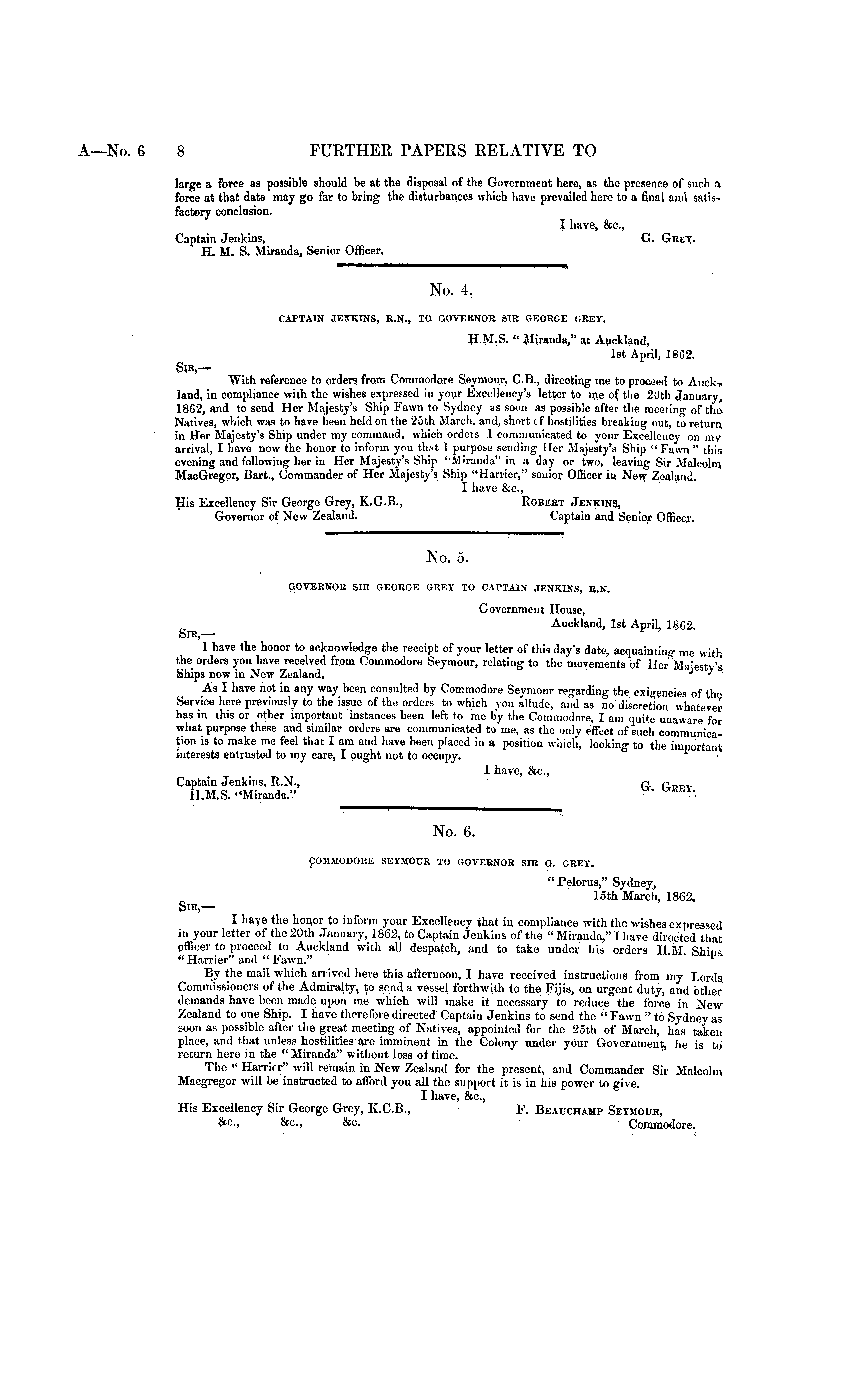 large a force as possible should be at the disposal of the Government here, as the presence of such a force at that date may go far to bring the disturbances which have prevailed here to a final and satisfactory conclusion. I have, &c, Captain Jenkins, G. Grey. H. M. S. Miranda, Senior Officer.