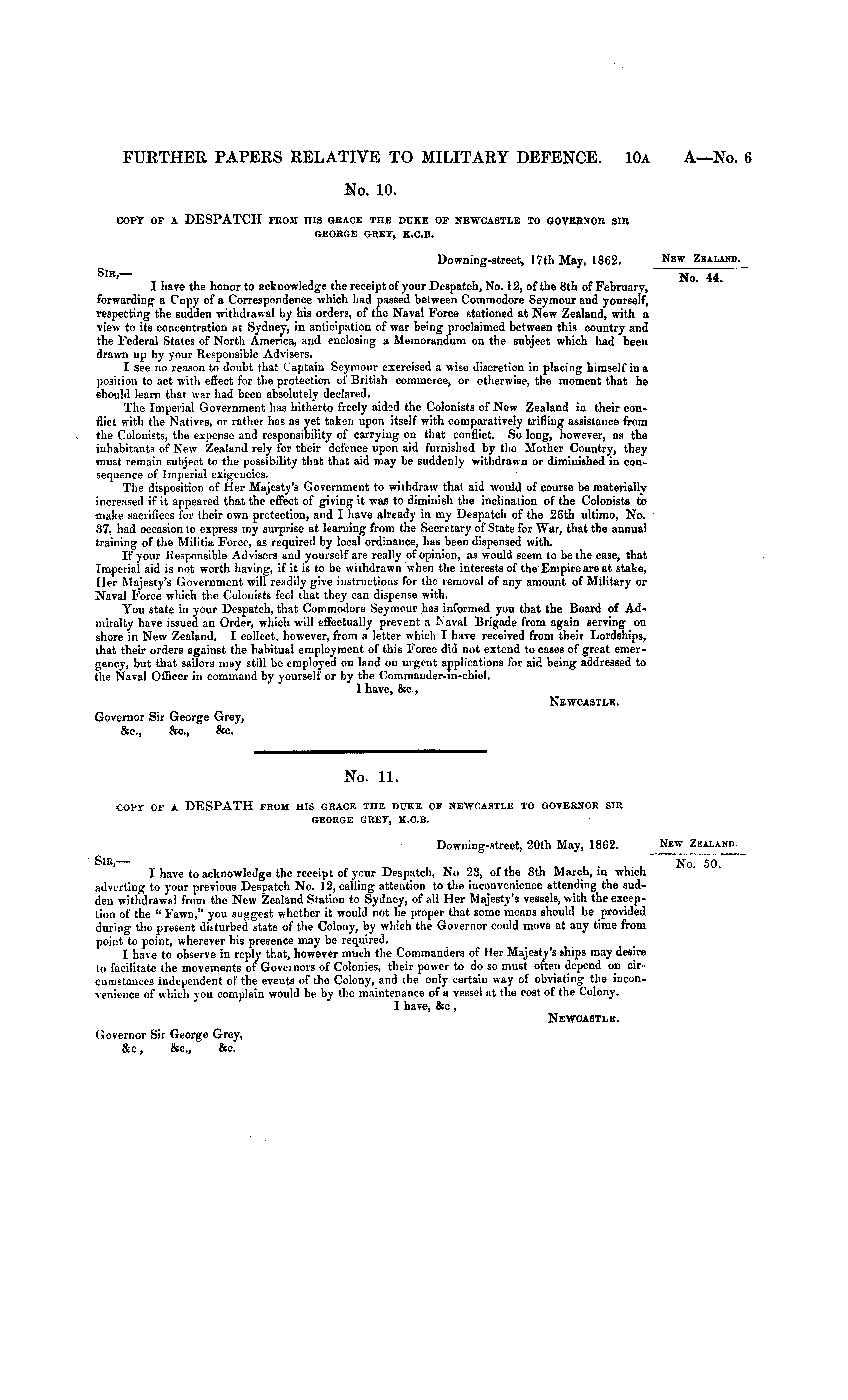 COPT OF A DESPATCH FROM HIS GRACE THE DUKE OP NEWCASTLE TO GOVERNOR SIR GEORGE GREY, K.C.B. Downing-street, 17th May, 1862. Sir,— I have the honor to acknowledge the receipt of your Despatch, No. 12, of the 8th of February, forwarding a Copy of a Correspondence which had passed between Commodore Seymour and yourself, respecting the sudden withdrawal by his orders, of the Naval Force stationed at New Zealand, with a. view to its concentration at Sydney, in anticipation of war being proclaimed between this country and the Federal States of North America, and enclosing a Memorandum on the subject which had been drawn up by your Responsible Advisers. I see no reason to doubt that Captain Seymour exercised a wise discretion in placing himself in a position to act with effect for the protection of British commerce, or otherwise, the moment that he should learn that war had been absolutely declared. The Imperial Government has hitherto freely aided the Colonists of New Zealand in their conflict with the Natives, or rather hss as yet taken upon itself with comparatively trifling assistance from the Colonists, the expense and responsibility of carrying on that conflict. So long, however, as the inhabitants of New Zealand rely for their defence upon aid furnished by the Mother Country, they must remain subject to the possibility that that aid may be suddenly withdrawn or diminished in consequence of Imperial exigencies. The disposition of Her Majesty's Government to withdraw that aid would of course be materially increased if it appeared that the effect of giving it was to diminish the inclination of the Colonists to make sacrifices for their own protection, and I have already in my Despatch of the 26th ultimo, No. 37, had occasion to express my surprise at learning from the Secretary of State for War, that the annual training of the Militia Force, as required by local ordinance, has been dispensed with. If your Responsible Advisers and yourself are really of opinion, as would seem to be the case, that Imperial aid is not worth having, if it is to be withdrawn when the interests of the Empire are at stake, Her Majesty's Government will readily give instructions for the removal of any amount of Military or Naval Force which the Colonists feel that they can dispense with. You state in your Despatch, that Commodore Seymour has informed you that the Board of Admiralty have issued an Order, which will effectually prevent a .Naval Brigade from again serving on shore in New Zealand. I collect, however, from a letter which I have received from their Lordships, that their orders against the habitual employment of this Force did not extend to cases of great emergency, but that sailors may still be employed on land on urgent applications for aid being addressed to the Naval Officer in command by yourself or by the Commander-in-chief. I have, &c, Newcastle. Governor Sir George Grey, &c, &c, &c.