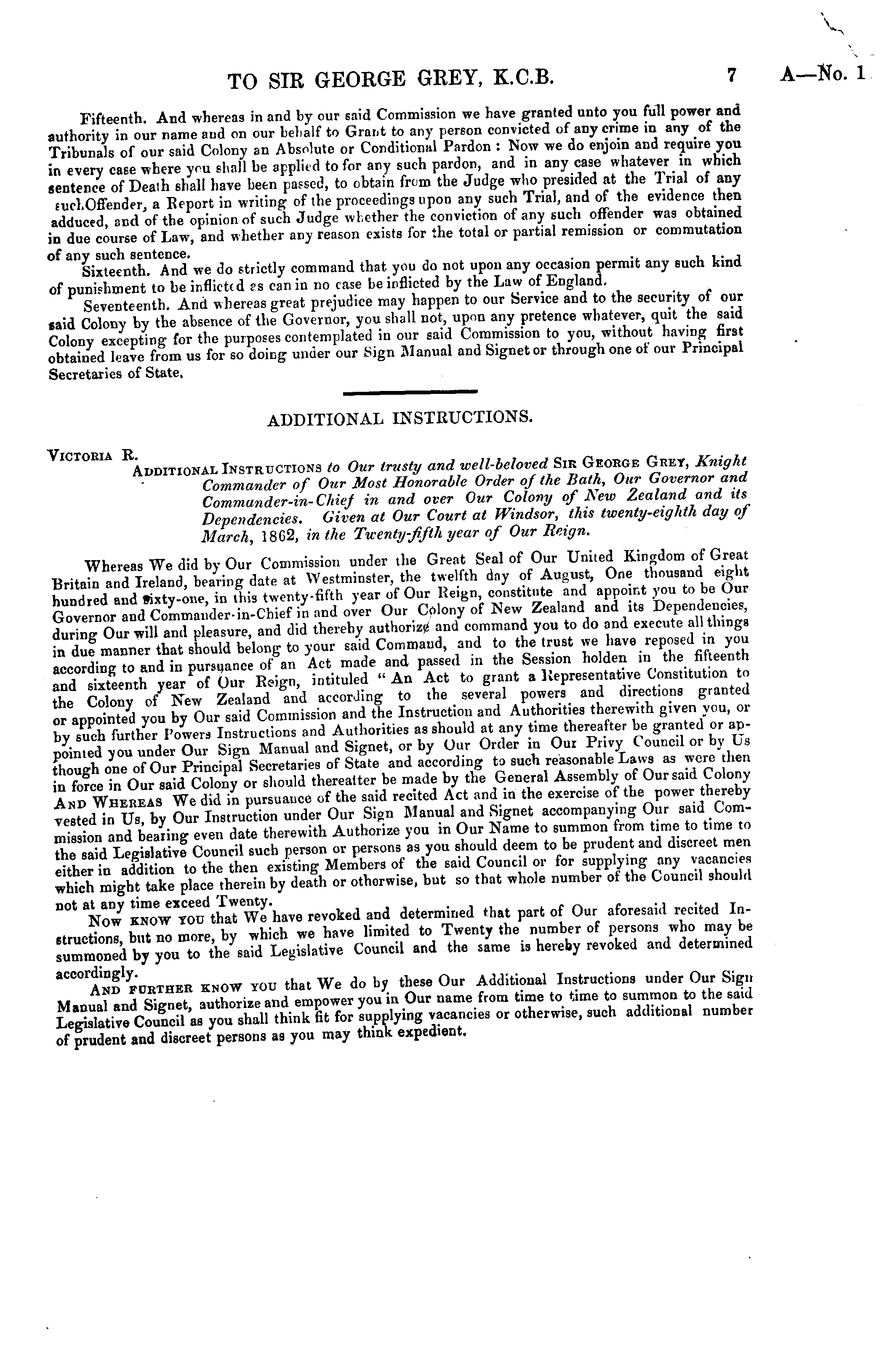 ADDITIONAL INSTRUCTIONS. Victoria R Jn ' noNB t0 Our trmty and we ll-beloved Sir George Grey, Knight Commander of Our Most Honorable Order of the Bath, Our Governor and Commander-in-Chief in and over Our Colony of JSew Zealand and its Dependencies. Given at Our Court at Windsor, this twenty-eighth day of March, 1862, in the Twenty-fifth year of Our Reign. Whereas We did by Our Commission under the Great Seal of Our United Kingdom of Great Brita^ and Ireland, bearing date at Westminster, the twelfth day of August, One thousand eight hundred and ««tv-one in this twenty-fifth year of Our Reign, constitute and appoint you to be Our GoveraorandCommnuder-in-Chiefinando^er Our Colony of New Zealand and its Dependences durini Our will and pleasure, and did thereby authorise and command you to do and execute all dnngg n duf—r that snould belong to your sa.d Command, and to the trust we have reposed in .jo» tn «nd in rmriuance of an Act made and passed in the Session nolden in the nttetntn and tteenth vearTour E ign, intituled «An PAct to grant a Representative Constitute to the Coony o/ New Zealand and according to the several powers and directions granted S applted you by Our said Commission and the Instruction and Authorities therewith given you, or bvSfurthw Powers Instructions and Authorities as should at any tome thereafter be granted or apnoimedvou under Our Sign Manual and Signet, or by Our Order in Our Privy Council or by Ls thOuLhone of <£ Principal Secretaries of State and according to such reasonable Laws as were then n fofce in Our said Colony or should thereafter be made by the General Assembly of Our said Colony And Wherels We did in pursuance of the said recited Act and in the exercise of the power thereby vested in Us by Our Instruction under Our Sion Manual and Signet accompanying Our said CommTssion "nd bearing even date therewith Authorize you in Our Name to summon from time to time to r a"d LelTativf Council such person or persons as you should deem to be prudent and discreet men either in add tion to the then existing Members of the said Council or for supplying any vacanc, which might take place therein by death or otherwise, but so that whole number or the Council should DOt 2 KNOwTu'tiSwrhave revoked and determined that part of Our aforesaid recited Instruction! hntZ more, by which we have limited to Twenty the number of persons who may be !umrnonedbyyou to the^aid Legislative Council and the same is hereby revoked and determined accordingly. We these Qur A(ld ; ti ! I nstructionB under Our Sign And FDKiHKK "« empower you in Our name from time to time to summon to the sa.d l^to<^»l^**^k *» -PP^g r Cai'CieS °r °therWiSe> SUCh additioDal nUmbCr of prudent and discreet persons as you may think expedient.