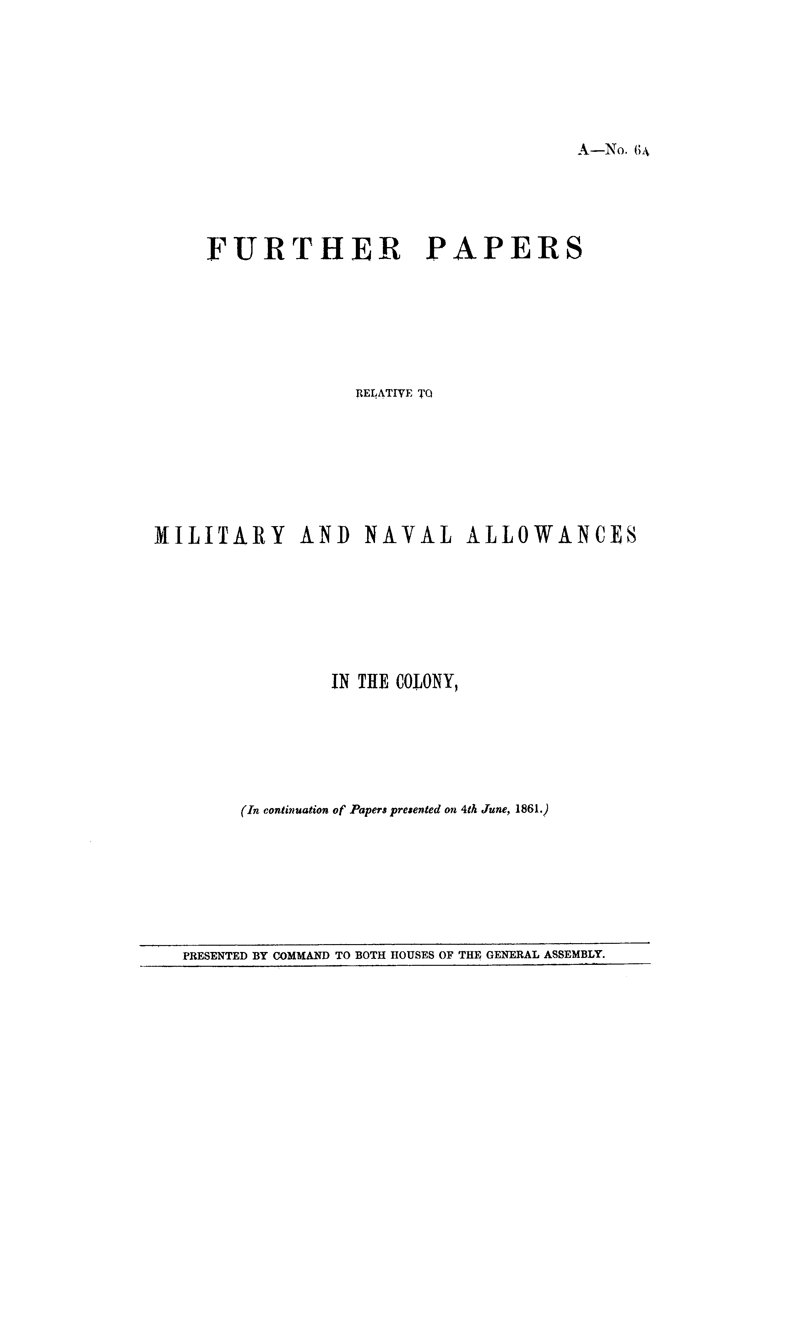 FURTHER PAPERS RELATIVE TO MILITARY AND NAVAL ALLOWANCES IN THE COLONY, (In continuation of Papers presented on 4th June, 1861. )
