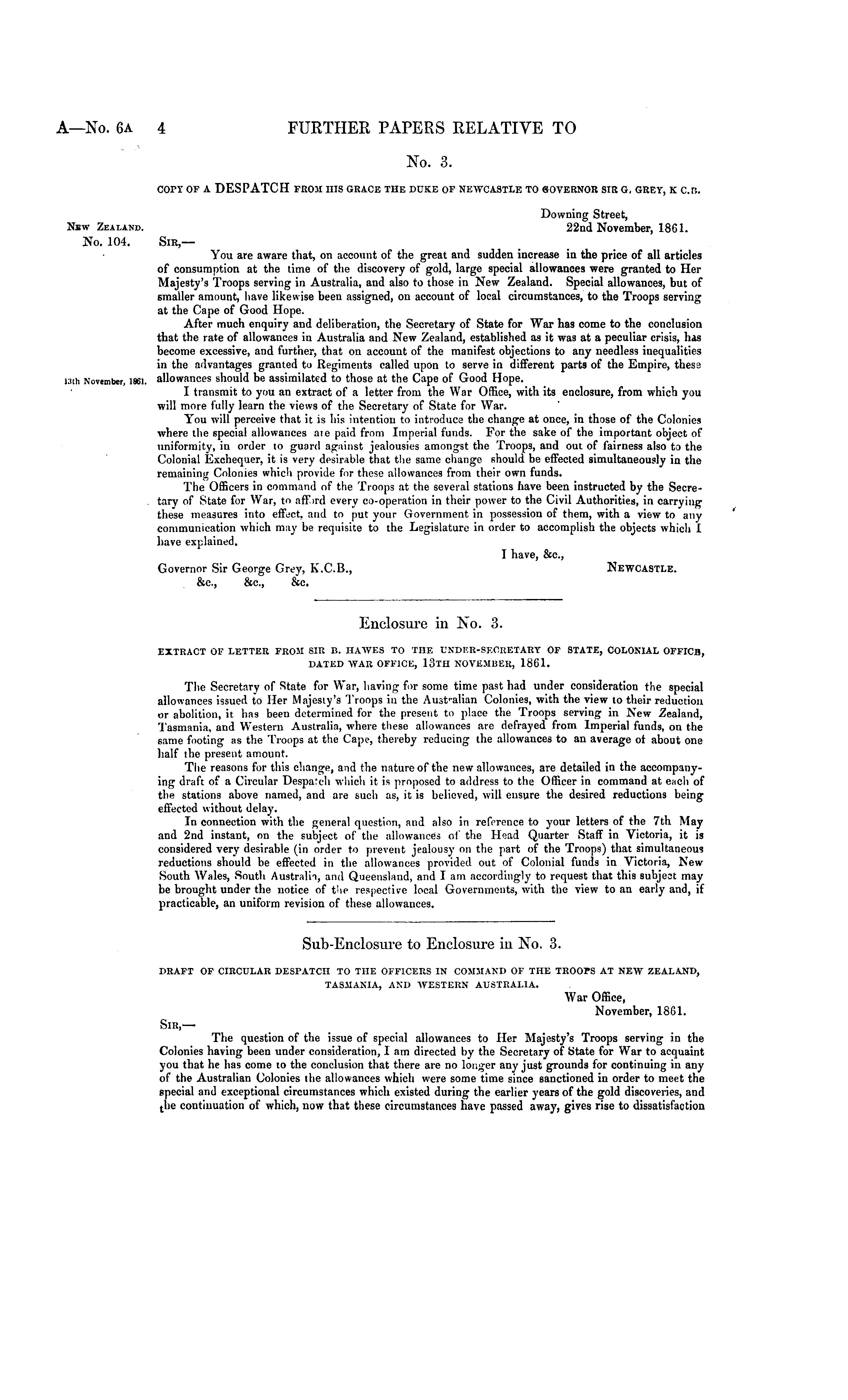 copy of a DESPATCH from his grace the duke of Newcastle to governor sir g, grey, k c.r:. Downing Street, 22nd November, 1861. Sir,— You are aware that, on account of the great and sudden increase in the price of all articles of consumption at the time of the discovery of gold, large special allowances were granted to Her Majesty's Troops serving in Australia, and also to those in New Zealand. Special allowances, but of smaller amount, have likewise been assigned, on account of local circumstances, to the Troops serving at the Cape of Good Hope. After much enquiry and deliberation, the Secretary of State for War has come to the conclusion that the rate of allowances in Australia and New Zealand, established as it was at a peculiar crisis, has become excessive, and further, that on account of the manifest objections to any needless inequalities in the advantages granted to Regiments called upon to serve in different parts of the Empire, thesa allowances should be assimilated to those at the Cape of Good Hope. I transmit to you an extract of a letter from the War Office, with its enclosure, from which you will more fully learn the views of the Secretary of State for War. You will perceive that it is his intention to introduce the change at once, in those of the Colonies where the special allowances ate paid from Imperial funds. For the sake of the important object of uniformity, in order to guard against jealousies amongst the Troops, and out of fairness also to the Colonial Exchequer, it is very desirable that the same change should be effected simultaneously in the remaining Colonies which provide for these allowances from their own funds. The Officers in command of the Troops at the several stations have been instructed by the Secretary of State for War, to aff.ird every co-operation in their power to the Civil Authorities, in carrying these measures into effect, and to put your Government in possession of them, with a view to any communication which may be requisite to the Legislature in order to accomplish the objects which I have explained. I have, &c, Governor Sir George Grey, X.C.8., Newcastle. &c, &c, &c.