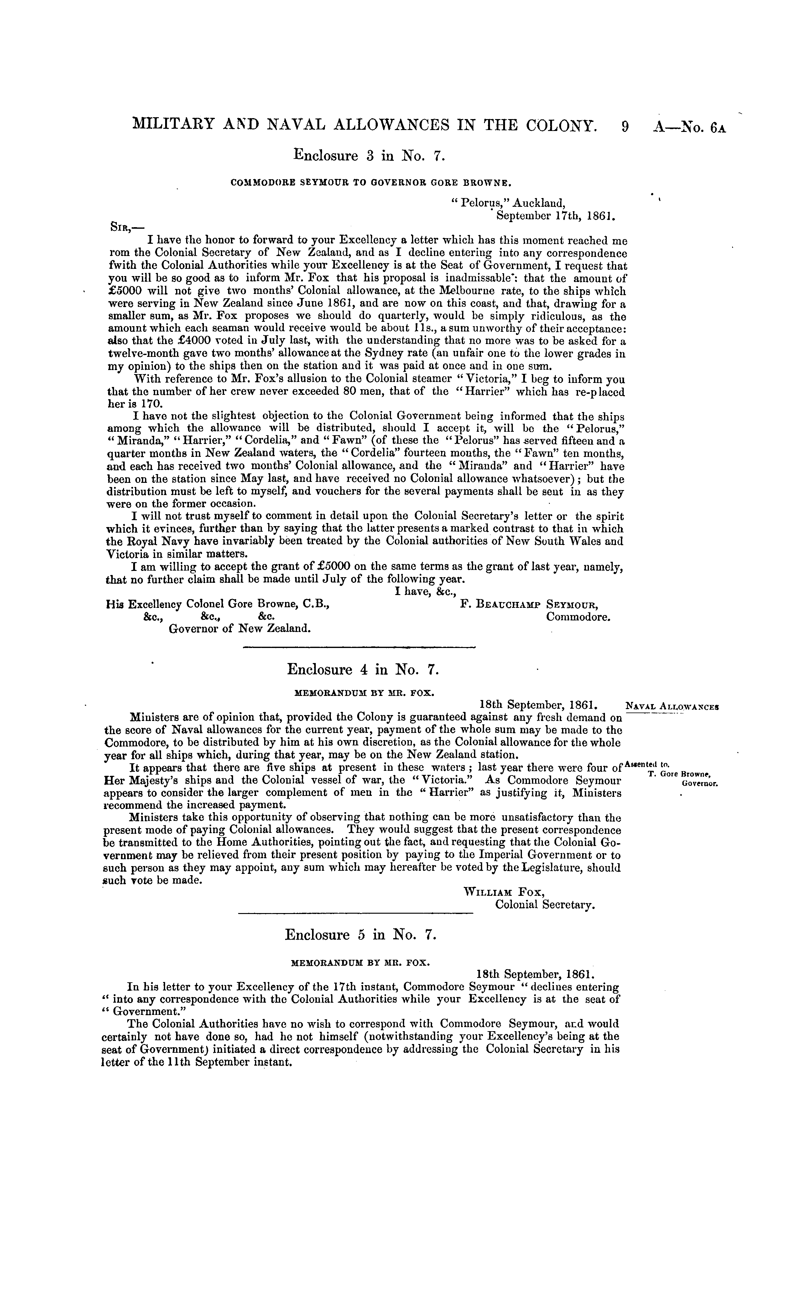 Enclosure 5 in No. 7. MEMORANDUM BY ME. FOX. 18th September, 1861. In his letter to your Excellency of the 17th instant, Commodore Seymour "declines entering " into any correspondence with the Colonial Authorities while your Excellency is at the seat of " Government." The Colonial Authorities have no wish to correspond with Commodore Seymour, ar.d would certainly not have done so, had he not himself (notwithstanding your Excellency's being at the seat of Government) initiated a direct correspondence by addressing the Colonial Secretary in his letter of the 11th September instant.