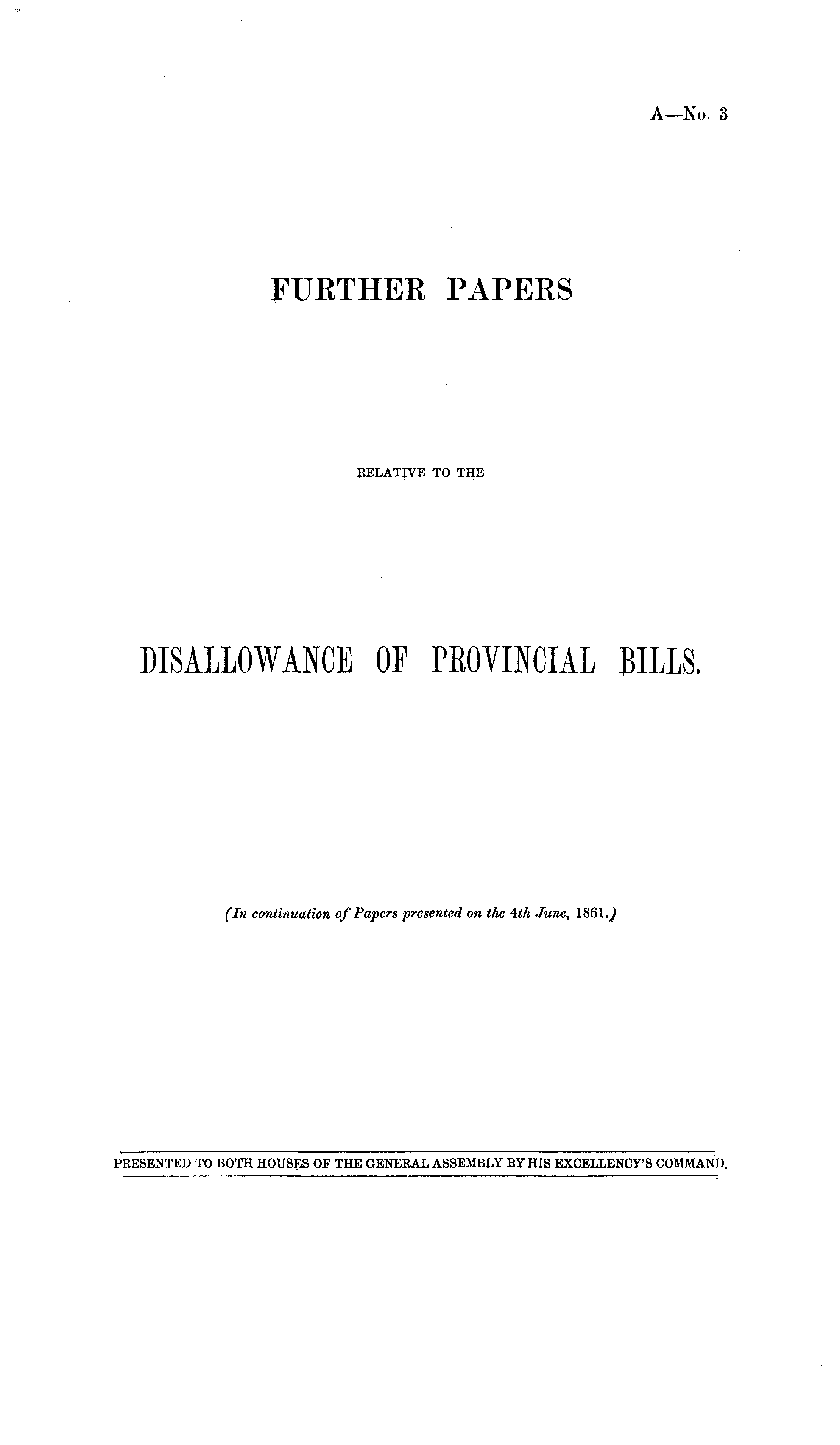FURTHER PAPERS RELATIVE TO THE DISALLOWANCE OF PROVINCIAL BILLS.