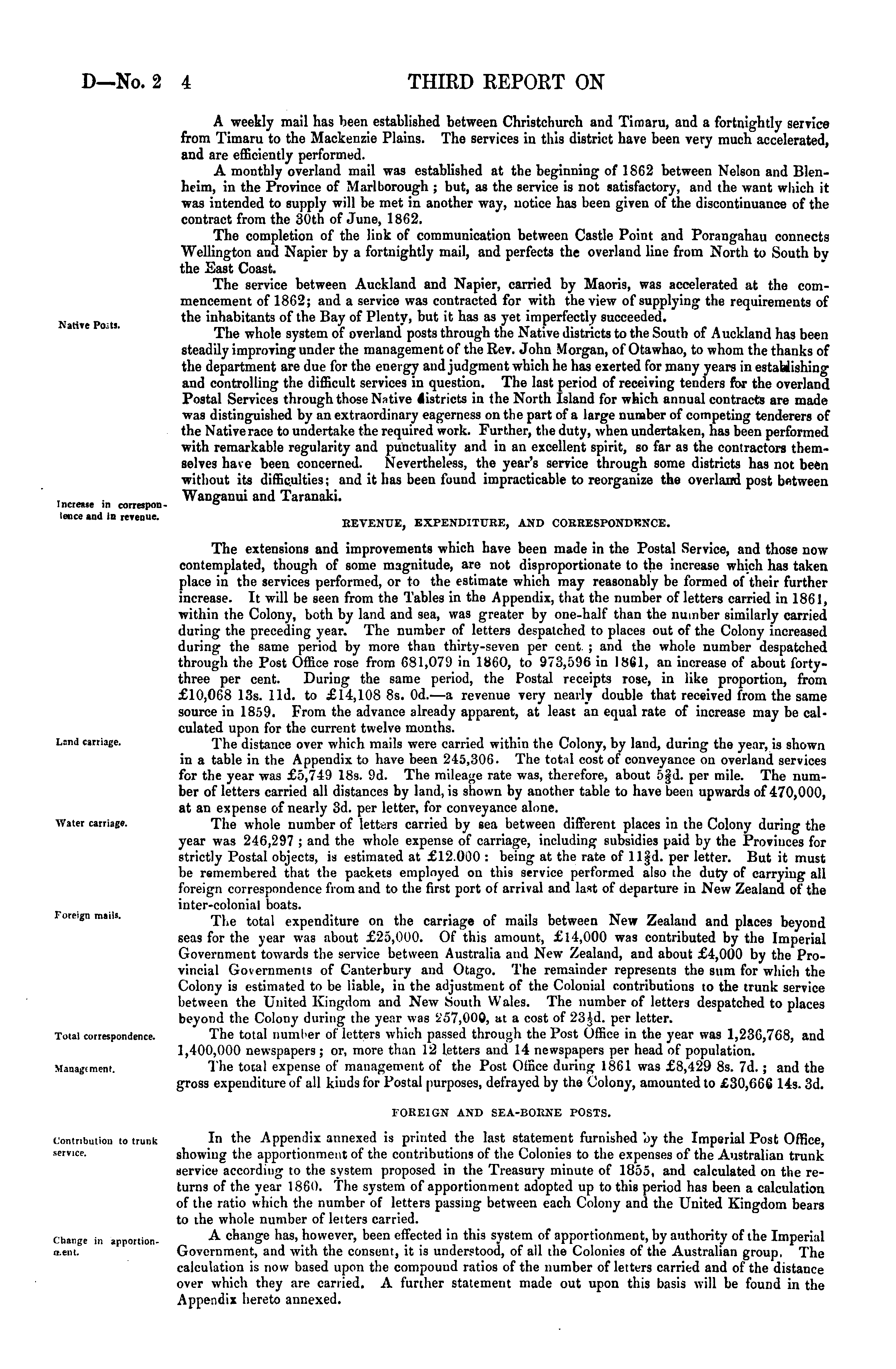 A weekly mail has been established between Christchurch and Timaru, and a fortnightly service from Timaru to the Mackenzie Plains. The services in this district have been very much accelerated, and are efficiently performed. A monthly overland mail was established at the beginning of 1862 between Nelson and Blenheim, in the Province of Marlborough ; but, as the service is not satisfactory, and the want which it was intended to supply will be met in another way, notice has been given of the discontinuance of the contract from the 30th of June, 1862.