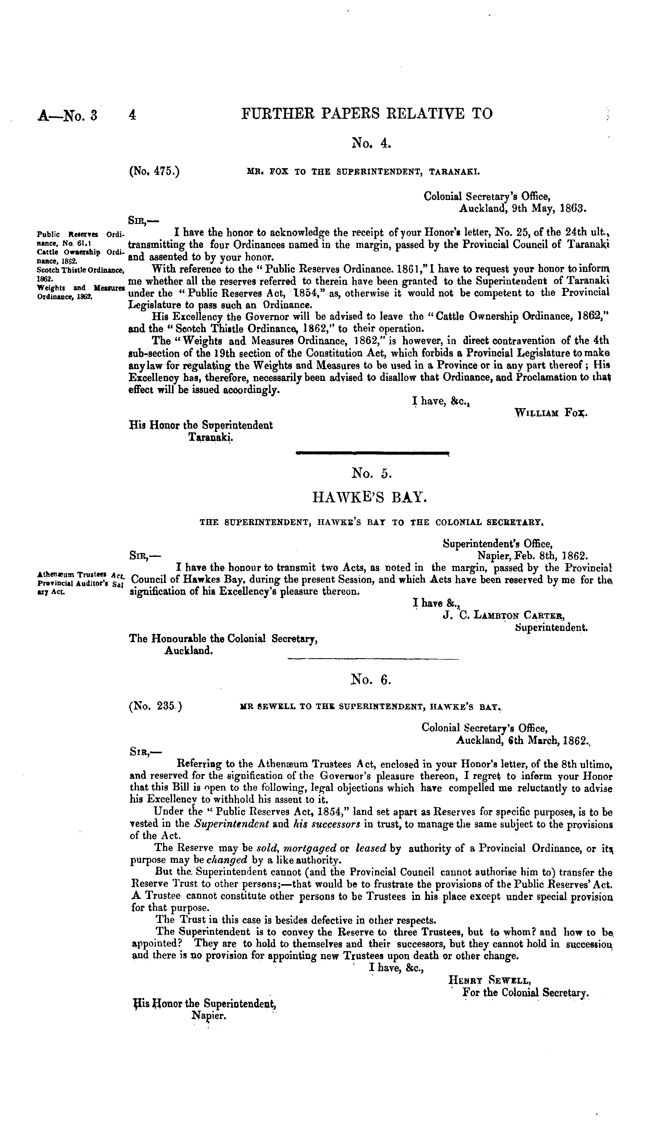 No. 4. (No. 475.) MR. FOX TO THE SUPERINTENDENT, TARANAKI. Colonial Secretary's Office, Auckland, 9th May, 1863. Sir, — I have the honor to acknowledge the receipt of your Honor'i letter, No. 25, of the 24th ult., transmitting the four Ordinances named in the margin, passed by the Provincial Council of Taranaki and assented to by your honor. With reference to the "Public Reserves Ordinance. 1861," I have to request your honor to inform me whether all the reserves referred to therein have been granted to the Superintendent of Taranaki under the " Public Reserves Act, 1854," as, otherwise it would not be competent to the Provincial Legislature to pass such an Ordinance. His Excellency the Governor will be advised to leave the " Cattle Ownership Ordinance, 1862," and the "Scotch Thiitle Ordinance, 1862," to their operation. The " Weights and Measures Ordinance, 1862," is however, in direct contravention of the 4th sub-section of the 19th section of the Constitution Act, which forbids a Provincial Legislature to make any law for regulating the Weights and Measures to be used in a Province or in any part thereof; His Excellency has, therefore, necessarily been advised to disallow that Ordinance, and Proclamation to that effect will be issued accordingly. I have, &c, William Fox. His Honor the Superintendent Taranaki.