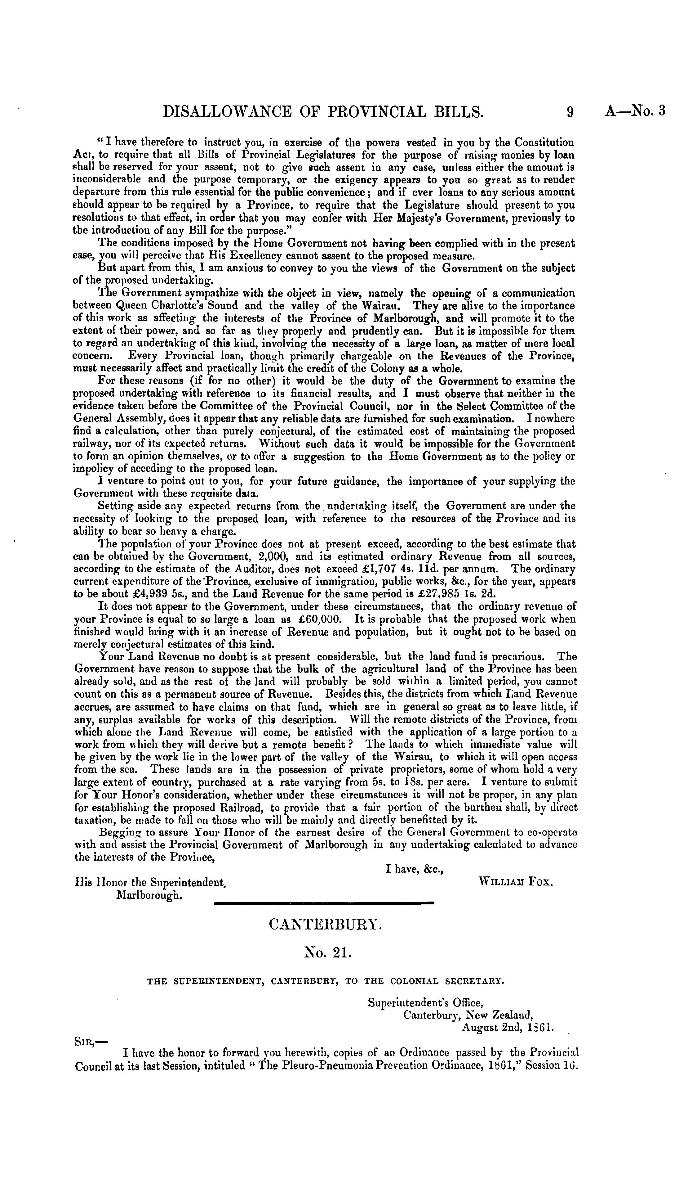 No. 21. THE SUPERINTENDENT, CANTERBURY, TO THE COLONIAL SECRETARY. Superintendent's Office, Canterbury, New Zealand, August 2nd, IS6I. I have the honor to forward you herewith, copies of an Ordinance passed by the Provincial Council at its last Session, intituled " The Pleuro-Pneumonia Prevention Ordinance, lsGl," Session IG.