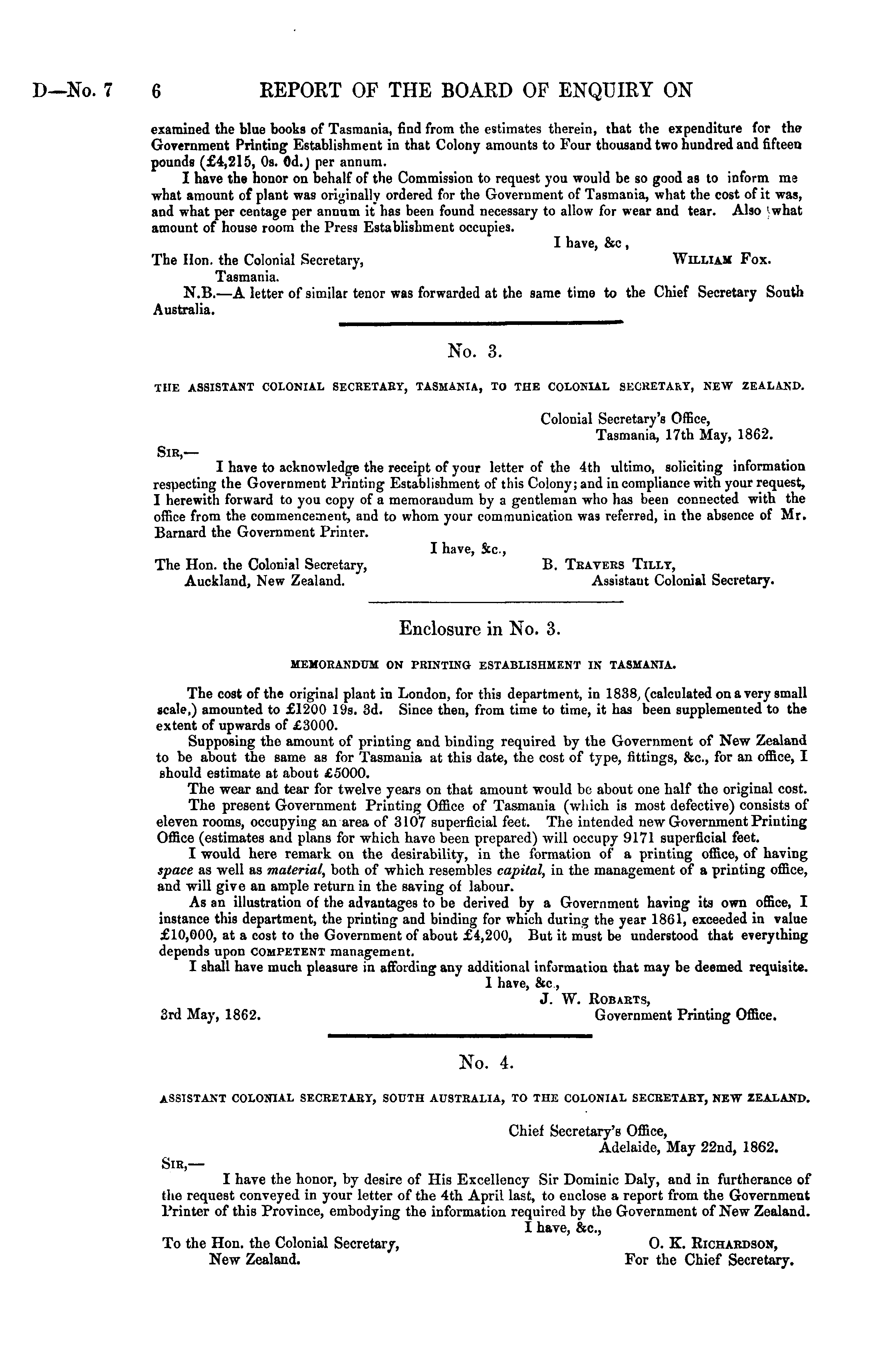 examined the blue books of Tasmania, find from the estimates therein, that the expenditure for theGovernment Printing Establishment in that Colony amounts to Four thousand two hundred and fifteen pounds (£4,215, Os. Od.J per annum. I have the honor on behalf of the Commission to request you would be so good as to inform me what amount of plant was originally ordered for the Government of Tasmania, what the cost of it was, and what per centage per annum it has been found necessary to allow for wear and tear. Also ] what amount of house room the Press Establishment occupies. I have, &c, The Hon. the Colonial Secretary, William Fox. Tasmania. N.B.—A letter of similar tenor was forwarded at the same time to the Chief Secretary South Australia.