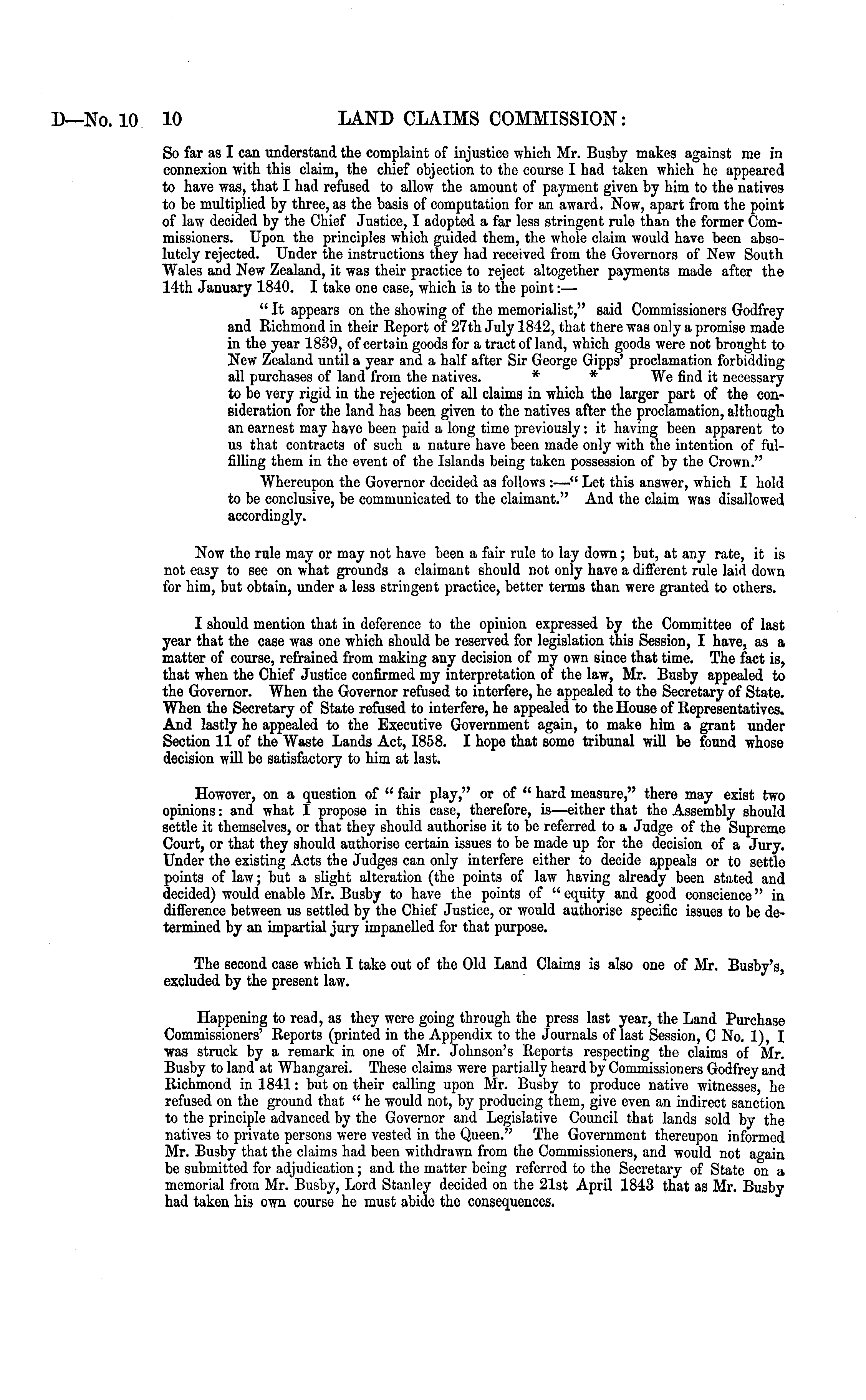 So far as I can understand the complaint of injustice which Mr. Busby makes against me in connexion with this claim, the chief objection to the course I had taken which he appeared to have was, that I had refused to allow the amount of payment given by him to the natives to be multiplied by three, as the basis of computation for an award, Now, apart from the point of law decided by the Chief Justice, I adopted a far less stringent rule than the former Commissioners. Upon the principles which guided them, the whole claim would have been absolutely rejected. Under the instructions they had received from the Governors of New South Wales and New Zealand, it was their practice to reject altogether payments made after the 14th January 1840. I take one case, which is to the point:—