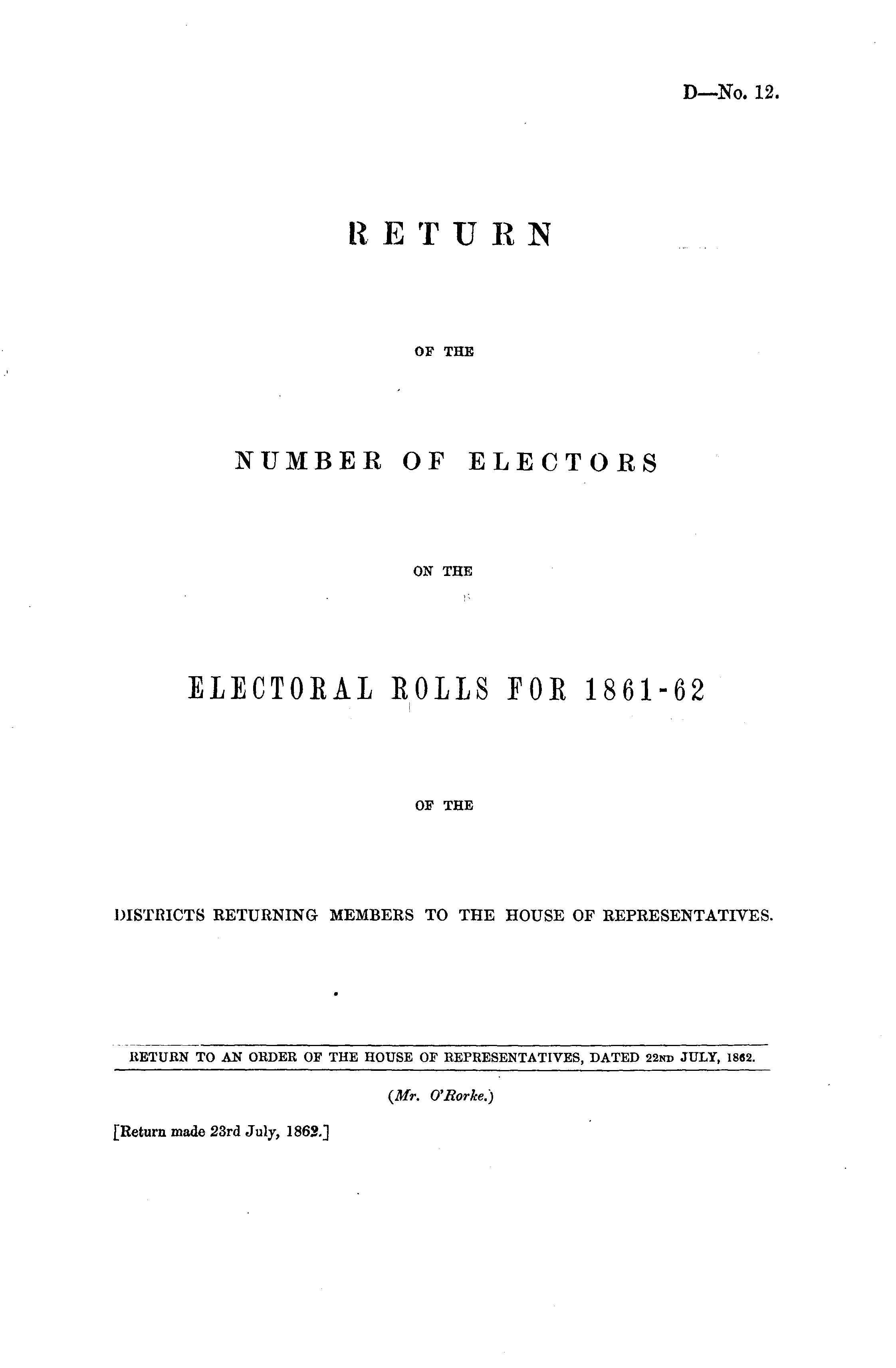 RETURN OF THE NUMBER OF ELECTORS ON THE ELECTORAL ROLLS FOR 1861-62 OF THE DISTRICTS RETURNING MEMBERS TO THE HOUSE OF REPRESENTATIVES.