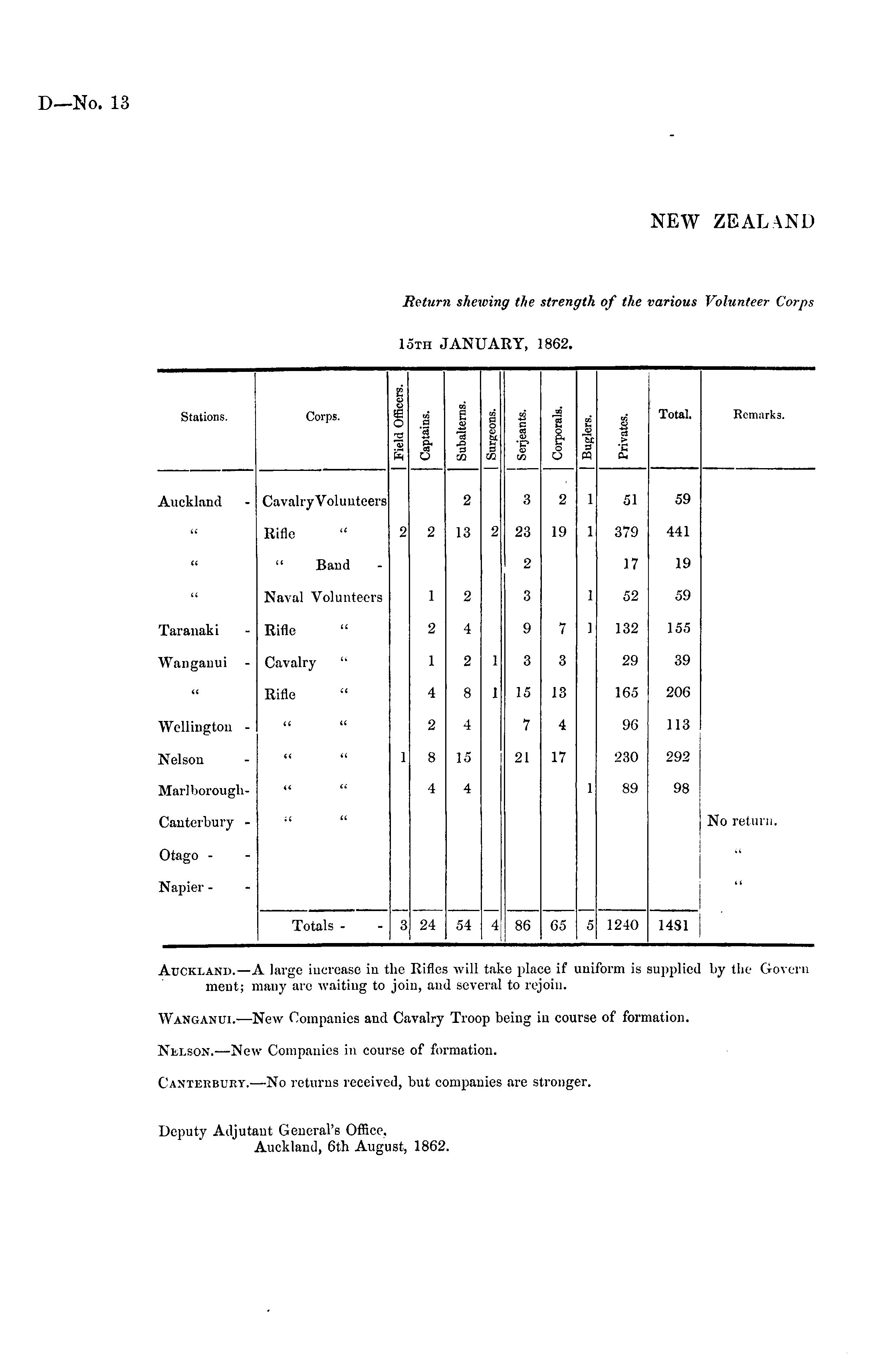Stations. Corps. i B u o I I in A I •I. i 1 us 4 o B pq % Total. Remarks. Auckland Cavalry Volunteers 2 3 2 51 59 a Rifle ta 2;5 1!) 379 441 a " Band 2 17 19 u Naval Volunteers 1 9 3 52 59 faranaki Rifle 2 4 9 7 132 155 Wanganui - Cavalry " 1 2 3 3 29 39 u Rifle 4 8 15 13 165 206 Wellington - U a 2 4 7 4 96 113 Nelson a U 8 I,', 21 17 230 292 Marlborougha ti 4 4 89 98 Canterbury - a a No return. Otago - n Napier - u Totals - 24 64 86 6fi 1240 1431 Auckland. —A large increase iu the Rifles will take place if uuiform is supplied by the Govern ment; many are waiting to join, and several to rejoin. Wanganui.—New Companies and Cavalry Troop being in course of formation. Nblson. —New Companies in course of formation. Canterbury.—No returns received, but companies are stronger. Deputy Adjutant General's Office, Auckland, 6th August, 1862.