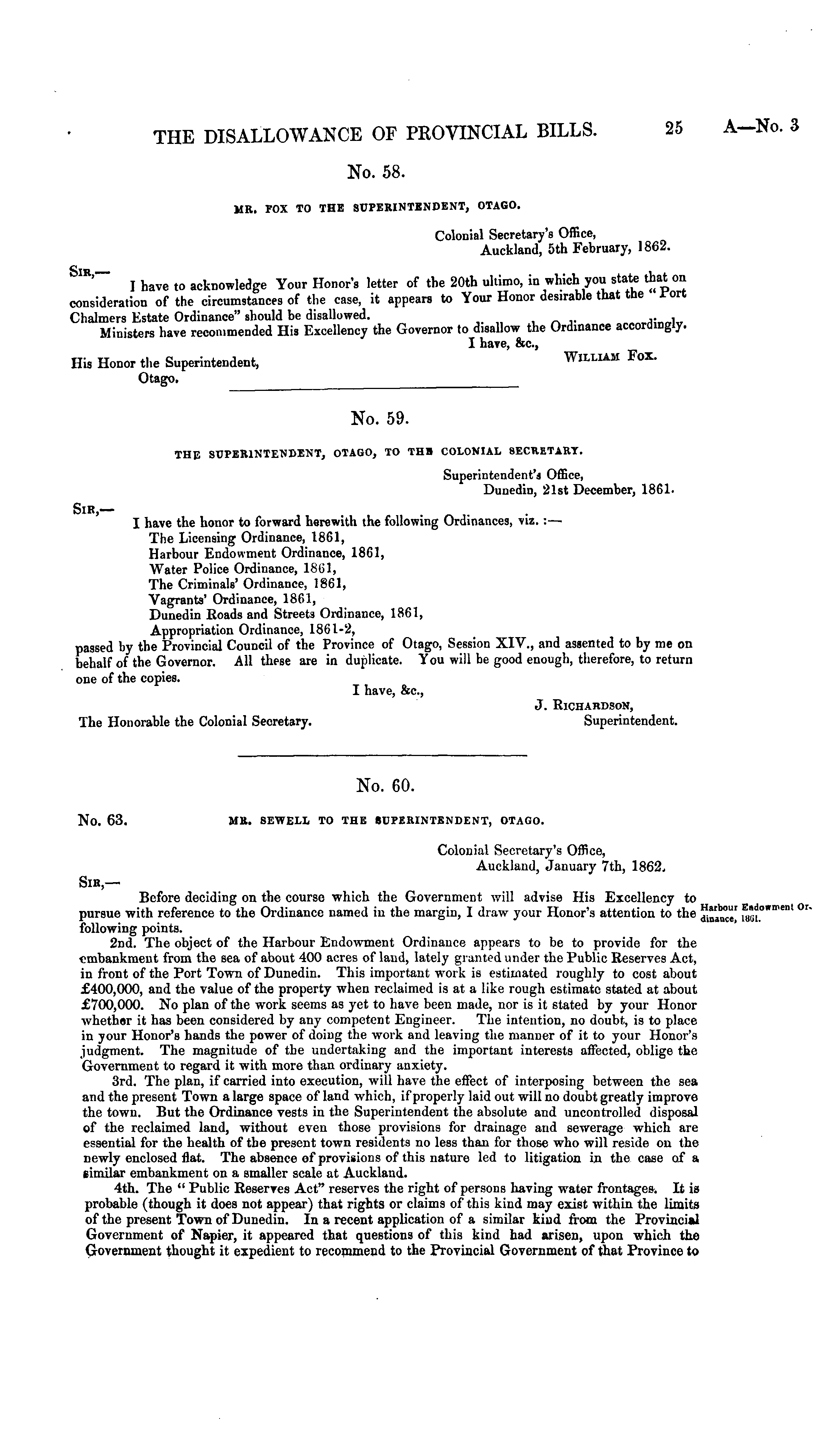 No. 60. No. 63. MR. SEWELL TO THE SUPERINTENDENT, OTAGO. Colonial Secretary's Office, Auckland, January 7th, 1862. Sir,— Before deciding on the course which the Government will advise His Excellency to pursue with reference to the Ordinance named in the margin, I draw your Honor's attention to the J following points. 2nd. The object of the Harbour Endowment Ordinance appears to be to provide for the embankment from the sea of about 400 acres of land, lately granted under the Public Reserves Act, in front of the Port Town of Dunedin. This important work is estimated roughly to cost about £400,000, and the value of the property when reclaimed is at a like rough estimate stated at about £700,000. No plan of the work seems as yet to have been made, nor is it stated by your Honor whether it has been considered by any competent Engineer. The intention, no doubt, is to place in your Honor's hands the power of doing the work and leaving the manner of it to your Honor's judgment. The magnitude of the undertaking and the important interests affected, oblige the Government to regard it with more than ordinary anxiety. 3rd. The plan, if carried into execution, will have the effect of interposing between the sea and the present Town a large space of land which, if properly laid out will no doubt greatly improve the town. But the Ordinance vests in the Superintendent the absolute and uncontrolled disposal of the reclaimed land, without even those provisions for drainage and sewerage which are essential for the health of the present town residents no less than for those who will reside on the newly enclosed flat. The absence of provisions of this nature led to litigation in the case of a similar embankment on a smaller scale at Auckland. 4th. The " Public Reserves Act" reserves the right of persons having water frontages. It is probable (though it does not appear) that rights or claims of this kind may exist within the limits of the present Town of Dunedin. In a recent application of a similar kind from the Provincial Government of Napier, it appeared that questions of this kind had arisen, upon which the Government thought it expedient to recommend to the Provincial Government of that Province to