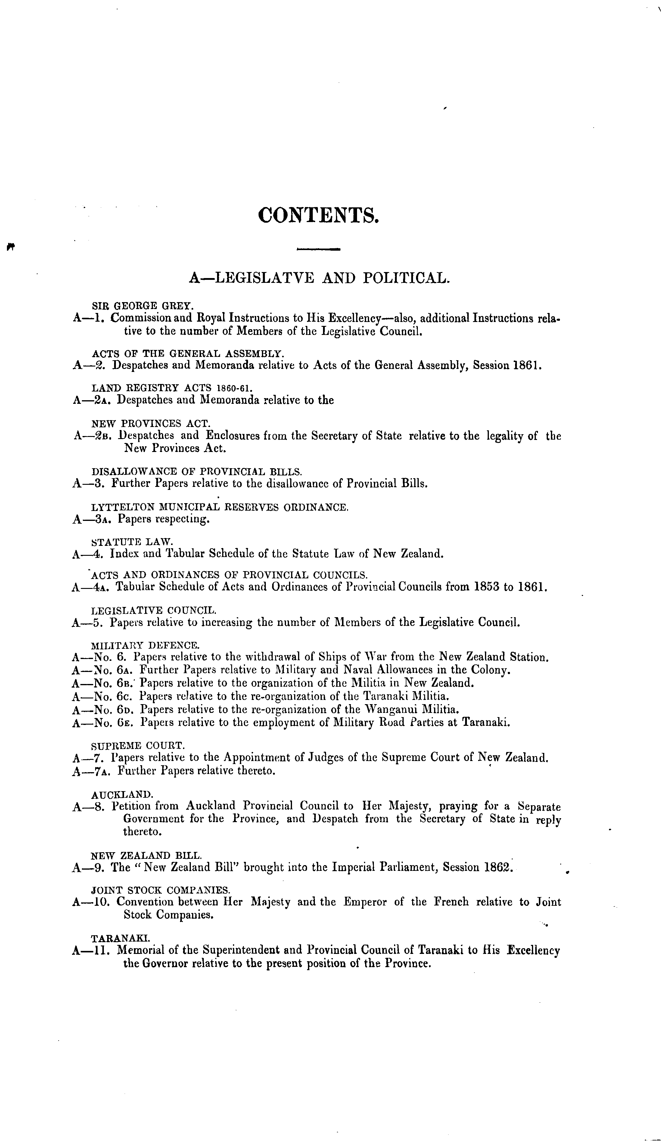 A—LEGISLATVE AND POLITICAL. SIR GEORGE GREY. A—l. Commission and Royal Instructions to His Excellency—also, additional Instructions relative to the number of Members of the Legislative Council. ACTS OF THE GENERAL ASSEMBLY. A— 2. Despatches and Memoranda relative to Acts of the General Assembly, Session 1861. LAND REGISTRY ACTS 1860-61. A—2a. Despatches aud Memoranda relative to the NEW PROVINCES ACT. A— 2b. Despatches and Enclosures from the Secretary of State relative to the legality of the New Proviuces Act. DISALLOWANCE OF PROVINCIAL BILLS. A—3. Further Papers relative to the disallowance of Provincial Bills. LYTTELTON MUNICIPAL RESERVES ORDINANCE. A —3a. Papers respecting. STATUTE LAW. A —4. Index and Tabular Schedule of the Statute Law of New Zealand. 'acts and ordinances of provincial councils. A —4a. Tabular Schedule of Acts and Ordinances of Provincial Councils from 1853 to 1861. LEGISLATIVE COUNCIL. A—s. Papers relative to increasing the number of Members of the Legislative Council. MILITARY DEFENCE. A—No. 6. Papers relative to the withdrawal of Ships of War from the New Zealand Station. A —No. 6a. Further Papers relative to Military and Naval Allowances in the Colony. A—No. 6b.' Papers relative to the organization of the Militia in New Zealand. A —No. 6c. Papers relative to the re-organization of the Taranaki Militia. A —No. 6d. Papers relative to the re-organization of the Wanganui Militia. A—No. 6e. Papers relative to the employment of Military Road Parties at Taranaki. SUPREME COURT. A—7. Papers relative to the Appointment of Judges of the Supreme Court of New Zealand. A—7a. Further Papers relative thereto. AUCKLAND. A—B. Petition from Auckland Provincial Council to Her Majesty, praying for a Separate Government for the Province, and Despatch from the Secretary of State in reply thereto. NEW ZEALAND BILL. A—9. The " New Zealand Bill" brought into the Imperial Parliament, Session 1862. JOINT STOCK COMPANIES. A —lo. Convention between Her Majesty and the Emperor of the French relative to Joint Stock Companies. ■ TARANAKI. A—ll. Memorial of the Superintendent and Provincial Council of Taranaki to His Excellency the Governor relative to the present position of the Province.