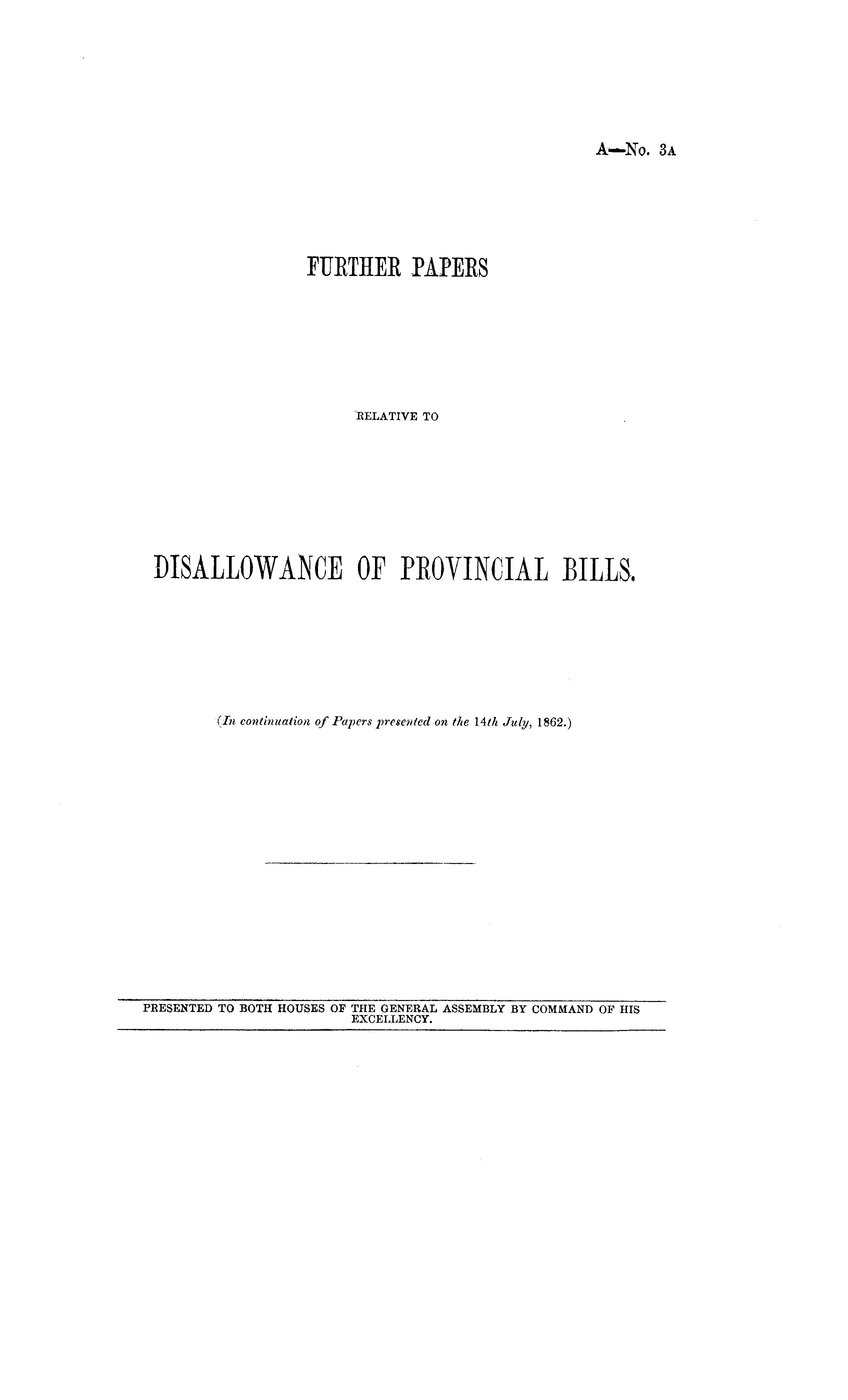 FURTHER PAPERS RELATIVE TO DISALLOWANCE OF PROVINCIAL BILLS. (In continuation of Papers presented on the 14th July, 1862.)