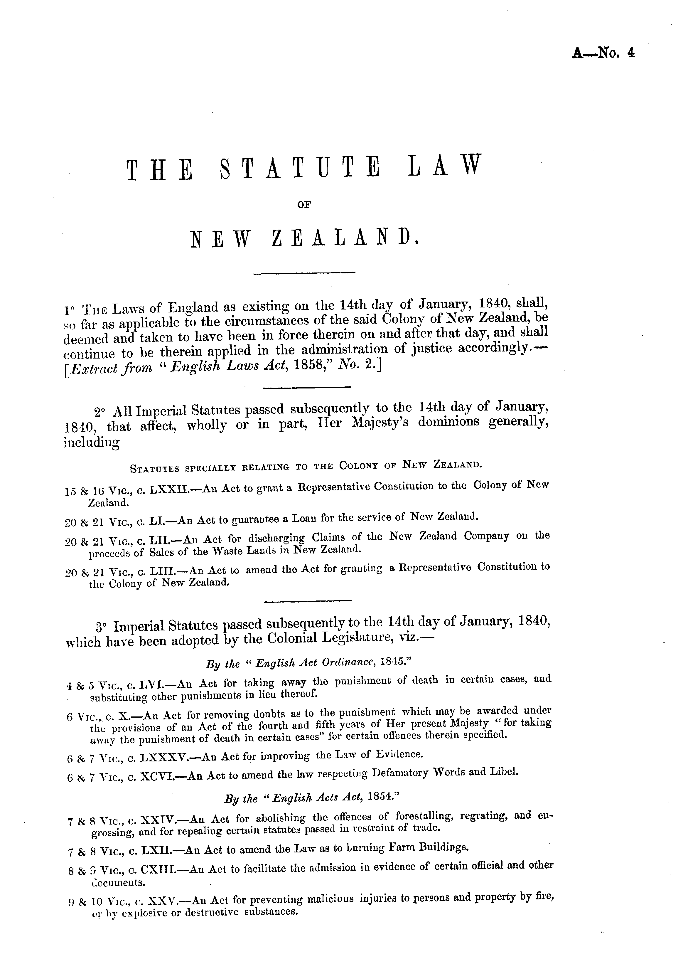 1" The Laws of England as existing on the 14th day of January, 1840, shall, so far as applicable to the circumstances of the said Colony of New Zealand, be deemed and taken to have been in force therein on and after that day, and shall continue to be therein applied in the administration of justice accordingly.— [Extract from "-English Laws Act, 1858," No. 2.] 2° All Imperial Statutes passed subsequently to the 14th day of January, 1840, that affect, wholly or in part, Her Majesty's dominions generally, including Statutes specially relating to the Colony of New Zealand. 15 &16 Vie, c. LXXIL—An Act to grant a Representative Constitution to the Colony of New Zealand. 90 &21 Vie, c. Ll.—An Act to guarantee a Loan for the service of New Zealand. 90 &21 Vie, c. LIL—An Act for discharging Claims of the New Zealand Company on the proceeds'of Sales of the Waste Lands in New Zealand. 20 &21 Vie, 0. LIIL—An Act to amend the Act for granting a Representative Constitution to the Colony of New Zealand. 3° Imperial Statutes passed subsequently to the 14th day of January, 1840, which have been adopted by the Colonial Legislature, viz.— By the " English Act Ordinance, 1845." 4& 5 Vie, c LVL—An Act for taking away the punishment of death in certain cases, and substituting other punishments in lieu thereof. 6 Vie c X —An Act for removing doubts as to the punishment which may be awarded under the provisions of an Act of the fourth and fifth years of Her present Majesty "for taking ay. -ay the punishment of death in certain cases" for certain offences therein specified. 6& 7 Vie, c LXXXV.—An Act for improving the Law of Evidence. 6& 7 Vie, c XCVL—An Act to amend the law respecting Defamatory Words and Libel. By the "English Acts Act, 1854." 7& 8 Vie, c XXIV.—An Act for abolishing the offences of forestalling, regrating, and engrossing,' and for repealing certain statutes passed in restraint of trade. 7& 8 Vie, c. LXII.—An Act to amend the Law as to burning Farm Buildings. 8& 9 Vie, C. CXIII.—An Act to facilitate the admission in evidence of certain official and other documents. 98c 10 Vie. C. XXV.—An Act for preventing malicious injuries to persons and property by fire, or by explosive or destructive substances.