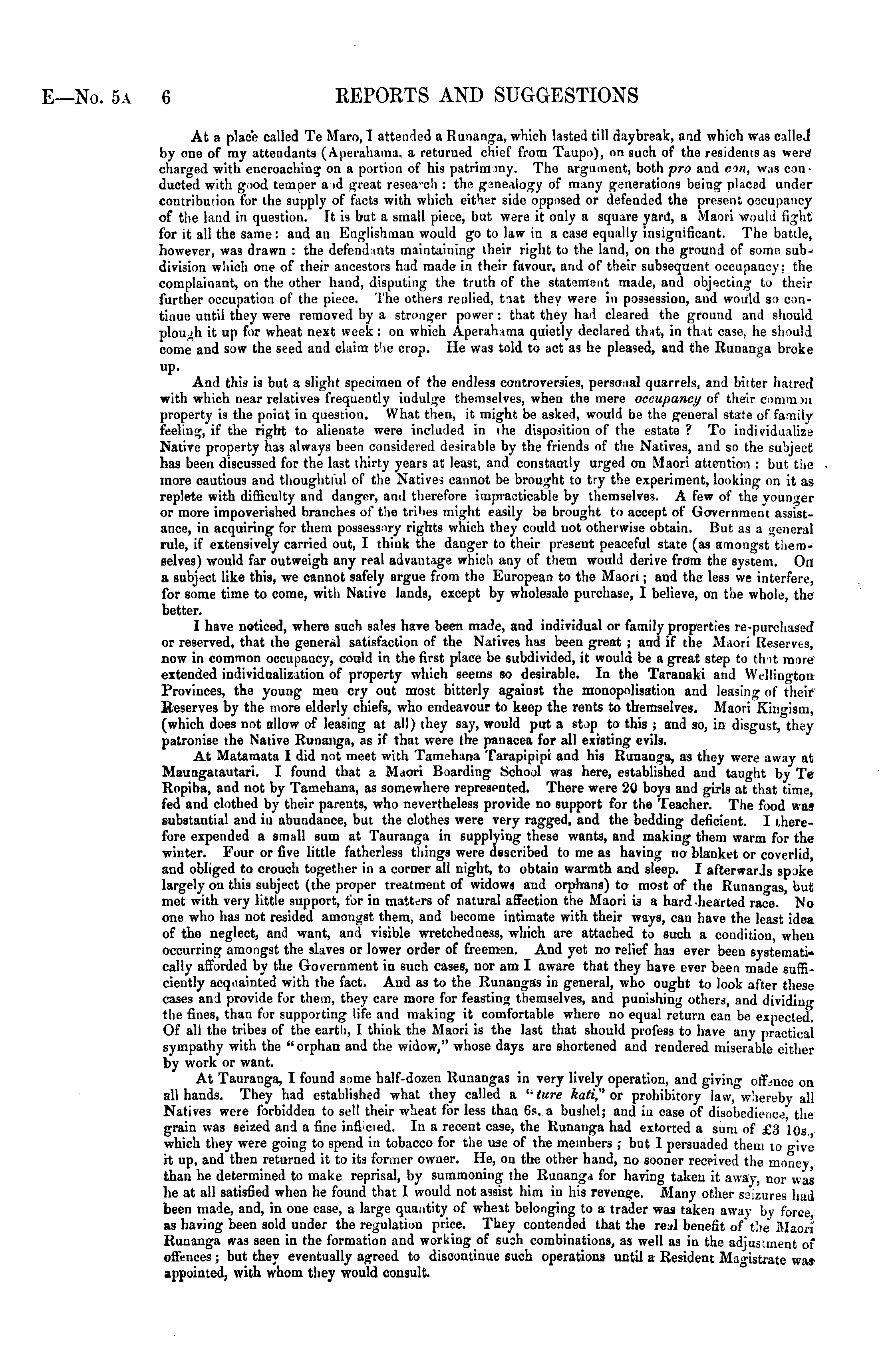 At a place callsd Te Maro, I attended a Runanga, which lasted till daybreak, and which was calleJ by one of my attendants (Aperahaon, a returned chief from Taupo), on such of the residents as werrf charged with encroaching; on a portion of his patrim ray. The argument, both pro and on, w;is conducted with good temper aid great resea-ch : the genealogy of many generations being placsd under contribution for the supply of facts with which either side opposed or defended the present occupancy of the land in question. It is but a small piece, but were it only a square yard, a Maori would fight for it all the same: and an Englishman would go to law in a case equally insignificant. The battle, however, was drawn : the defendants maintaining their right to the land, on the ground of some subdivision which one of their ancestors had made in their favour, and of their subsequent occupancy: the complainant, on the other hand, disputing the truth of the statement made, and objecting to their further occupation of the piece. The others reulied, tiat they were in possession, and would so continue until they were removed by a stronger power : that they hail cleared the ground and should plough it up for wheat next week : on which Aperahtma quietly declared thit, in that case, he should come and sow the seed and claim the crop. He was told to act as he pleased, and the Runan^a broke up. And this is but a slight specimen of the endless controversies, personal quarrels, and bitter hatred with which near relatives frequently indulge themselves, when the mere occupancy of their c:>mm »v property is the point in question. What then, it might be asked, would be the general state of family feeling, if the right to alienate were included in ihe disposition of the estate ? To individualize Native property has always been considered desirable by the friends of the Natives, and so the subject has been discussed for the last thirty years at least, and constantly urged on Maori attention : but tiie more cautious and thoughtful of the Natives cannot be brought to try the experiment, looking on it as replete with difficulty and danger, and therefore impracticable by themselves. A few of the younger or more impoverished branches of t!ie tri'ies might easily be brought to accept of Government assistance, in acquiring for them possess >ry rights which they could not otherwise obtain. But as a general rule, if extensively carried out, I think the danger to their present peaceful state (as amongst themselves) would far outweigh any real advantage which any of them would derive from the system. On a subject like this, we cannot safely argue from the European to the Maori; and the less we interfere, for some time to come, with Native lands, except by wholesale purchase, I believe, on the whole, the better. I have noticed, where such sales have been made, and individual or family properties re-purchased or reserved, that the general satisfaction of the Natives has been great ; and if the Maori Reserves, now in common occupancy, could in the first place be subdivided, it would be a great step to thit more extended individualizition of property which seems so desirable. In the Taranaki and Wellingtotr Provinces, the young men cry out most bitterly against the monopolisation and leasing of their Keserves by the more elderly chiefs, who endeavour to keep the rents to themselves. Maori Kingism, (which does not allow of leasing at all) they say, would put a stop to this ; and so, in disgust, they patronise the Native Runanga, as if that were the panacea for all existing evils. At Mataraata I did not meet with Tamehana Tarapipipi and his Runanga, as they were away at Maungatautari. I found that a Maori Boarding Schojl was here, established and taught by Te Ropiba, and not by Tamehana, as somewhere represented. There were 20 boys and girls at that time, fed and clothed by their parents, who nevertheless provide no support for the Teacher. The food was substantial and in abundance, but the clothes were very ragged, and the bedding deficient. I therefore expended a small sum at Tauranga in supplying these wants, and making them warm for the winter. Four or five little fatherless things were described to me as having no blanket or coverlid, and obliged to crouch together in a corner all night, to obtain warmth and sleep. I afterwards spoke largely on this subject (the proper treatment of widows and orphans) to most of the Runangas, but met with very little support, tor in matters of natural affection the Maori i 3 a hard hearted race. No one who has not resided amongst them, and become intimate with their ways, can have the least idea of the neglect, and want, and visible wretchedness, which are attached to such a condition, when occurring amongst the slaves or lower order of freemen. And yet no relief has ever been systematically afforded by the Government in such cases, nor am I aware that they have ever been made sufficiently acquainted with the fact. And as to the Runangas in general, who ought to look after these cases and provide for them, they care more for feasting themselves, and punishing others, and dividing the fines, than for supporting life and making it comfortable where no equal return can be expected. Of all the tribes of the earth, I think the Maori is the last that should profess to have any practical sympathy with the "orphan and the widow," whose days are shortened and rendered miserable either by work or want. At Tauranga, I found some half-dozen Runangas in very lively operation, and giving offence on all hands. They had established what they called a " ture kati," or prohibitory law, whereby all Natives were forbidden to sell their wheat for less than 6s. a bushel; and in case of disobedience the grain was seized and a fine inflected. In a recent case, the Runanga had extorted a sum of £3 JOs which they were going to spend in tobacco for the use of the members ; but 1 persuaded them to give it up, and then ret