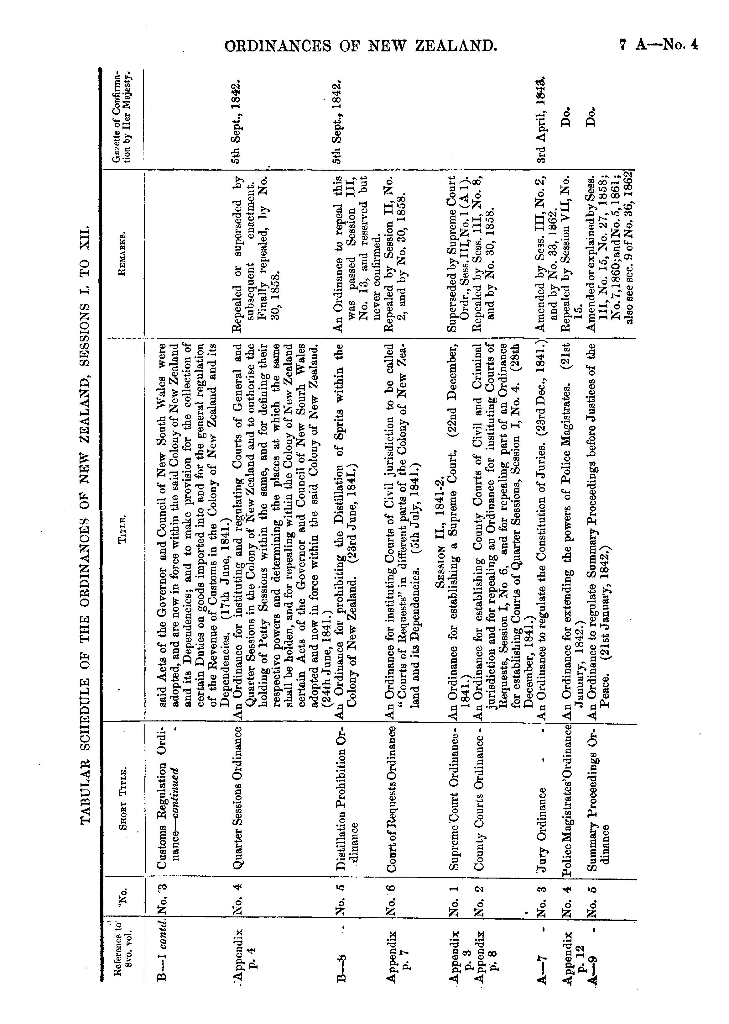 TABULAR SCHEDULE OF THE ORDINANCES OP NEW ZEALAND, SESSIONS I. TO XII. Kcfrrcnce to 8vo. vol. 'No. Short Titlk. Title. Eemabks. Gazette of Confirmation by Her Majesty. B— 1 conld. Appendix p. 4 No. 3 No. 4 Customs Eegulation Ordinance — continued Quarter Sessions Ordinance said Acts of the Governor and Council of New South Wales were adopted, and are now in force within the said Colony of New Zealand and its Dependencies; and to make provision for the collection of certain Duties on goods imported into and for the general regulation of the Revenue of Customs in the Colony of New Zealand and its Dependencies. (17th June, 1841.) An Ordinance for instituting and regulating Courts of General and Quarter Sessions in the Colony of New Zealand and to outhorise the holding of Petty Sessions within the same, and for defining their respective powers and determining the places at which the same shall be holden, and for repealing within the Colony of New Zealand certain Acts of the Governor and Council of New Sourh Wales adopted and now in force within the said Colony of New Zealand. (24th June, 1841.) An Ordinance for prohibiting the Distillation of Sprits within the Colony of New Zealand. (23rd June, 1841.) Repealed or superseded by subsequent enactment. Finally repealed, by No. 30, 1858. 5th Sept., 1842. B— 8 - Distillation Prohibition Ordinance An Ordinance to repeal this was passed Session III, No. 13, and reserved but never confirmed. Repealed by Session II, No. 2, and by No. 30, 1858. 5th Sept., 1842, No. 5 Appendix p. 7 No. 6 Court of Requests Ordinance An Ordinance for instituting Courts of Civil jurisdiction to be called " Courts of Requests" in different parts of the Colony of New Zealand and its Dependencies. (5th July, 1841.) Appendix p. 3 Appendix p. 8 Supreme Court Ordinance - Session II., 1841-2. An Ordinance for establishing a Supreme Court. (22nd December, 1841.) An Ordinance for establishing County Courts of Civil and Criminal jurisdiction and for repealing an Ordinance for instituting Courts of Requests, Session I, No 6, and for repealing part of an Ordinance for establishing Courts of Quarter Sessions, Session I, No. 4. (28th December, 1841.) An Ordinance to regulate the Constitution of Juries. (23rd Dec, 1841.) Superseded by Supreme Court Ordr.,Sess.IlLNo.l(Al). Repealed by Sess. Ill, No. 8, and by No. 30, 1858. No. 1 No. 2 County Courts Ordinance - a— 7 - : 1 No. 3 Jury Ordinance Amended by Sess. Ill, No. 2, and by No. 33, 1862. Repealed by Session VII, No. 15. 3rd April, 1S43. Appendix '. p. 12 A— 9 - : No. 4 No. 5 Police Magistrates'Ordinauce Summary Proceedings Ordinance An Ordinance for extending the powers of Police Magistrates. (21st January, 1842.) An Ordinance to regulate Summary Proceedings before Justices of the Peace. (21st January, 1842.) Amended or explained by Sess. Ill, No. 15, No. 27, 1858; No. 7,1860; and No. 5,1861; also see sec. 9 of No. 36, 1862 Do. Do,